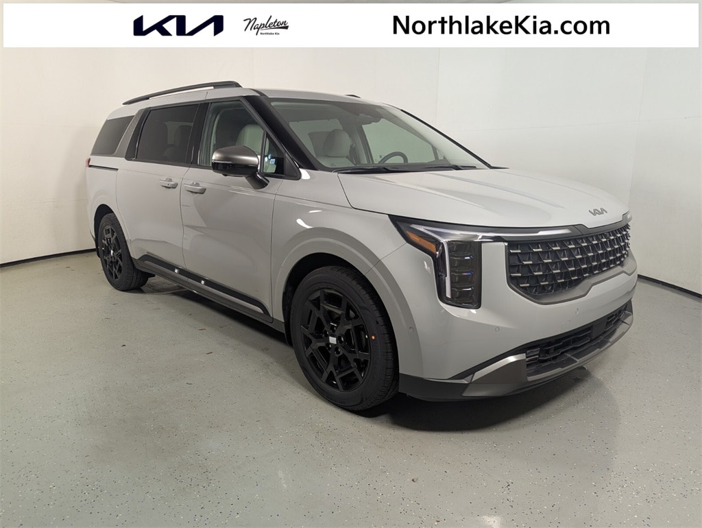 2026 Kia Ceramic Silver Carnival Hybrid 1.6L I4 DGI Hybrid Turbocharged DOHC 16V LEV3-SULEV30 SX Prestige 34/31 City/Highway MPG 1.6L I4 DGI Hybrid Turbocharged DOHC 16V LEV3-SULEV30, 12 Speakers, 3rd row seats: split-bench, 4-Wheel Disc Brakes, ABS brakes, Air Conditioning, Alloy wheels, AM/FM radio: SiriusXM, Apple CarPlay & Android Auto, Auto High-beam Headlights, Auto-dimming Rear-View mirror, Automatic temperature control, Brake assist, Bumpers: body-color, Cargo Mat, Cargo Net, Carpeted Floor Mats (8-Passenger), Compass, Cross Bars, Delay-off headlights, Driver door bin, Driver vanity mirror, Dual front impact airbags, Dual front side impact airbags, Electronic Stability Control, Emergency communication system, Exterior Parking Camera Rear, Four wheel independent suspension, Front anti-roll bar, Front Bucket Seats, Front Center Armrest, Front dual zone A/C, Front fog lights, Front reading lights, Fully automatic headlights, Garage door transmitter: HomeLink, Heads-Up Display, Heated & Ventilated Front Bucket Seats, Heated door mirrors, Heated front seats, Heated steering wheel, Illuminated entry, Knee airbag, Leather Seat Trim, Leather Shift Knob, Leather steering wheel, Low tire pressure warning, Memory seat, Mud Guards, Navigation System, Occupant sensing airbag, Outside temperature display, Overhead airbag, Overhead console, Panic alarm, Passenger door bin, Passenger vanity mirror, Power 2nd-Row Moonroof, Power door mirrors, Power driver seat, Power Liftgate, Power moonroof, Power passenger seat, Power steering, Power windows, Radio: Navigation System w/SiriusXM, Rain sensing wipers, Rear air conditioning, Rear anti-roll bar, Rear reading lights, Rear window defroster, Rear window wiper, Reclining 3rd row seat, Remote keyless entry, Security system, Speed control, Speed-sensing steering, Split folding rear seat, Spoiler, Steering wheel mounted audio controls, Tachometer, Telescoping steering wheel, Tilt steering wheel, Traction control, Trip computer, Turn signal indicator mirrors, Variably intermittent wipers, Ventilated front seats, Wheel Locks, Wheels: 19" Black D-Cut Customizing, 1.6L I4 DGI Hybrid Turbocharged DOHC 16V LEV3-SULEV30. 34/31 City/Highway MPG