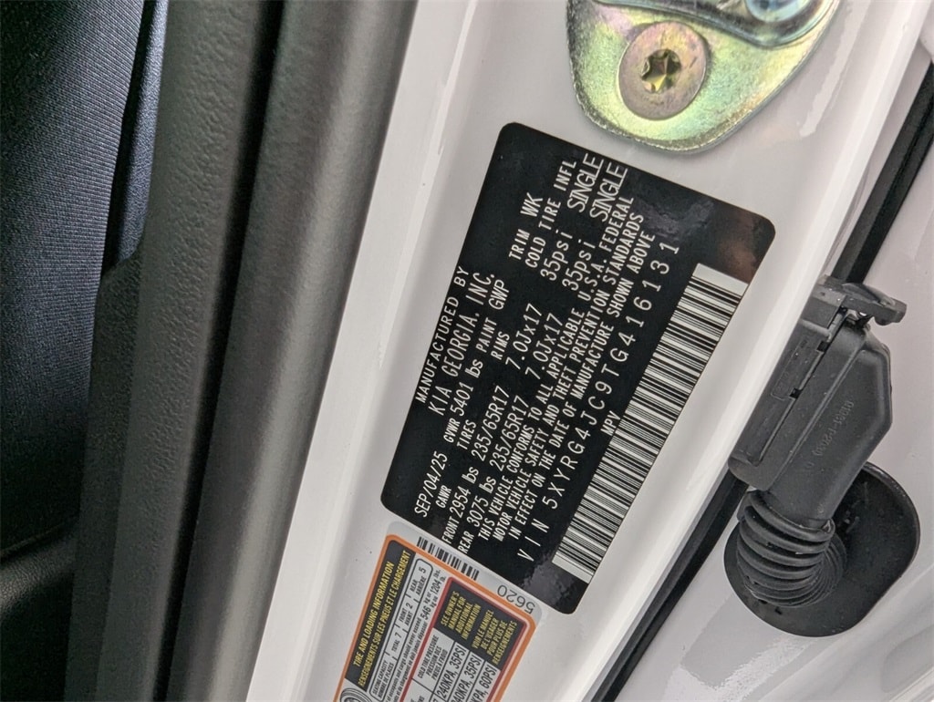 2026 Kia Glacial White Pearl Sorento 2.5L I4 DGI DOHC 16V LEV3-SULEV30 191hp LX 23/31 City/Highway MPG 17" Alloy Wheels, 3rd row seats: split-bench, 4-Wheel Disc Brakes, 6 Speakers, ABS brakes, Air Conditioning, Alloy wheels, AM/FM radio: SiriusXM, Apple CarPlay & Android Auto, Auto High-beam Headlights, Auto-Dimming Mirror w/HomeLink, Brake assist, Bumpers: body-color, Carpeted Floor Mats, Cloth Seat Trim, Delay-off headlights, Driver door bin, Driver vanity mirror, Dual front impact airbags, Dual front side impact airbags, Electronic Stability Control, Emergency communication system: 911 Connect, Exterior Parking Camera Rear, Four wheel independent suspension, Front anti-roll bar, Front Bucket Seats, Front Center Armrest, Front reading lights, Fully automatic headlights, Heated door mirrors, Illuminated entry, Knee airbag, Leather Shift Knob, Leather steering wheel, Low tire pressure warning, Occupant sensing airbag, Outside temperature display, Overhead airbag, Overhead console, Panic alarm, Passenger door bin, Passenger vanity mirror, Power door mirrors, Power steering, Power windows, Radio data system, Radio: AM/FM Standard Sound System, Rear anti-roll bar, Rear reading lights, Rear seat center armrest, Rear side impact airbag, Rear window defroster, Rear window wiper, Remote keyless entry, Security system, Speed control, Speed-sensing steering, Split folding rear seat, Spoiler, Steering wheel mounted audio controls, Tachometer, Telescoping steering wheel, Tilt steering wheel, Traction control, Trip computer, Turn signal indicator mirrors, Variably intermittent wipers. 23/31 City/Highway MPG