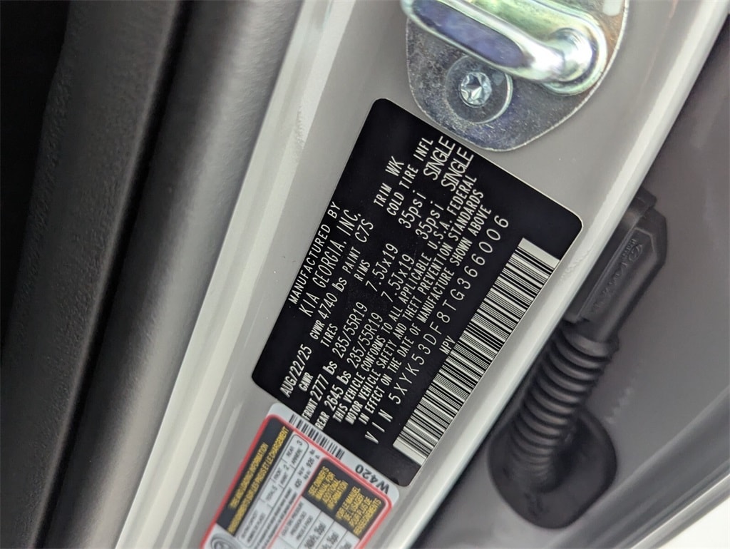 Features:4-Wheel Disc Brakes, 8 Speakers, ABS brakes, Air Conditioning, Alloy wheels, AM/FM radio: SiriusXM, Auto High-beam Headlights, Auto-Dimming Mirror w/HomeLink, Automatic temperature control, Brake assist, Bumpers: body-color, Carpeted Floor Mats, Compass, Delay-off headlights, Driver door bin, Driver vanity mirror, Dual front impact airbags, Dual front side impact airbags, Electronic Stability Control, Emergency communication system: Kia Connect (includes 1 year free trial), Four wheel independent suspension, Front anti-roll bar, Front Bucket Seats, Front Center Armrest, Front dual zone A/C, Front fog lights, Front reading lights, Fully automatic headlights, harman/kardon® Speakers, Heated & Ventilated Front Bucket Seats, Heated door mirrors, Heated front seats, Heated steering wheel, Illuminated entry, Leather Shift Knob, Leather steering wheel, Low tire pressure warning, Memory seat, Navigation System, Occupant sensing airbag, Outside temperature display, Overhead airbag, Overhead console, Panic alarm, Passenger door bin, Passenger vanity mirror, Power door mirrors, Power driver seat, Power Liftgate, Power moonroof, Power passenger seat, Power steering, Power windows, Radio: AM/FM/HD Premium Audio System, Rain sensing wipers, Rear anti-roll bar, Rear reading lights, Rear seat center armrest, Rear side impact airbag, Rear window defroster, Rear window wiper, Remote keyless entry, Security system, Speed control, Speed-sensing steering, Split folding rear seat, Spoiler, Steering wheel mounted audio controls, SynTex Premium Leatherette Seat Trim, Tachometer, Telescoping steering wheel, Tilt steering wheel, Traction control, Trip computer, Turn signal indicator mirrors, Variably intermittent wipers, Ventilated front seats, and Wheels: 19" x 7.5J Alloy. Dealer Discount of $1,164 off MSRP