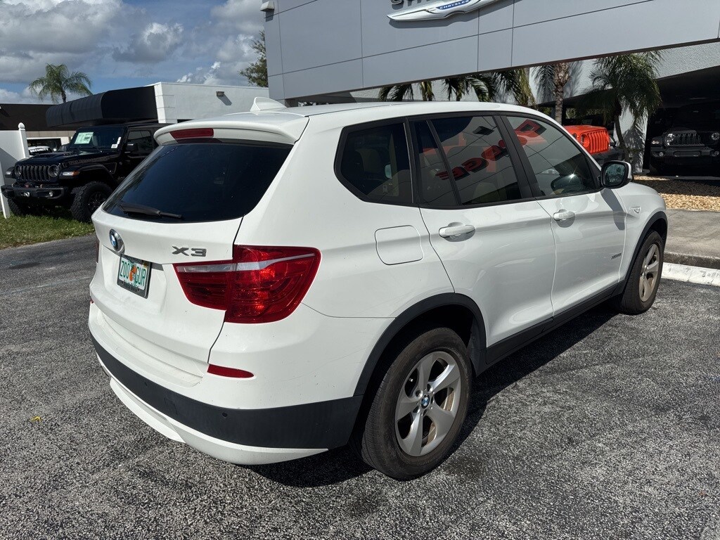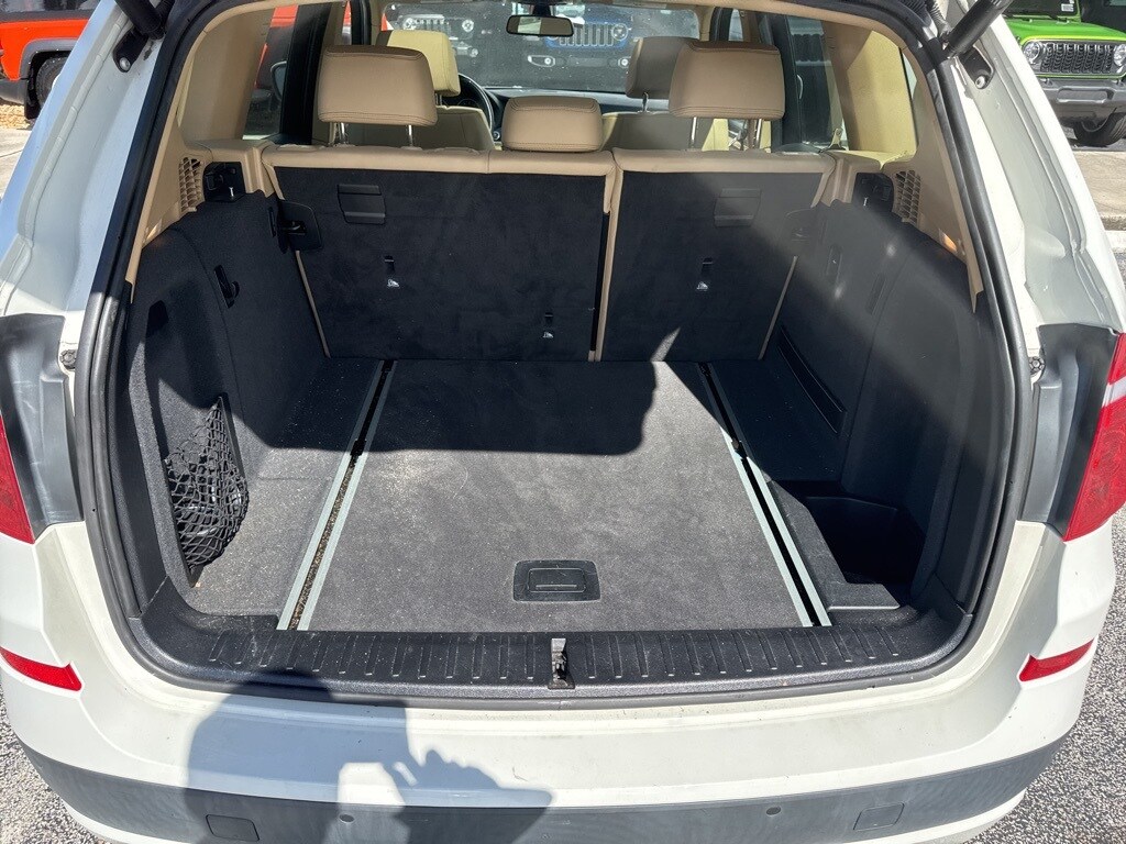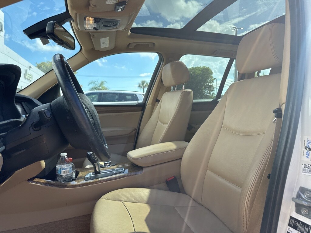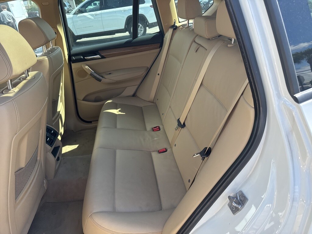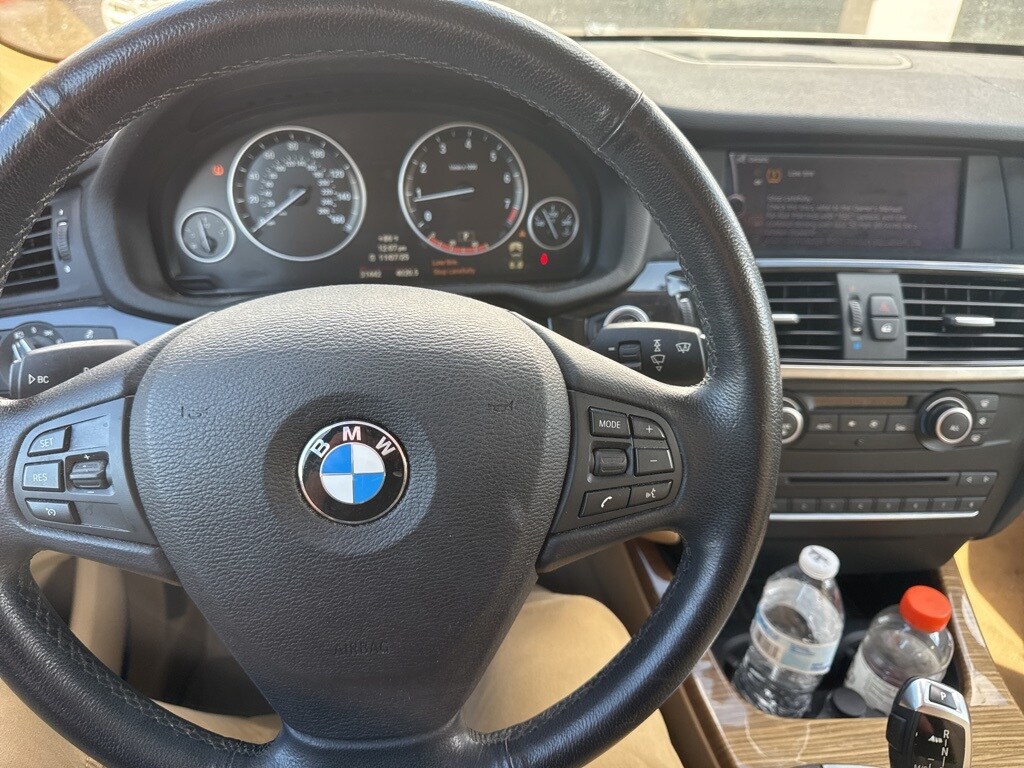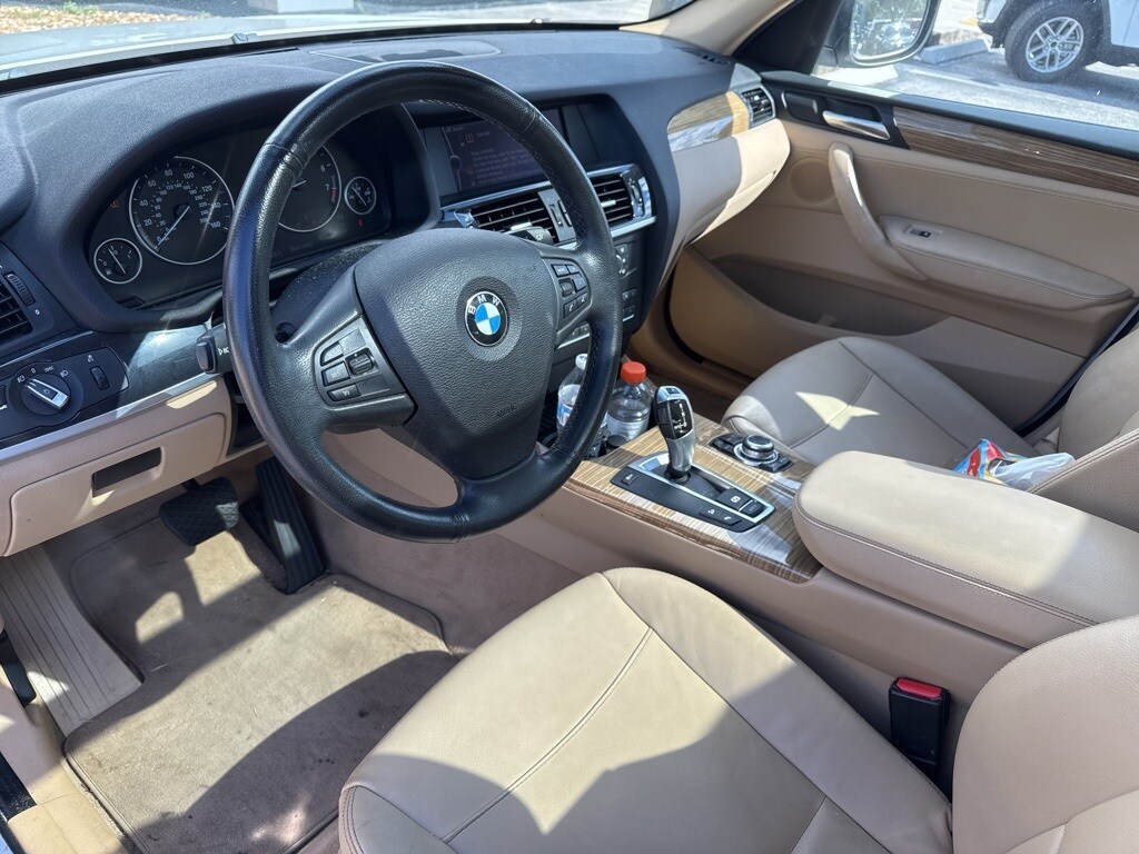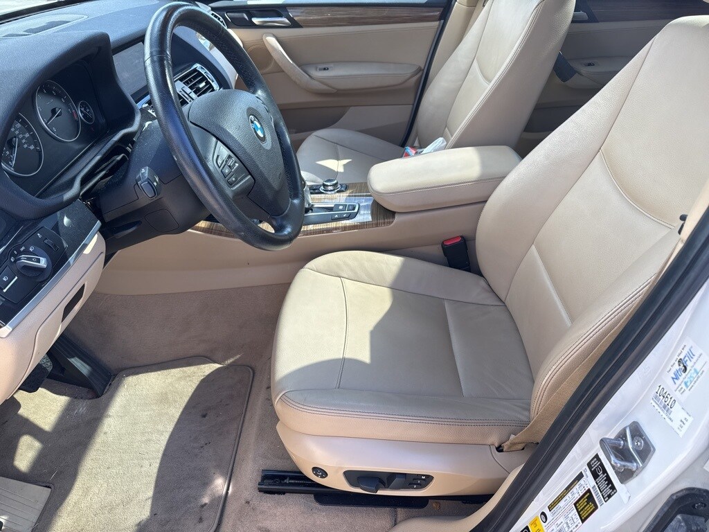 This X3 is well equipped with Storage Package, 8-Speed Automatic Steptronic, 12 Speakers, 17" x 8.0" Star Spoke (Style 306) Wheels, 3.727 Axle Ratio, 4-Way Lumbar Support for Front Seats, 4-Wheel Disc Brakes, ABS brakes, Air Conditioning, Alloy wheels, AM/FM radio, Ambiance Lighting, Anti-Theft AM/FM Stereo/CD/MP3 Audio System, Anti-whiplash front head restraints, Auto-Dimming Interior & Exterior Mirrors, Auto-Dimming Rear-View Mirror, Automatic temperature control, BMW Assist w/Enhanced Bluetooth® & USB, BMW Universal Garage-Door Opener, Bodyside moldings, Brake assist, Bumpers: body-color, CD player, Delay-off headlights, Driver door bin, Driver vanity mirror, Dual front impact airbags, Dual front side impact airbags, Electronic Stability Control, Fineline Sienna Wood Trim, Four wheel independent suspension, Front & Rear Park Distance Control (PDC), Front anti-roll bar, Front Bucket Seats, Front Center Armrest, Front dual zone A/C, Front fog lights, Front reading lights, Fully automatic headlights, Fully Automatic Panoramic Moonroof, Hard-Drive-Based Navigation System, Illuminated entry, Leather steering wheel, Leatherette Upholstery, Low tire pressure warning, Memory seat, Occupant sensing airbag, Online Information Services, Outside temperature display, Overhead airbag, Panic alarm, Passenger door bin, Passenger vanity mirror, Power door mirrors, Power driver seat, Power passenger seat, Power steering, Power Tailgate, Power windows, Radio data system, Rain sensing wipers, Real Time Traffic Information, Rear anti-roll bar, Rear fog lights, Rear reading lights, Rear seat center armrest, Rear window defroster, Rear window wiper, Rear-View Camera w/Top View, Remote keyless entry, Security system, SIRIUS Satellite Radio, Speed control, Speed-sensing steering, Speed-Sensitive Wipers, Split folding rear seat, Spoiler, Steering wheel mounted audio controls, Tachometer, Telescoping steering wheel, Tilt steering wheel, Traction control, Trip computer, and Variably intermittent wipers.