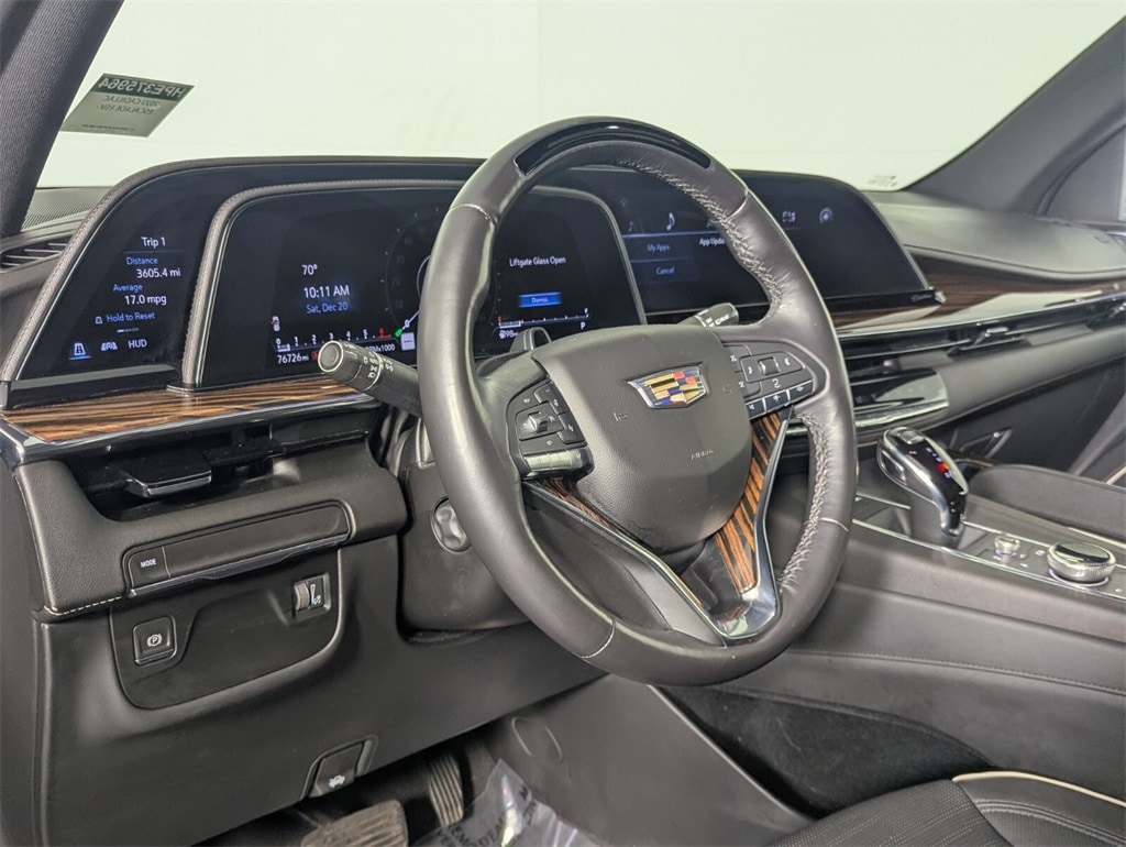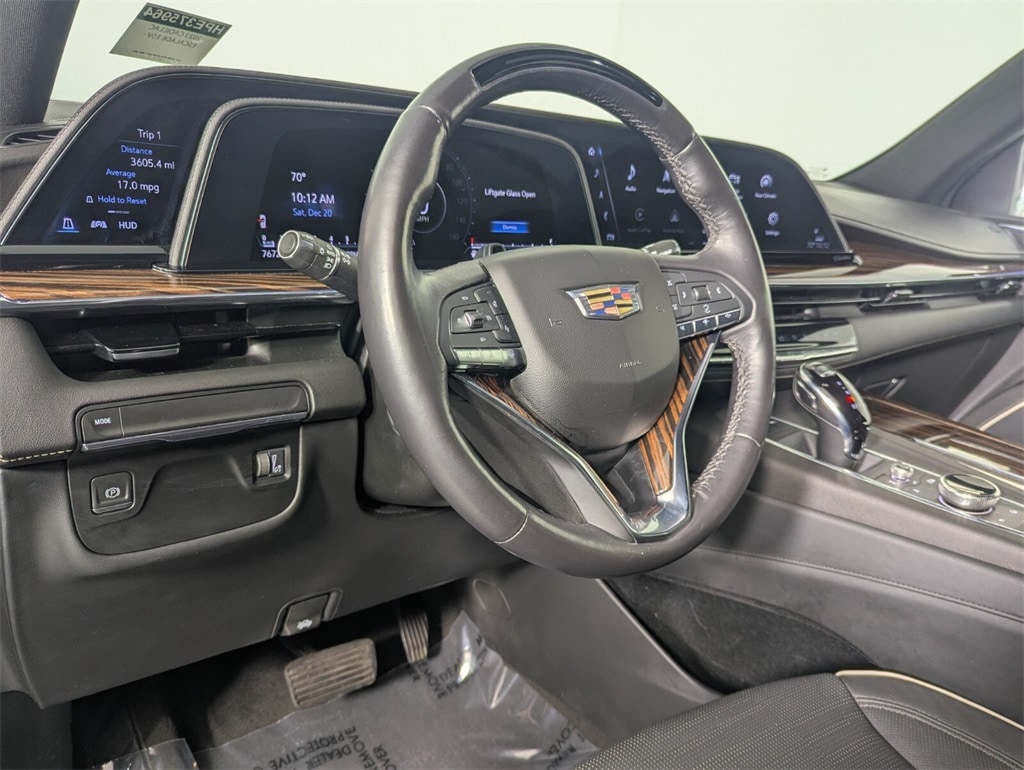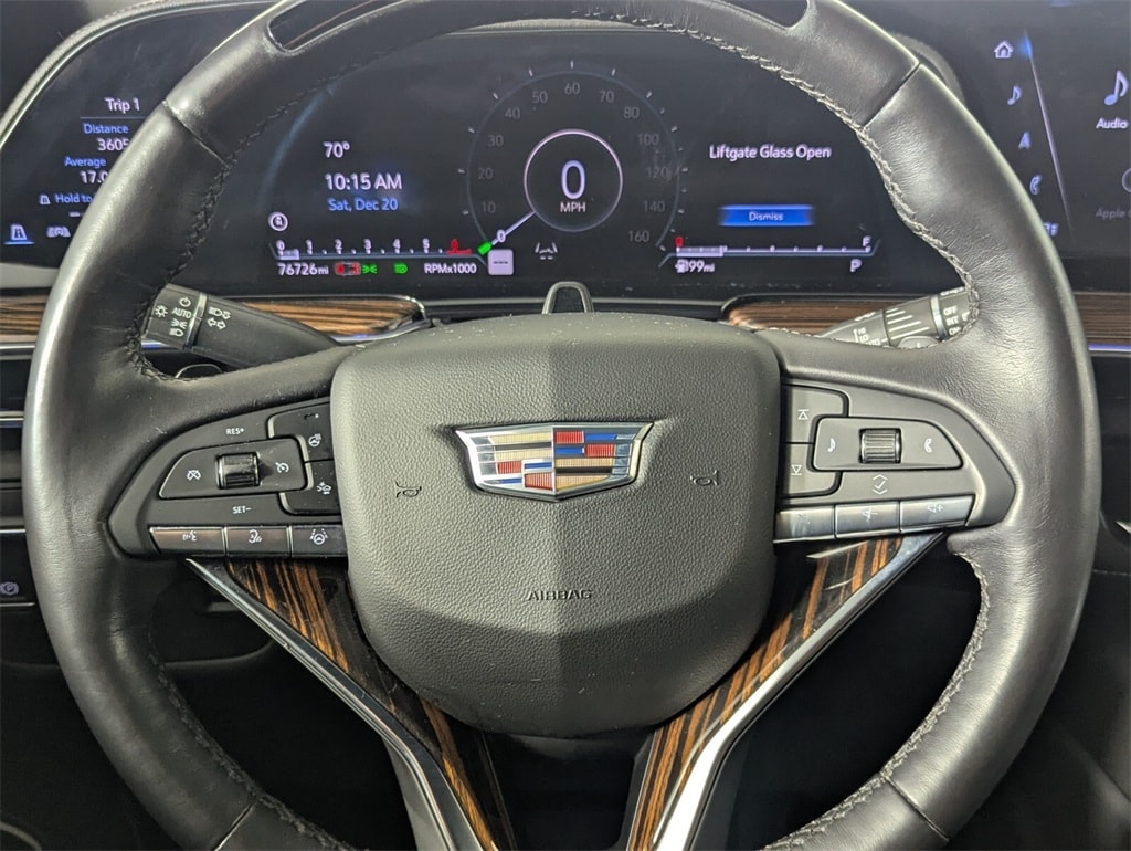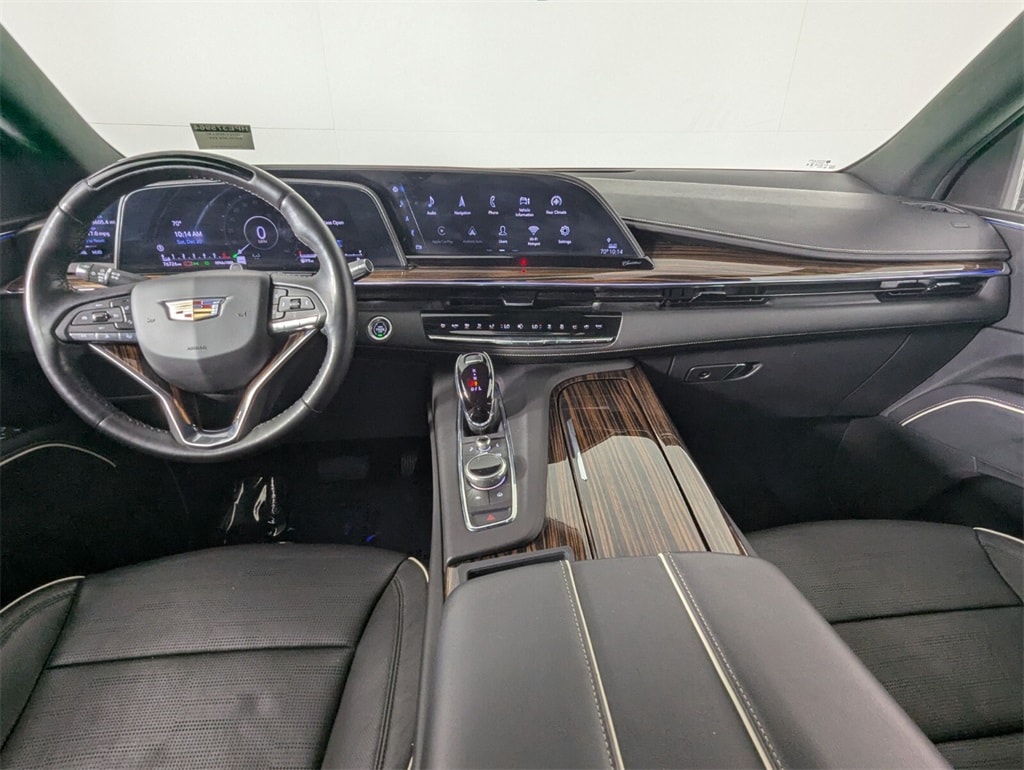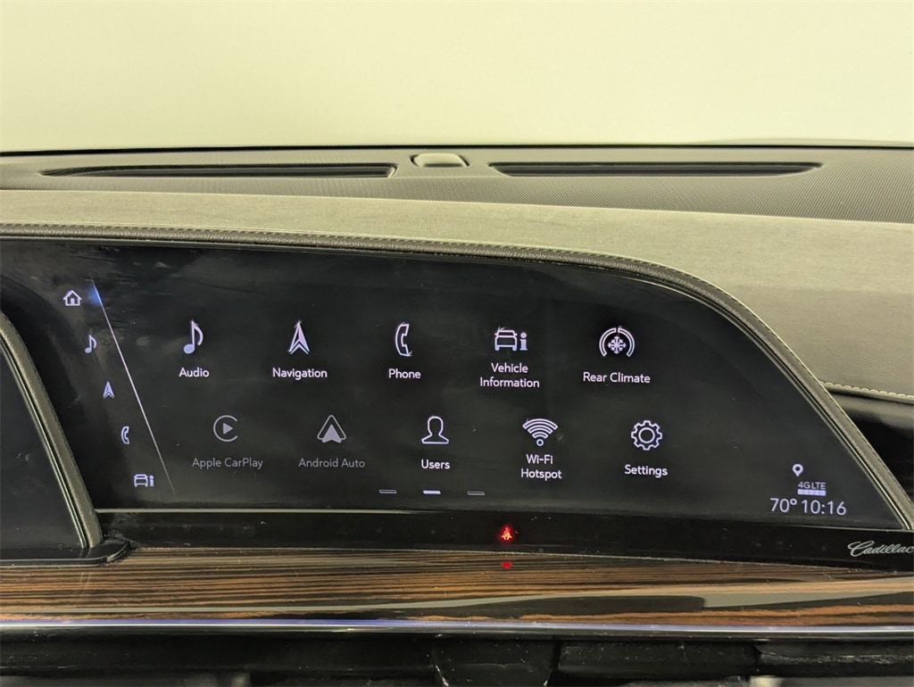 Features: 16.9" Diagonal OLED Infotainment Screen, 19 Speakers, 2-Presets Memory For Driver Seat Adjuster, 3.23 Axle Ratio, 3rd row seats: split-bench, 4-Way Power Driver Lumbar Seat Adjuster, 4-Way Power Front Passenger Lumbar Seat Adjuster, 4-Wheel Disc Brakes, 8-Way Power Driver Seat Adjuster, 8-Way Power Front Passenger Seat Adjuster, ABS brakes, Adaptive Cruise Control, Air Conditioning, AKG Studio 19-Speaker Audio System, Alloy wheels, AM/FM radio: SiriusXM with 360L, Apple CarPlay/Android Auto, Audio memory, Auto High-beam Headlights, Auto tilt-away steering wheel, Auto-dimming door mirrors, Auto-dimming Rear-View mirror, Automatic Seat Belt Tightening, Automatic temperature control, Brake assist, Bumpers: body-color, Compass, Delay-off headlights, Door Lock & Latch Shields, Driver door bin, Driver vanity mirror, Dual front impact airbags, Dual front side impact airbags, Electronic Stability Control, Emergency communication system: OnStar and Cadillac connected services capable, Enhanced Automatic Emergency Braking, Enhanced Automatic Parking Assist, Exterior Parking Camera Rear, Four wheel independent suspension, Front anti-roll bar, Front Bucket Seats, Front Center Armrest w/Storage, Front dual zone A/C, Front reading lights, Fully automatic headlights, Garage door transmitter, Glass Breakage Sensor, HD Radio, Heads-Up Display, Heated & Ventilated Driver & Front Passenger Seats, Heated door mirrors, Heated Driver & Front Passenger Seats, Heated front seats, Heated rear seats, Heated steering wheel, Illuminated entry, Lane Change Alert w/Side Blind Zone Alert, Leather Seating Surfaces w/Mini-Chevron Perf Inserts, Low tire pressure warning, Mechanical Limited-Slip Differential, Memory seat, Navigation System, Occupant sensing airbag, Outside temperature display, Overhead airbag, Overhead console, Panic alarm, Passenger door bin, Passenger vanity mirror, Power door mirrors, Power driver seat, Power Liftgate, Power moonroof, Power Panoramic Tilt-Sliding Sunroof, Power passenger seat, Power steering, Power windows, Premium Smooth Ride Suspension, Radio data system, Radio: AM/FM w/Navigation, Rain sensing wipers, Rear air conditioning, Rear anti-roll bar, Rear Camera Mirror, Rear Camera Mirror Washer, Rear Cross Traffic Alert, Rear reading lights, Rear window defroster, Rear window wiper, Reconfigurable Full-Color Head-Up Display, Remote keyless entry, Reverse Automatic Braking, Running Board Assist Steps, Security system, SiriusXM w/360L, Speed control, Split folding rear seat, Spoiler, Steering wheel memory, Steering wheel mounted audio controls, Tachometer, Teen Driver, Telescoping steering wheel, Theft-Deterrent Alarm System, Tilt steering wheel, Traction control, Trip computer, Turn signal indicator mirrors, Variably intermittent wipers, Vehicle Inclination Sensor, Vehicle Interior Movement Sensor, Ventilated front seats, Voltmeter, Wheels: 22" 14-Spoke Alloy w/Polished Finish, and Wireless Apple CarPlay/Wireless Android Auto.