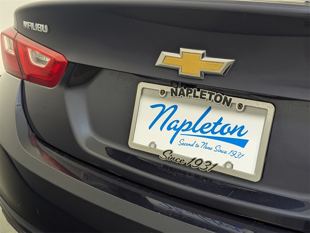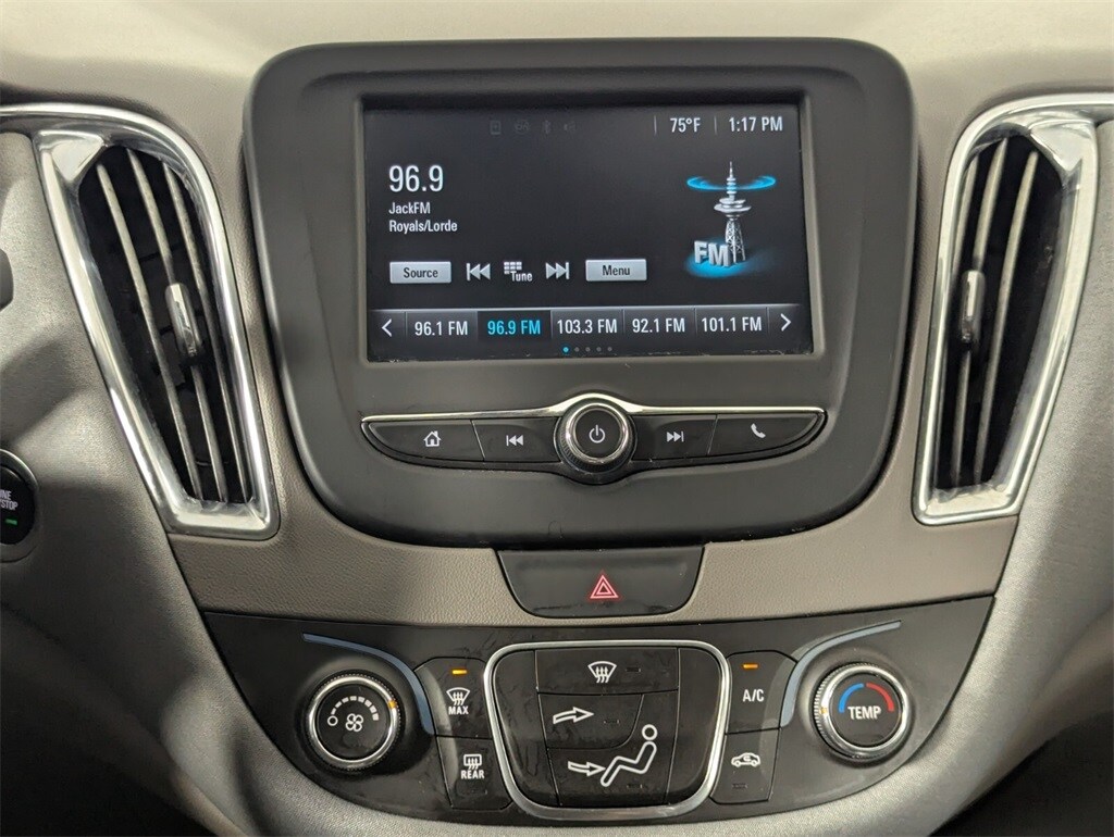 This Malibu is well equipped with Preferred Equipment Group 1LT, Dark Atmosphere/Medium Ash Gray Cloth, 17" Aluminum Wheels, 4-Wheel Disc Brakes, 6 Speakers, 8-Way Power Driver Seat Adjuster, ABS brakes, Air Conditioning, Alloy wheels, AM/FM radio: SiriusXM, Apple CarPlay/Android Auto, Brake assist, Bumpers: body-color, Compass, Delay-off headlights, Driver door bin, Driver vanity mirror, Dual front impact airbags, Dual front side impact airbags, Electronic Stability Control, Emergency communication system: OnStar, Exterior Parking Camera Rear, Four wheel independent suspension, Front anti-roll bar, Front Bucket Seats, Front Center Armrest w/Storage, Front License Plate Bracket, Front Passenger 6-Way Manual Seat Adjuster, Front reading lights, Fully automatic headlights, Heated door mirrors, Illuminated entry, Knee airbag, Low tire pressure warning, Occupant sensing airbag, Outside temperature display, Overhead airbag, Overhead console, Panic alarm, Passenger door bin, Passenger vanity mirror, Power door mirrors, Power Driver Lumbar Control Seat Adjuster, Power driver seat, Power steering, Power windows, Premium Cloth Seat Trim, Radio data system, Radio: AM/FM Stereo w/Seek-and-Scan/Digital Clock, Rear anti-roll bar, Rear reading lights, Rear seat center armrest, Rear side impact airbag, Rear window defroster, Remote keyless entry, Security system, SiriusXM Satellite Radio, Speed control, Split folding rear seat, Steering wheel mounted audio controls, Tachometer, Telescoping steering wheel, Tilt steering wheel, Traction control, Trip computer, Turn signal indicator mirrors, and Variably intermittent wipers.