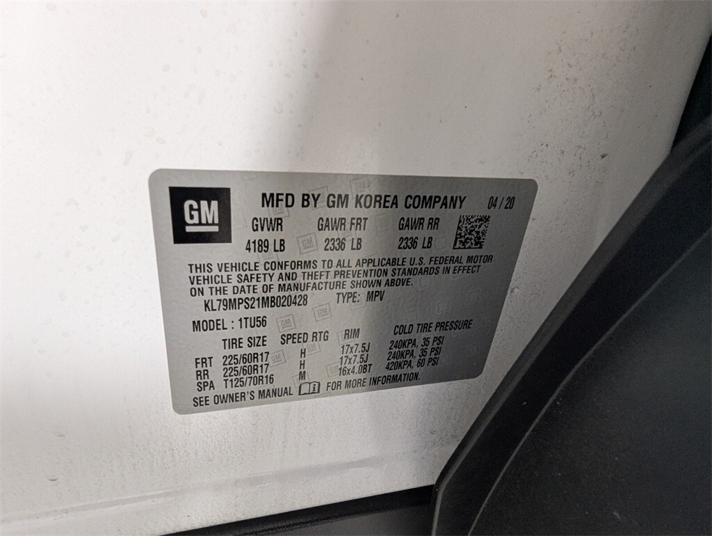 2021 Chevrolet TrailBlazer LT Beautifully finished in Summit White with Jet Black/Medium Ash Gray Artificial Leather interior. 1.2L Ecotec Turbo DOHC DI w/VVT 4D Sport Utility FWD CVT 1 Type-A & 1 Type-C USB Charging-Only Ports, 120-Volt Power Outlet, 2-Way Power Driver Lumbar Seat Adjuster, 4-Way Manual Front Passenger Seat Adjuster, 4-Wheel Disc Brakes, 5.45 Axle Ratio, 6 Speakers, 6-Speaker Audio System Feature, 8-Way Power Driver Seat Adjuster, 8" Diagonal Color Touchscreen Display, ABS brakes, Air Conditioning, Alloy wheels, AM/FM radio, Apple CarPlay/Android Auto, Auto High-beam Headlights, Brake assist, Bumpers: body-color, Cabin Humidity Sensor, Cloth Seat Trim, Compass, Convenience Package, Delay-off headlights, Driver & Front Passenger Illuminated Vanity Mirrors, Driver Confidence Package, Driver door bin, Driver vanity mirror, Dual front impact airbags, Dual front side impact airbags, Electronic Stability Control, Emergency communication system: OnStar and Chevrolet connected services capable, Exterior Parking Camera Rear, Flat-Folding Front Passenger Seatback, Front anti-roll bar, Front Bucket Seats, Front Center Armrest, Front fog lights, Front License Plate Bracket, Front reading lights, Front wheel independent suspension, Fully automatic headlights, Heated door mirrors, Heated Driver & Front Passenger Seats, Heated front seats, Illuminated entry, Inside Rear-View Auto-Dimming Mirror, Knee airbag, Lane Change Alert w/Side Blind Zone Alert, Leather-Wrapped 3-Spoke Steering Wheel, Leather-Wrapped Shift Knob, Leatherette Seat Trim, Low tire pressure warning, Occupant sensing airbag, Overhead airbag, Overhead console, Panic alarm, Passenger door bin, Passenger vanity mirror, Power door mirrors, Power driver seat, Power steering, Power windows, Preferred Equipment Group 1LT, Premium Seating Package, Radio data system, Radio: Chevrolet Infotainment 3 System, Rear Center Armrest, Rear Cross Traffic Alert, Rear Park Assist, Rear side impact airbag, Rear window defroster, Rear window wiper, Remote keyless entry, Ride & Handling Suspension, Roof rack: rails only, Security system, Single-Zone Auto Climate Control Air Conditioning, SiriusXM Radio, Speed control, Split folding rear seat, Spoiler, Steering wheel mounted audio controls, Tachometer, Telescoping steering wheel, Tilt steering wheel, Traction control, Trip computer, Variably intermittent wipers, Wheels: 17" High Gloss Black Machined Aluminum, Wireless Apple CarPlay/Android Auto. Clean CARFAX. Priced below KBB Fair Purchase Price! 28/31 City/Highway MPG