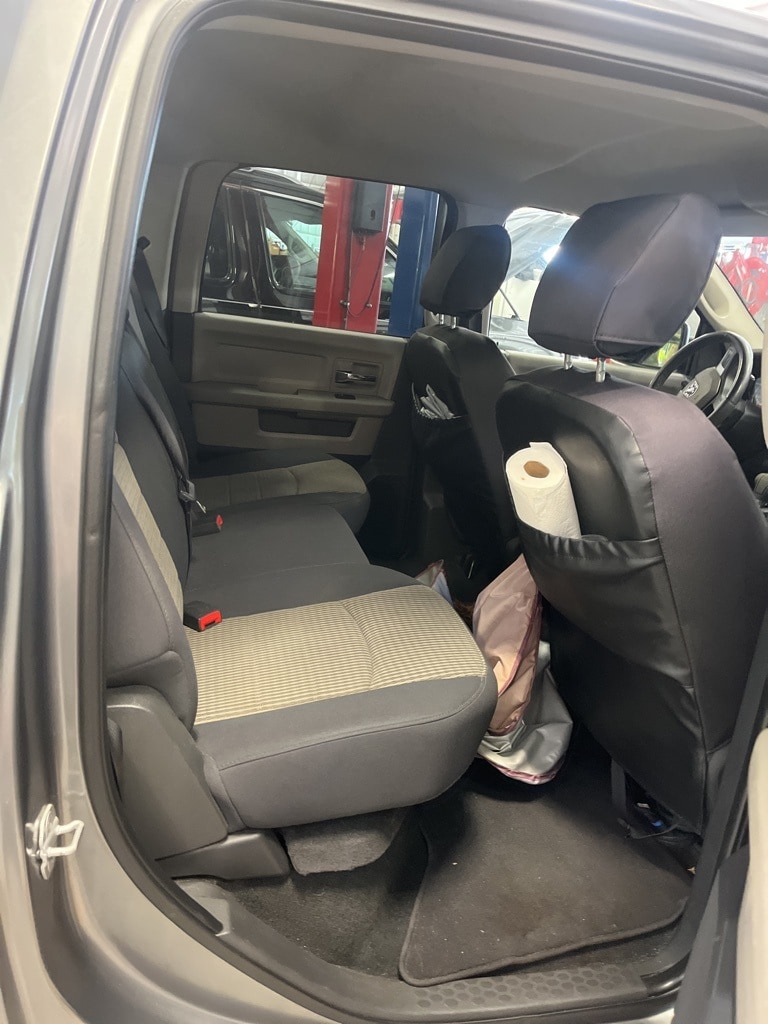 This 1500 is well equipped with 4-Wheel Disc Brakes, 40/20/40 Split Bench Seat, 6 Speakers, ABS brakes, Air Conditioning, Black Exterior Mirrors, Brake assist, CD player, Delay-off headlights, Driver door bin, Dual front impact airbags, Electronic Stability Control, Exterior Mirrors w/Heating Element, Front anti-roll bar, Front wheel independent suspension, Fully automatic headlights, Heated door mirrors, Heavy-Duty Engine Cooling, Low tire pressure warning, Next Generation Engine Controller, Overhead airbag, Passenger door bin, Power door mirrors, Power steering, Power windows, Radio: Media Center 130 CD/MP3, Rear anti-roll bar, Rear seat center armrest, Rear step bumper, Tachometer, Tilt steering wheel, Traction control, Variably intermittent wipers, and Voltmeter.