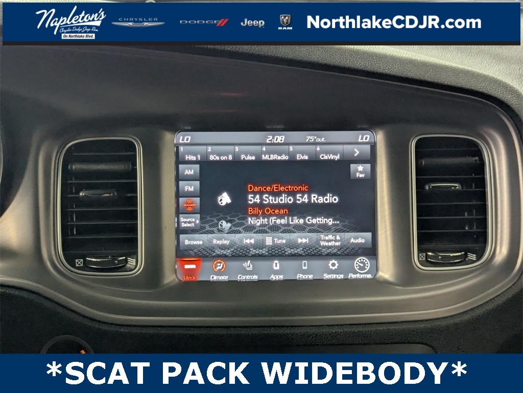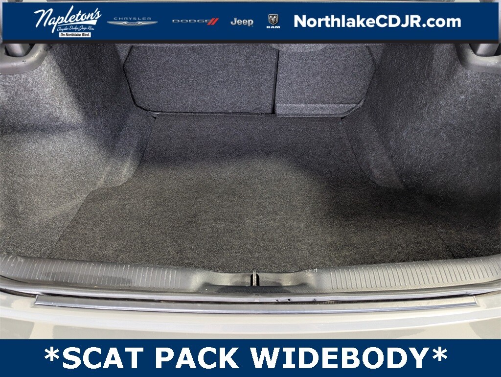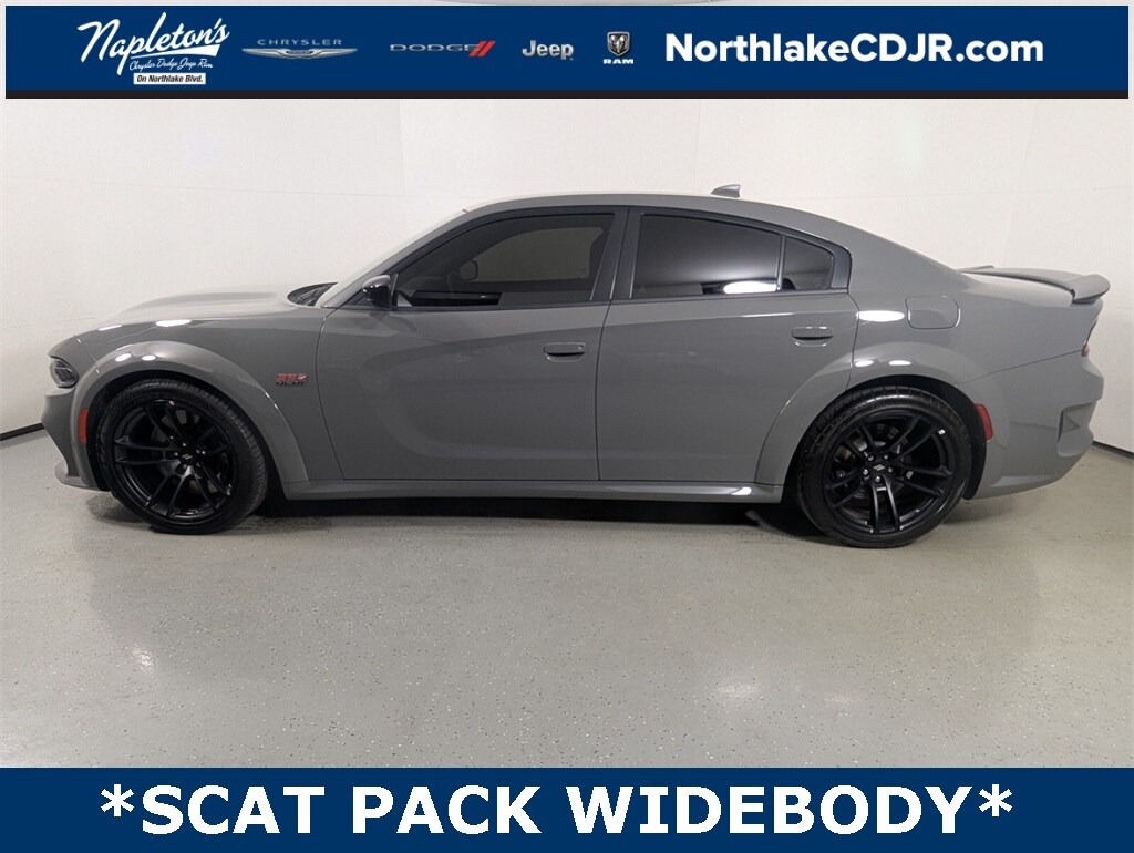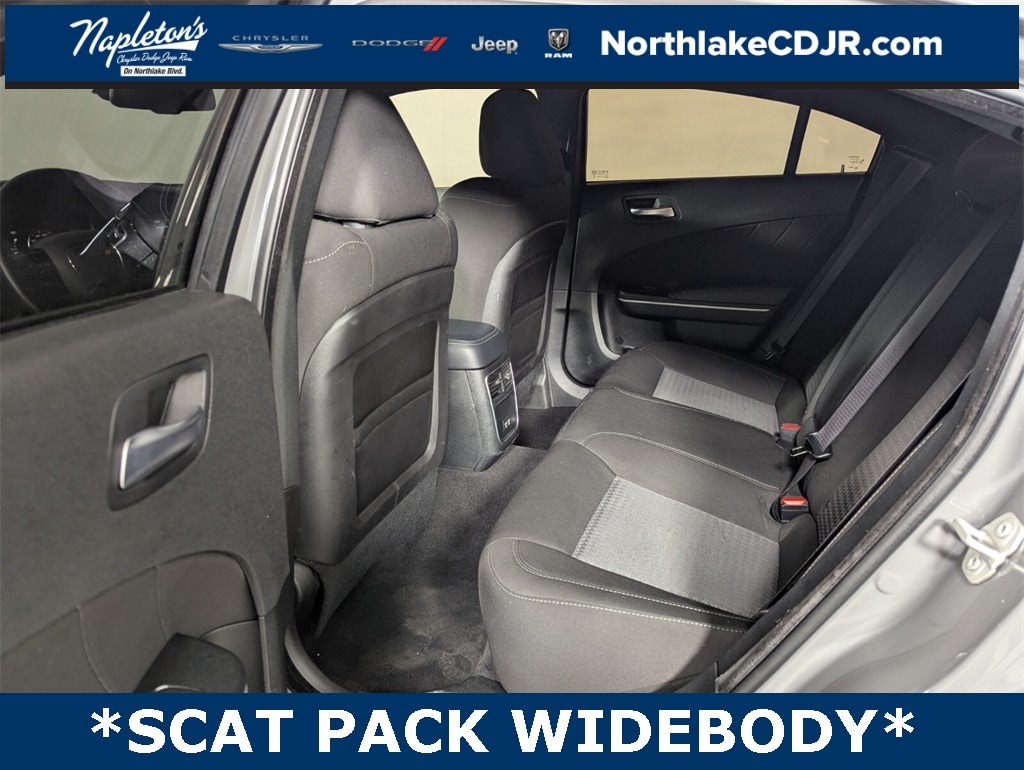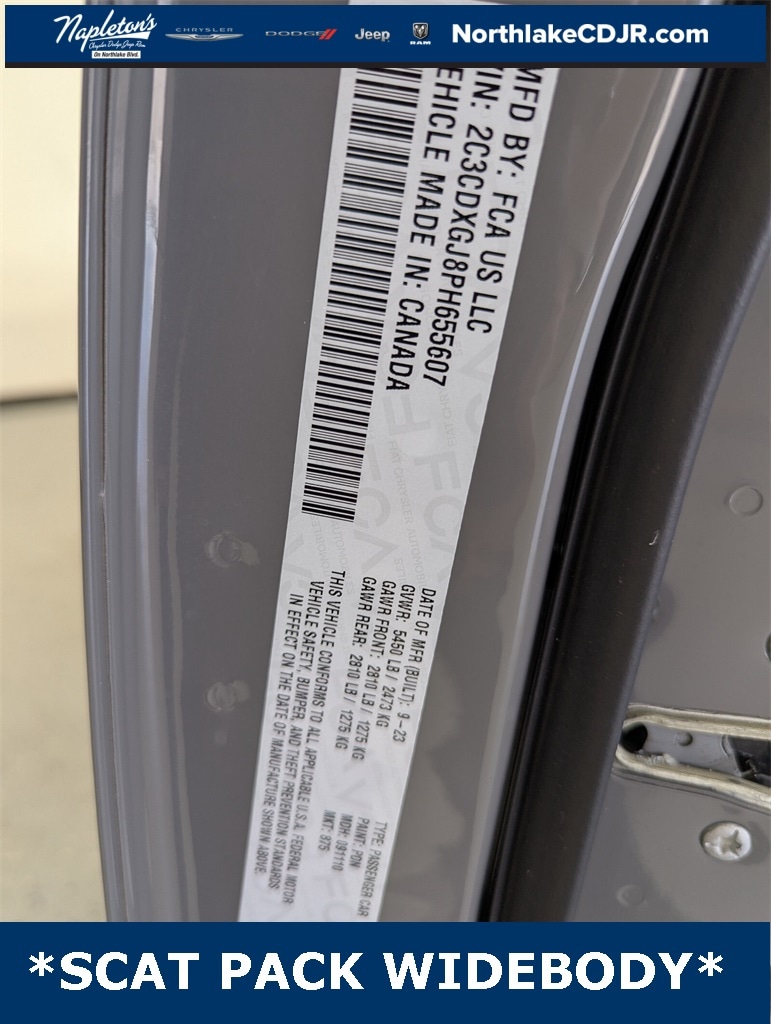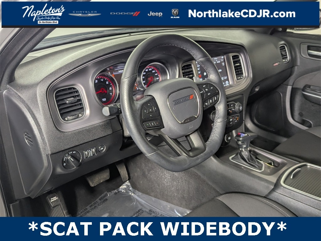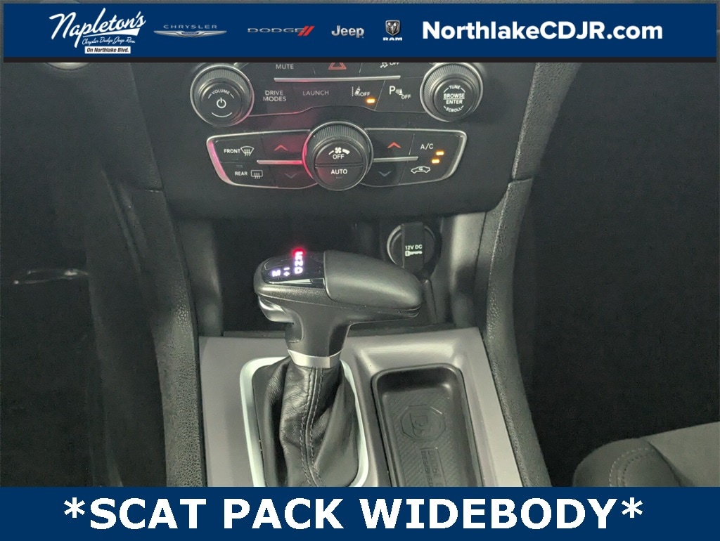 This Charger is well equipped with Quick Order Package 21V Scat Pack Widebody (Body Color Fender Flares, Brembo 6-Pot Fixed Front Caliper Brakes, Performance Shift Indicator, Wheels: 20" x 11" Carbon Black Aluminum, and Widebody Competition Suspension), Technology Group, Black Cloth, 1-Yr SiriusXM Guardian Trial, 2-Piece Shark Fin Antenna, 4-Wheel Disc Brakes, 4G LTE Wi-Fi Hot Spot, 6 Speakers, 8.4" Touchscreen Display, ABS brakes, Adaptive Damping Suspension (DISC), Air Conditioning, Alloy wheels, AM/FM radio: SiriusXM, Anti-whiplash front head restraints, Apple CarPlay, Apple CarPlay/Android Auto, Auto-dimming Rear-View mirror, Automatic temperature control, Brake assist, Bumpers: body-color, Cloth Performance Seats w/Heat, Compass, Delay-off headlights, Driver door bin, Driver vanity mirror, Dual front impact airbags, Dual front side impact airbags, Electronic Stability Control, Emergency communication system: SiriusXM Guardian, For Details, Visit DriveUconnect.com, Four wheel independent suspension, Front anti-roll bar, Front Bucket Seats, Front Center Armrest, Front dual zone A/C, Front fog lights, Front License Plate Bracket, Front reading lights, Fully automatic headlights, Garage door transmitter: HomeLink, Google Android Auto, GPS Antenna Input, HD Radio, Heated door mirrors, Heated Front Seats, Heated front seats, Heated steering wheel, Illuminated entry, Integrated Center Stack Radio, Integrated Voice Command w/Bluetooth, Knee airbag, Leather Shift Knob, Low tire pressure warning, Media Hub (2 USB, AUX), Occupant sensing airbag, Outside temperature display, Overhead airbag, Overhead console, Panic alarm, ParkView Rear Back-Up Camera, Passenger door bin, Passenger vanity mirror, Power 2-Way Driver Lumbar Adjust, Power door mirrors, Power driver seat, Power steering, Power windows, Radio: Uconnect 4C w/8.4" Display, Rear anti-roll bar, Rear Armrest w/Cupholder Seat, Rear reading lights, Rear seat center armrest, Rear window defroster, Remote keyless entry, Security system, Speed control, Speed-Sensitive Wipers, Split folding rear seat, Spoiler, Sport steering wheel, Steering wheel mounted audio controls, Tachometer, Telescoping steering wheel, Tilt steering wheel, Traction control, Trip computer, USB Host Flip, Variably intermittent wipers, and Wheels: 20" x 9" Lo Gloss Granite Crystal.