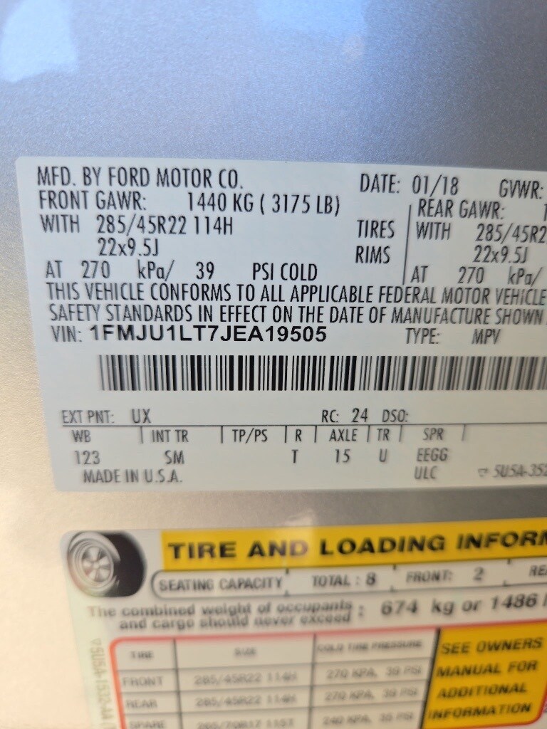 This Expedition is well equipped with 12 Speakers, 22" Polished Aluminum Wheels, 3.31 Axle Ratio, 3rd row seats: split-bench, 4-Wheel Disc Brakes, ABS brakes, Adaptive suspension, Adjustable pedals, Air Conditioning, Alloy wheels, AM/FM radio: SiriusXM, AppLink/Apple CarPlay and Android Auto, Auto High-beam Headlights, Auto-dimming door mirrors, Auto-dimming Rear-View mirror, Automatic temperature control, Brake assist, Bumpers: body-color, CD player, Compass, Delay-off headlights, Driver door bin, Driver vanity mirror, Dual front impact airbags, Dual front side impact airbags, Electronic Stability Control, Emergency communication system: SYNC 3 911 Assist, Exterior Parking Camera Rear, Four wheel independent suspension, Front anti-roll bar, Front Bucket Seats, Front Center Armrest, Front dual zone A/C, Front fog lights, Front reading lights, Fully automatic headlights, Garage door transmitter, Genuine wood console insert, Genuine wood dashboard insert, Genuine wood door panel insert, Heated & Cooled Perforated Leather Fr Bucket Seats, Heated door mirrors, Heated front seats, Heated rear seats, Heated steering wheel, Illuminated entry, Lane Departure Warning System, Leather steering wheel, Low tire pressure warning, Memory seat, Navigation System/ GPS, Occupant sensing airbag, Outside temperature display, Overhead airbag, Overhead console, Panic alarm, Passenger door bin, Passenger vanity mirror, Pedal memory, Power door mirrors, Power driver seat, Power Liftgate, Power moonroof, Power passenger seat, Power steering, Power windows, Radio data system, Radio: B&O PLAY Premium Audio System by harman, Rain sensing wipers, Rear air conditioning, Rear anti-roll bar, Rear audio controls, Rear reading lights, Rear window defroster, Rear window wiper, Reclining 3rd row seat, Remote keyless entry, Roof rack, Security system, SiriusXM Satellite Radio, Speed control, Speed-sensing steering, Speed-Sensitive Wipers, Split folding rear seat, Steering wheel memory, Steering wheel mounted audio controls, SYNC 3 Communications & Entertainment System, Tachometer, Telescoping steering wheel, Tilt steering wheel, Traction control, Trip computer, Turn signal indicator mirrors, Variably intermittent wipers, Ventilated front seats, and Voltmeter.