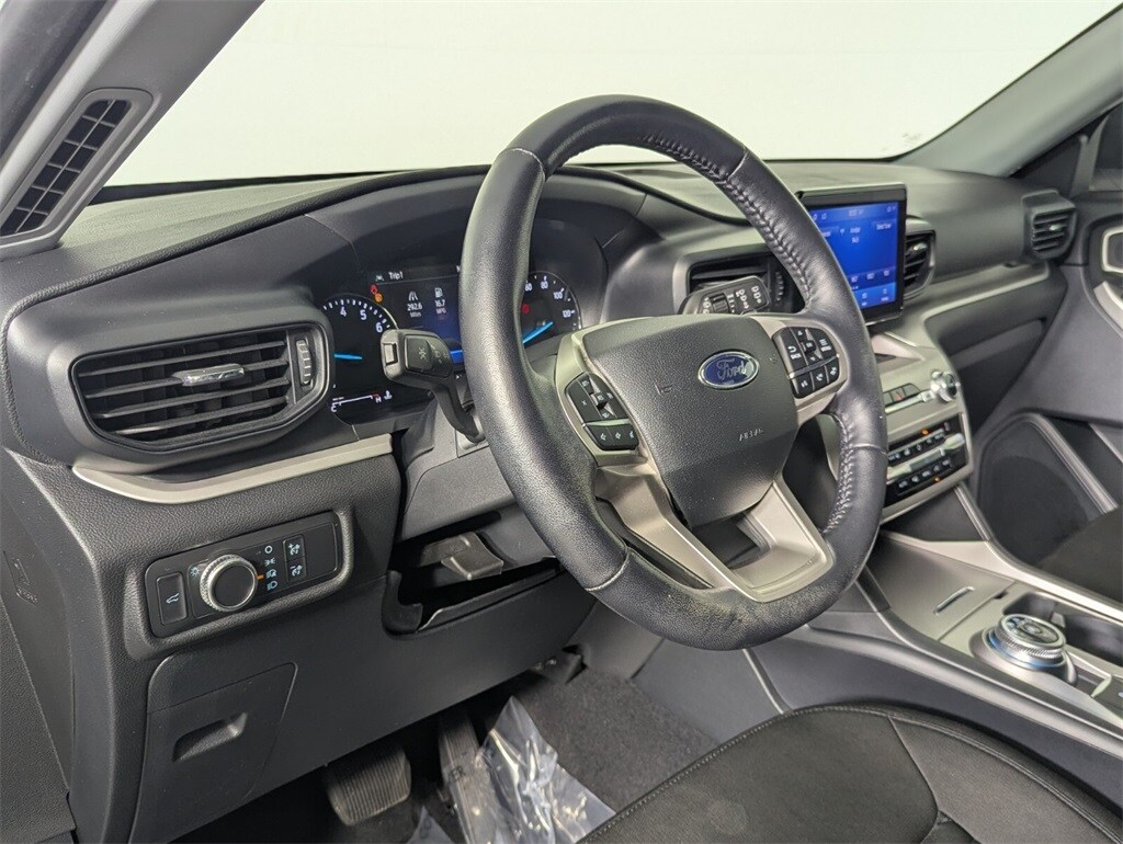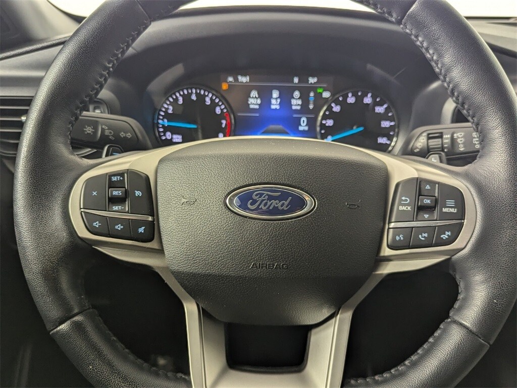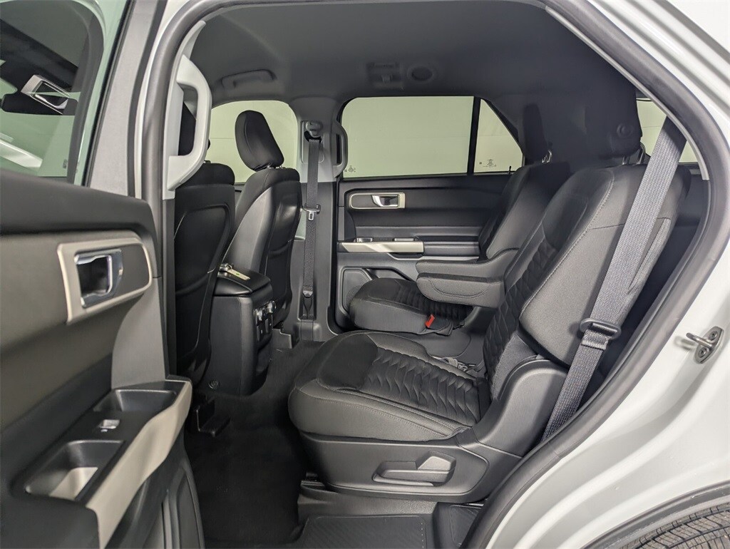 This Explorer is well equipped with 4WD, 3.58 Non-Limited-Slip Rear Axle Ratio, 3rd row seats: bench, 4-Wheel Disc Brakes, 6 Speakers, ABS brakes, Air Conditioning, Alloy wheels, AM/FM radio: SiriusXM, AM/FM Stereo, Auto High-beam Headlights, Automatic temperature control, Brake assist, Bumpers: body-color, Compass, Delay-off headlights, Driver door bin, Driver vanity mirror, Dual front impact airbags, Dual front side impact airbags, Electronic Stability Control, Emergency communication system: SYNC 3 911 Assist, Exterior Parking Camera Rear, FordPass Connect, Four wheel independent suspension, Front anti-roll bar, Front Bucket Seats, Front Center Armrest, Front dual zone A/C, Front reading lights, Fully automatic headlights, Heated door mirrors, Illuminated entry, Knee airbag, Leather steering wheel, Low tire pressure warning, Occupant sensing airbag, Outside temperature display, Overhead airbag, Overhead console, Panic alarm, Passenger door bin, Passenger vanity mirror, Power door mirrors, Power driver seat, Power Liftgate, Power passenger seat, Power steering, Power windows, Rear air conditioning, Rear anti-roll bar, Rear reading lights, Rear window defroster, Rear window wiper, Remote keyless entry, Roof rack: rails only, Security system, Speed control, Speed-sensing steering, Speed-Sensitive Wipers, Split folding rear seat, Spoiler, Steering wheel mounted audio controls, SYNC 3 Communications & Entertainment System, SYNC 3/Apple CarPlay/Android Auto, Tachometer, Telescoping steering wheel, Tilt steering wheel, Traction control, Trip computer, Unique Cloth Captain's Chairs, Variably intermittent wipers, and Wheels: 18" 5-Spoke Sparkle Silver-Painted Alum.