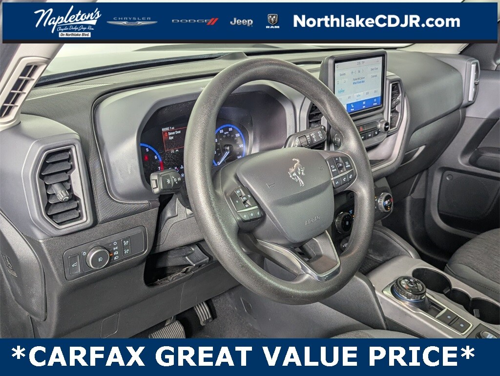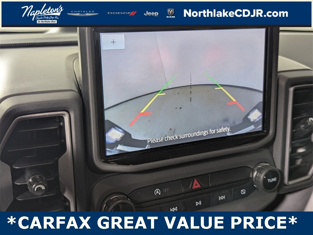 This Bronco Sport is well equipped with Equipment Group 200A, 3.80 Axle Ratio, 4-Wheel Disc Brakes, 6 Speakers, ABS brakes, Air Conditioning, Alloy wheels, AM/FM radio: SiriusXM, AM/FM Stereo, Auto High-beam Headlights, Automatic temperature control, Brake assist, Compass, Delay-off headlights, Driver door bin, Driver vanity mirror, Dual front impact airbags, Dual front side impact airbags, Electronic Stability Control, Emergency communication system: SYNC 3 911 Assist, Exterior Parking Camera Rear, Four wheel independent suspension, Front anti-roll bar, Front Bucket Seats, Front Center Armrest, Front fog lights, Front reading lights, Fully automatic headlights, Heated door mirrors, Illuminated entry, Knee airbag, Low tire pressure warning, Occupant sensing airbag, Outside temperature display, Overhead airbag, Overhead console, Panic alarm, Passenger door bin, Passenger vanity mirror, Power door mirrors, Power steering, Power windows, Radio data system, Rear anti-roll bar, Rear reading lights, Rear seat center armrest, Rear window defroster, Rear window wiper, Remote keyless entry, Roof rack: rails only, Security system, SiriusXM Radio, Speed control, Speed-sensing steering, Speed-Sensitive Wipers, Split folding rear seat, Steering wheel mounted audio controls, SYNC 3 Communications & Entertainment System, SYNC 3/Apple CarPlay/Android Auto, Tachometer, Telescoping steering wheel, Tilt steering wheel, Traction control, Trip computer, Unique Cloth Front Bucket Seats, Variably intermittent wipers, and Wheels: 17" Carbonized Gray-Painted Aluminum.