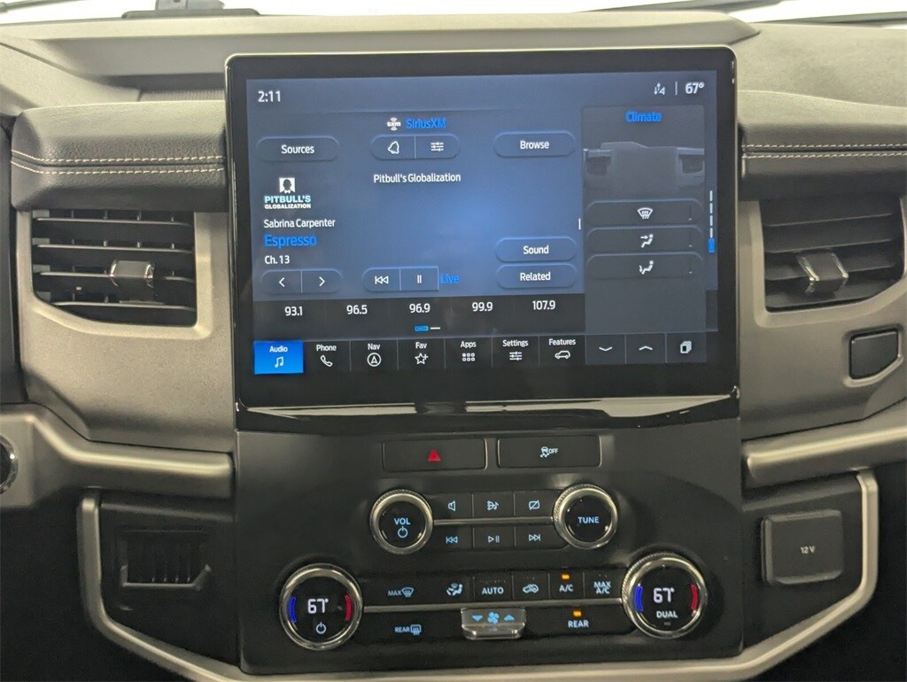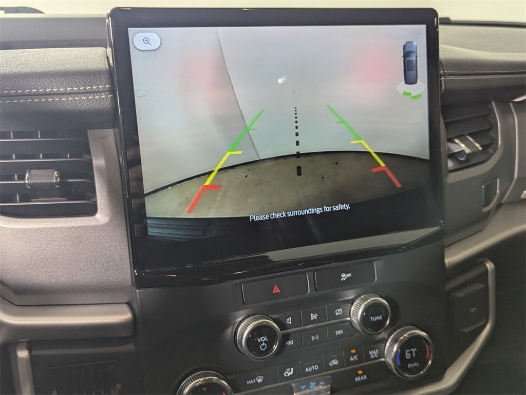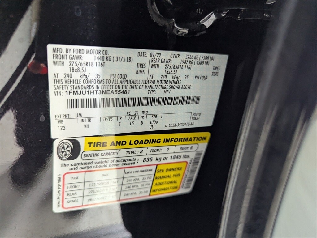Features: Equipment Group 200A Standard Package, 18" Machined-Face Aluminum Wheels, 3.31 Axle Ratio, 3.73 Axle Ratio, 3rd row seats: split-bench, 4-Wheel Disc Brakes, 6 Speakers, ABS brakes, Air Conditioning, Alloy wheels, AM/FM radio: SiriusXM with 360L, Auto High-beam Headlights, Auto Start-Stop Removal, Auto-dimming Rear-View mirror, Automatic temperature control, Brake assist, Bumpers: body-color, Cloth Front Captain's Chairs, Compass, Delay-off headlights, Driver door bin, Driver vanity mirror, Dual front impact airbags, Dual front side impact airbags, Electronic Stability Control, Emergency communication system: SYNC 4 911 Assist, Exterior Parking Camera Rear, Four wheel independent suspension, Front anti-roll bar, Front Bucket Seats, Front Center Armrest, Front dual zone A/C, Front reading lights, Fully automatic headlights, Garage door transmitter, Heated door mirrors, Illuminated entry, Leather steering wheel, Low tire pressure warning, Navigation system: Connected Navigation, Occupant sensing airbag, Outside temperature display, Overhead airbag, Overhead console, Panic alarm, Passenger door bin, Passenger vanity mirror, Power door mirrors, Power driver seat, Power steering, Power windows, Radio data system, Radio: AM/FM Stereo w/MP3 Capable, Rear air conditioning, Rear anti-roll bar, Rear reading lights, Rear window defroster, Rear window wiper, Reclining 3rd row seat, Remote keyless entry, Security system, SiriusXM w/360L, Speed control, Speed-sensing steering, Speed-Sensitive Wipers, Split folding rear seat, Spoiler, Steering wheel mounted audio controls, SYNC 4 w/Enhanced Voice Recognition, Tachometer, Telescoping steering wheel, Tilt steering wheel, Traction control, Trip computer, Variably intermittent wipers, and Voltmeter.