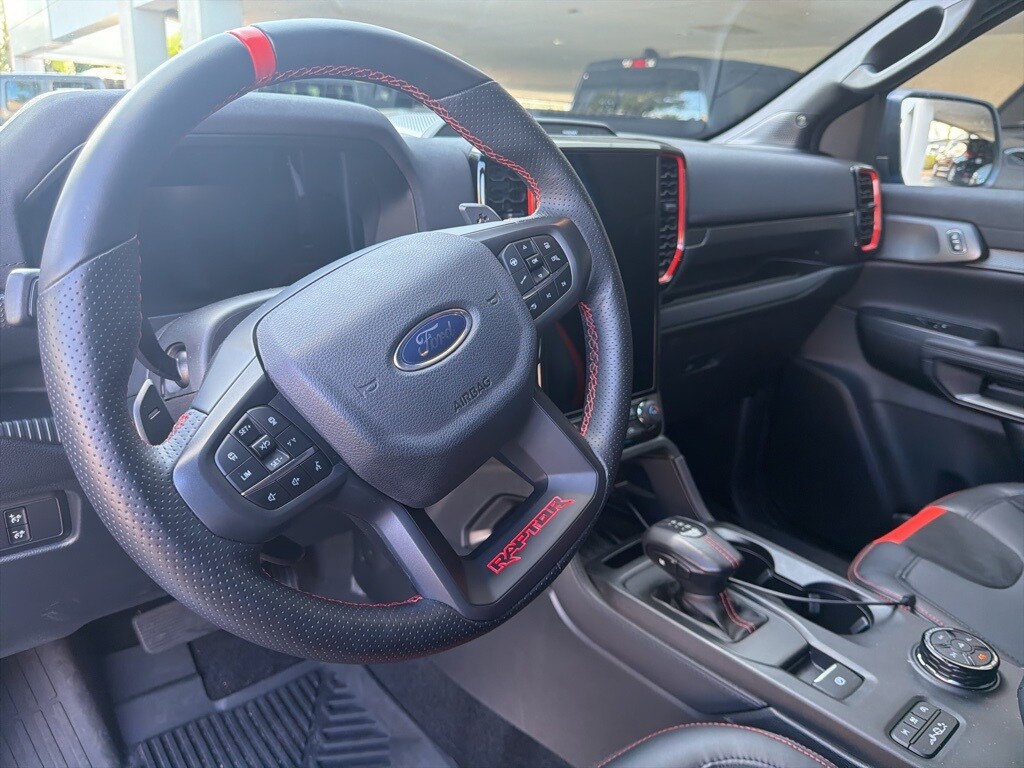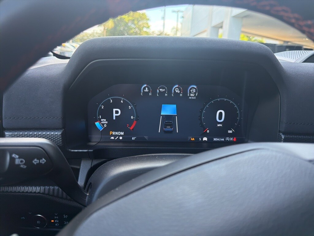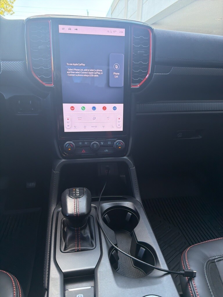 This Ranger is well equipped with Equipment Group 800A Standard, 4WD, 10 Speakers, 4-Wheel Disc Brakes, ABS brakes, Air Conditioning, Alloy wheels, AM/FM radio: SiriusXM, Auto High-beam Headlights, Auto-dimming Rear-View mirror, Automatic temperature control, Brake assist, Compass, Delay-off headlights, Driver door bin, Driver vanity mirror, Dual front impact airbags, Dual front side impact airbags, Electronic Stability Control, Emergency communication system: SYNC 4 911 Assist, Exterior Parking Camera Rear, Front anti-roll bar, Front Bucket Seats, Front Center Armrest, Front dual zone A/C, Front fog lights, Front License Plate Bracket, Front reading lights, Front wheel independent suspension, Fully automatic headlights, Garage door transmitter, Heated door mirrors, Heated front seats, Heated steering wheel, Illuminated entry, Leather Shift Knob, Leather steering wheel, Leather-Trimmed Front Heated Bucket Seats, Low tire pressure warning, Memory seat, Navigation system: Connected Navigation, Occupant sensing airbag, Outside temperature display, Overhead airbag, Overhead console, Panic alarm, Passenger door bin, Passenger vanity mirror, Power door mirrors, Power driver seat, Power passenger seat, Power steering, Power windows, Radio: B&O Sound System by Bang & Olufsen, Rain sensing wipers, Raptor Decal, Rear reading lights, Rear seat center armrest, Rear step bumper, Rear window defroster, Remote keyless entry, Security system, SiriusXM Satellite Radio, Speed control, Speed-sensing steering, Steering wheel mounted audio controls, SYNC 4A w/Connected Built-In Navigation, Telescoping steering wheel, Tilt steering wheel, Tough Bed Spray-In Bedliner, Traction control, Trip computer, Turn signal indicator mirrors, Variably intermittent wipers, Voltmeter, and Wheels: 17" Gray-Painted Aluminum.