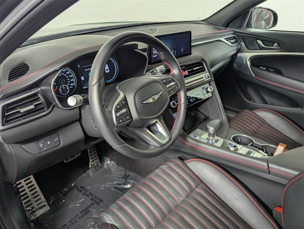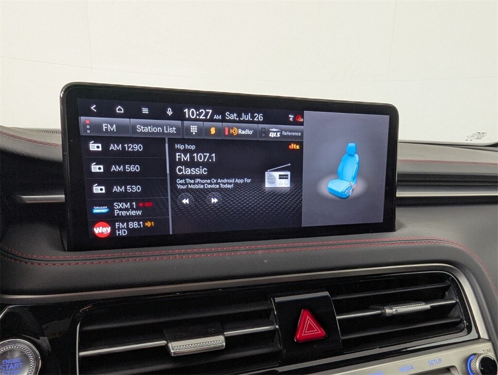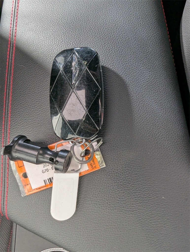 Features: Sport Prestige Package (4-Way Power Lumbar Front Passenger Seat, Acoustic Front Door Glass, Alloy Pedals, Dark Chrome Grille & Daylight Opening Trim, Forward & Reverse Parking Distance Warning, Front Passenger Seat Walk-In Device, Integrated Memory System (IMS), Leather Seating Surfaces, Option Group 02, Power Folding ECM Outside Mirrors, Power Telescoping Steering Wheel, Radio: AM/FM/SiriusXM/HD Lexicon Prem Audio System, Rain-Sensing Wipers, Sport Aluminum Trim, Ventilated Front Seats, Wheels: 19" x 8.0J Fr & 19" x 8.5J Rr Sport Alloy, Wide Sunroof, and Wireless Phone Charger), G70 2.5T, 4D Sedan, I4, 8-Speed Automatic, RWD, Vik Black, Obsidian Black/Red Stitch Leather, 4-Wheel Disc Brakes, 6 Speakers, ABS brakes, Air Conditioning, Alloy wheels, AM/FM radio: SiriusXM, Android Auto & Apple CarPlay, Anti-whiplash front head restraints, Auto High-beam Headlights, Auto-dimming Rear-View mirror, Automatic temperature control, Brake assist, Bumper Applique, Bumpers: body-color, Delay-off headlights, Driver door bin, Driver vanity mirror, Dual front impact airbags, Dual front side impact airbags, Electronic Stability Control, Emergency communication system: Genesis Connected Services, Exterior Parking Camera Rear, First Aid Kit, Four wheel independent suspension, Front anti-roll bar, Front Bucket Seats, Front Center Armrest, Front dual zone A/C, Front reading lights, Fully automatic headlights, Garage door transmitter: HomeLink, Heated door mirrors, Heated front seats, Heated Multi-Adjustable Front Bucket Seats, Illuminated entry, Knee airbag, Leatherette Seating Surfaces, Low tire pressure warning, Navigation System, Occupant sensing airbag, Outside temperature display, Overhead airbag, Overhead console, Panic alarm, Passenger door bin, Passenger vanity mirror, Power door mirrors, Power driver seat, Power passenger seat, Power steering, Power windows, Radio: AM/FM/SiriusXM/HD Audio System, Rear anti-roll bar, Rear reading lights, Rear seat center armrest, Rear side impact airbag, Rear window defroster, Remote keyless entry, Reversible Cargo Tray, Security system, Speed control, Speed-Sensitive Wipers, Split folding rear seat, Steering wheel mounted audio controls, Tachometer, Telescoping steering wheel, Traction control, Trip computer, Turn signal indicator mirrors, Variably intermittent wipers, Wheel Locks, and Wheels: 19" x 8.0J Fr & 19" x 8.5J Rr Alloy.