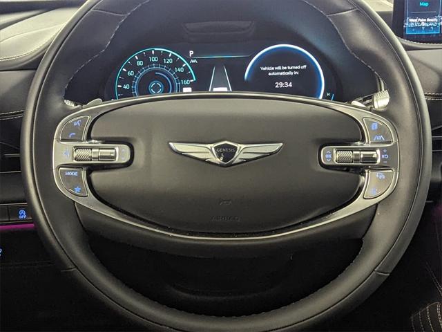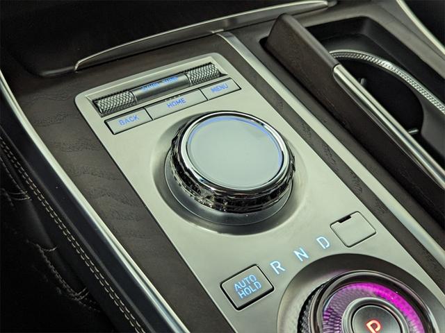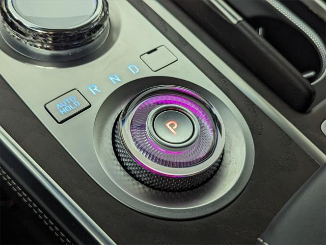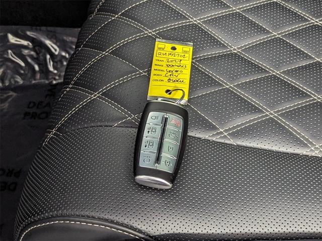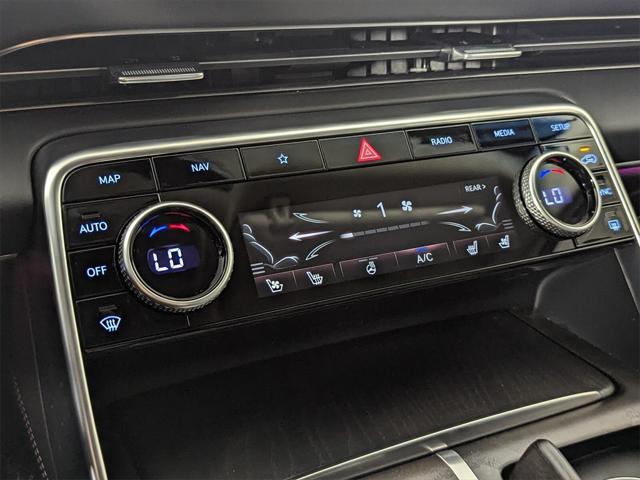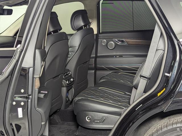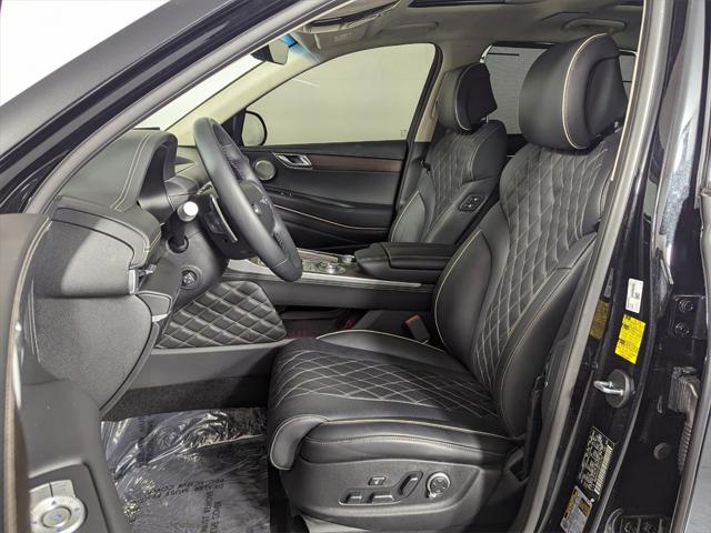 Features: Prestige Package (3-Zone Climate Control, Blind-Spot View Monitor, Ergo Motion Driver Seat, Head-Up Display, Heated 2nd Row Seats, Option Group 06, Power Cushion Extension & Bolster, Radio: AM/FM/SiriusXM/HD Lexicon Prem Audio System, Remote Smart Parking Assist, Reverse Parking Collision-Avoidance Assist, and Surround View Monitor), 12 Speakers, 12.3" 3D Digital Instrument Cluster, 2nd Row Vanity Mirrors, 3.909 Axle Ratio, 4-Wheel Disc Brakes, ABS brakes, Active Noise Control, Adaptive suspension, Air Conditioning, Alloy wheels, AM/FM radio: SiriusXM, Android Auto & Apple CarPlay, Anti-whiplash front head restraints, Auto High-beam Headlights, Auto tilt-away steering wheel, Auto-dimming door mirrors, Auto-dimming Rear-View mirror, Automatic temperature control, Brake assist, Bumpers: body-color, Compass, Delay-off headlights, Driver door bin, Driver vanity mirror, Dual front impact airbags, Dual front side impact airbags, Electronic Limited Slip Differential, Electronic Stability Control, Emergency communication system: Genesis Connected Services, Exterior Parking Camera Rear, Forward Attention Warning, Four wheel independent suspension, Front anti-roll bar, Front Bucket Seats, Front Center Armrest, Front dual zone A/C, Front reading lights, Fully automatic headlights, Garage door transmitter: HomeLink, Genuine wood console insert, Genuine wood dashboard insert, Genuine wood door panel insert, Heated & Ventilated Front Bucket Seats, Heated door mirrors, Heated front seats, Heated steering wheel, Illuminated entry, Knee airbag, Leather steering wheel, Leatherette Seating Surfaces, Low tire pressure warning, Memory seat, Mudguards, Nappa Leather Seating Surfaces, Navigation System, Occupant sensing airbag, Outside temperature display, Overhead airbag, Overhead console, Panic alarm, Passenger door bin, Passenger vanity mirror, Power 2nd Row Outboard Seats, Power Door Closure, Power door mirrors, Power driver seat, Power Liftgate, Power moonroof, Power passenger seat, Power Rear Door Shades, Power steering, Power windows, Radio data system, Radio:14.5" Navigation System w/AM/FM/HD Radio, Rain sensing wipers, Rear air conditioning, Rear anti-roll bar, Rear reading lights, Rear seat center armrest, Rear side impact airbag, Rear window defroster, Rear window wiper, Remote keyless entry, Reversible Cargo Tray, Security system, Speed control, Speed-sensing steering, Speed-Sensitive Wipers, Split folding rear seat, Spoiler, Steering wheel memory, Steering wheel mounted audio controls, Suede Headliner, Tachometer, Telescoping steering wheel, Tilt steering wheel, Traction control, Trip computer, Turn signal indicator mirrors, Variably intermittent wipers, Ventilated 2nd Row Outboard Seats, Ventilated front seats, Wheel Locks, Wheels: 20" x 8.5J Medium Metallic Gray Alloy, and Wheels: 22" x 9.5J Alloy.