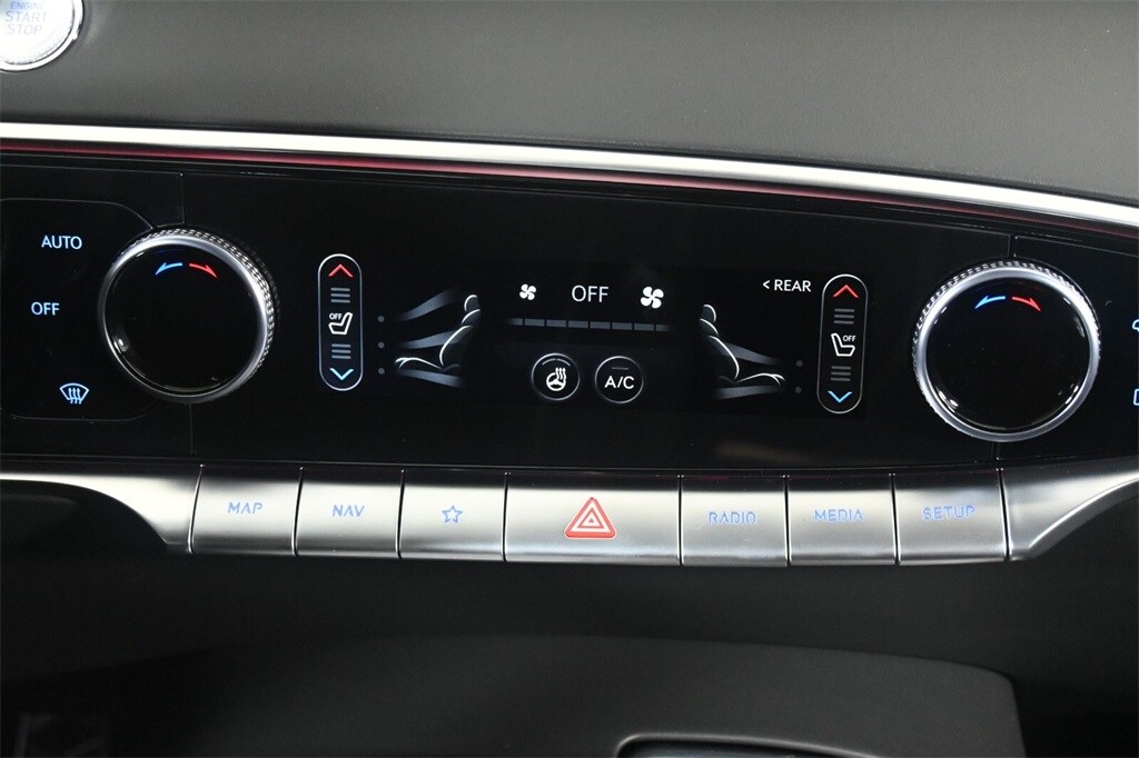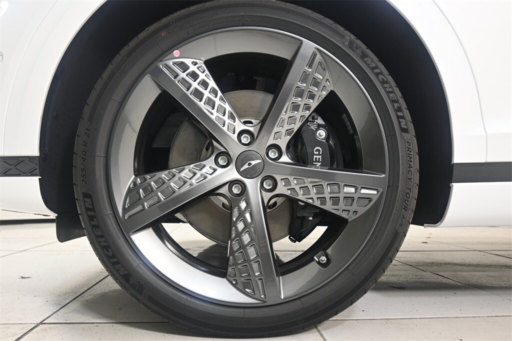Features: Sport Appearance, Sport Prestige Package (12.3" 3D Digital Instrument Cluster, 2nd Row 110V AC Power Outlet, 3-Zone Climate Control, 4-Way Power Lumbar Front Passenger Seat, Adjustable Interior Ambient Lighting, Advanced Rear Occupant Alert, Alloy Pedals, Aluminum Trim w/Haptic Carbon Pattern, Blind-Spot View Monitor, Ergo Motion Seat, Forward Attention Warning, Forward/Reverse Parking Distance Warning, Genesis Digital Key, Heated Steering Wheel, Integrated Memory System (IMS), Leather Seating Surfaces w/Mesh Insert, Leatherette Wrapped Upper Instrument Panel, Lexicon Premium Audio, Manual Rear Door Shades, Passenger Walk-In Device, Power Driver Seat Bolster & Cushion Extension, Power Folding ECM Mirrors w/Genesis Logo Lamp, Power Telescoping Steering Wheel, Power Tilt & Slide Panoramic Sunroof, Remote Smart Parking Assist, Reverse Parking Collision-Avoidance Assist, Surround View Monitor, Ventilated Front Seats, and Wheels: 21" Dark Sputtering Sport Alloy), 4-Wheel Disc Brakes, 9 Speakers, ABS brakes, Air Conditioning, Alloy wheels, Aluminum Trim w/Spin Brushed Pattern, AM/FM radio: SiriusXM, Android Auto & Apple CarPlay, Anti-whiplash front head restraints, Auto High-beam Headlights, Auto-dimming Rear-View mirror, Automatic temperature control, Brake assist, Bumpers: body-color, Delay-off headlights, Driver door bin, Driver vanity mirror, Dual front impact airbags, Dual front side impact airbags, Electronic Stability Control, Emergency communication system: Genesis Connected Services, Exterior Parking Camera Rear, First Aid Kit, Four wheel independent suspension, Front anti-roll bar, Front Bucket Seats, Front Center Armrest w/Storage, Front dual zone A/C, Front reading lights, Fully automatic headlights, Garage door transmitter: HomeLink, Heated door mirrors, Heated Front Bucket Seats, Heated front seats, Illuminated Door Scuff Plates, Illuminated entry, Knee airbag, Leather Seating Surfaces, Leather steering wheel, Leatherette Seating Surfaces, Low tire pressure warning, Navigation System, Occupant sensing airbag, Outside temperature display, Overhead airbag, Overhead console, Panic alarm, Passenger door bin, Passenger vanity mirror, Power door mirrors, Power driver seat, Power Liftgate, Power passenger seat, Power steering, Power windows, Radio: 14.5" Navigation System w/AM/FM/HD Radio, Rain sensing wipers, Rear anti-roll bar, Rear Parking Sensors, Rear reading lights, Rear seat center armrest, Rear window defroster, Rear window wiper, Remote keyless entry, Security system, Speed control, Speed-sensing steering, Speed-Sensitive Wipers, Split folding rear seat, Spoiler, Steering wheel mounted audio controls, Tachometer, Telescoping steering wheel, Traction control, Trip computer, Turn signal indicator mirrors, Variably intermittent wipers, Wave Line Backlit Trim, and Wheels: 19" Dark Hyper Silver Alloy.