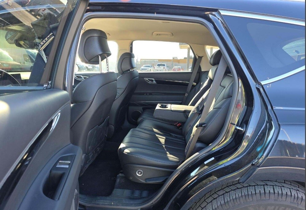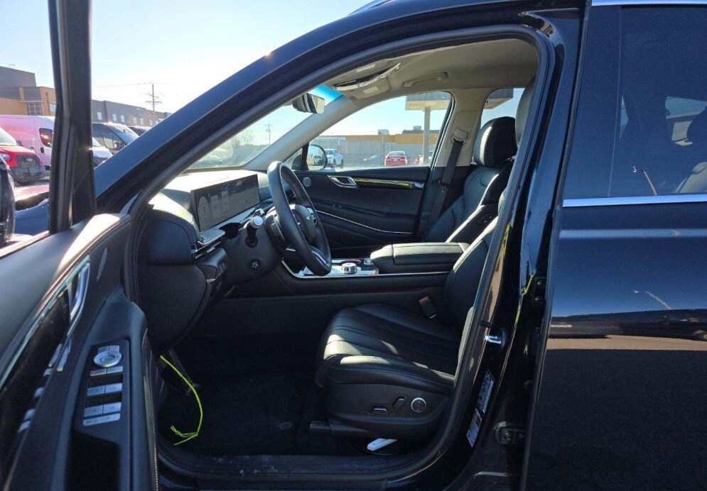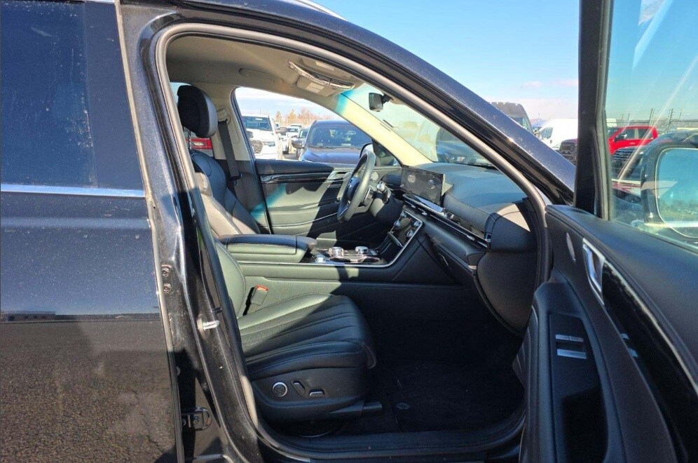 Features: 12 Speakers, 4-Wheel Disc Brakes, ABS brakes, Air Conditioning, Alloy wheels, AM/FM radio: SiriusXM, Anti-whiplash front head restraints, Auto High-beam Headlights, Auto tilt-away steering wheel, Auto-dimming door mirrors, Auto-dimming Rear-View mirror, Auto-leveling suspension, Automatic temperature control, Brake assist, Bumpers: body-color, Compass, Delay-off headlights, Driver door bin, Driver vanity mirror, Dual front impact airbags, Dual front side impact airbags, Electronic Stability Control, Emergency communication system: Genesis Connected Services, Exterior Parking Camera Rear, Four wheel independent suspension, Front anti-roll bar, Front Bucket Seats, Front Center Armrest, Front dual zone A/C, Front reading lights, Fully automatic headlights, Garage door transmitter: HomeLink, Heated door mirrors, Heated Front Bucket Seats, Heated front seats, Illuminated entry, Knee airbag, Leather steering wheel, Leatherette Seating Surfaces, Low tire pressure warning, Memory seat, Navigation System, Occupant sensing airbag, Outside temperature display, Overhead airbag, Overhead console, Panic alarm, Passenger door bin, Passenger vanity mirror, Power door mirrors, Power driver seat, Power Liftgate, Power passenger seat, Power steering, Power windows, Radio data system, Radio: AM/FM/SiriusXM/HD, Rain sensing wipers, Rear air conditioning, Rear anti-roll bar, Rear reading lights, Rear seat center armrest, Rear side impact airbag, Rear window defroster, Rear window wiper, Remote keyless entry, Security system, Speed control, Speed-sensing steering, Speed-Sensitive Wipers, Split folding rear seat, Spoiler, Steering wheel memory, Steering wheel mounted audio controls, Tachometer, Telescoping steering wheel, Tilt steering wheel, Traction control, Trip computer, Turn signal indicator mirrors, Variably intermittent wipers, and Wheels: 19" x 8.5J Medium Metallic Gray Alloy.