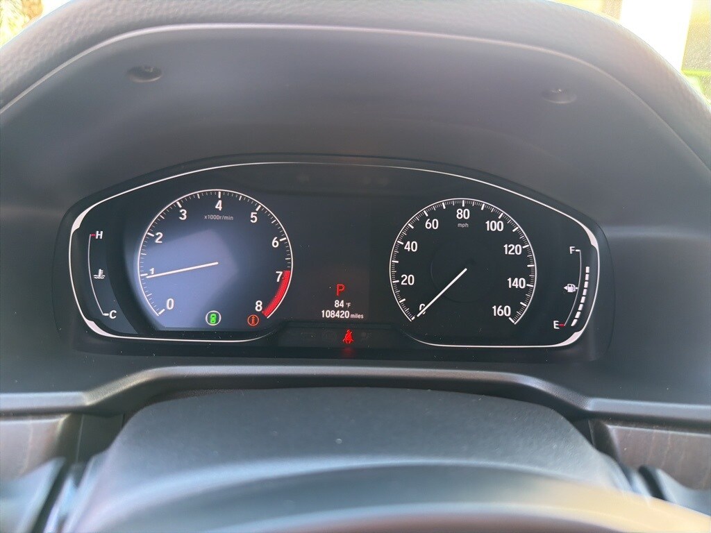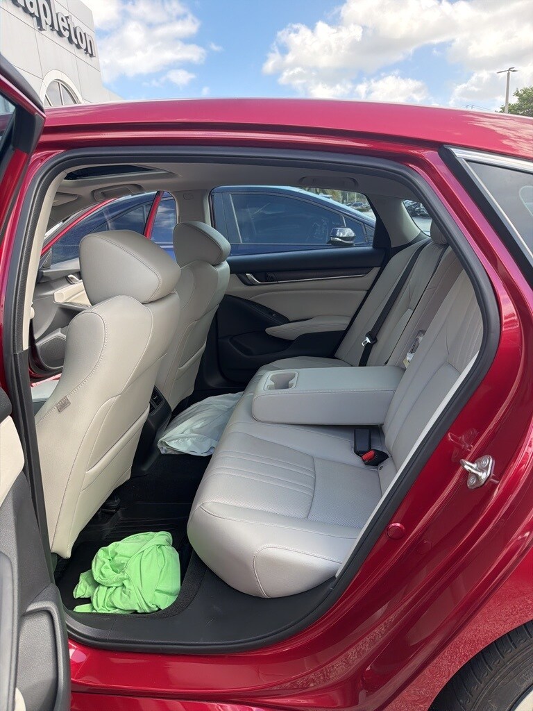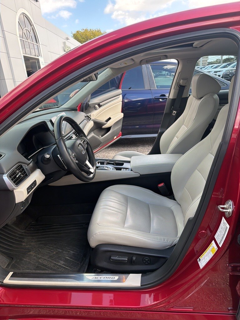 This Accord is well equipped with Ivory Leather, 10 Speakers, 4-Wheel Disc Brakes, ABS brakes, Adaptive suspension, Air Conditioning, Alloy wheels, AM/FM radio: SiriusXM, Apple CarPlay/Android Auto, Auto High-beam Headlights, Auto-dimming Rear-View mirror, Automatic temperature control, Blind Spot Information (BSI) System warning, Brake assist, Bumpers: body-color, Compass, Delay-off headlights, Driver door bin, Driver vanity mirror, Dual front impact airbags, Dual front side impact airbags, Electronic Stability Control, Emergency communication system: HondaLink, Exterior Parking Camera Rear, Four wheel independent suspension, Front anti-roll bar, Front Bucket Seats, Front Center Armrest, Front dual zone A/C, Front fog lights, Front reading lights, Fully automatic headlights, Garage door transmitter: HomeLink, Heads-Up Display, Heated & Ventilated Front Bucket Seats, Heated door mirrors, Heated front seats, Heated rear seats, Illuminated entry, Knee airbag, Leather Shift Knob, Leather steering wheel, Leather-Trimmed Seats, Low tire pressure warning, Memory seat, Navigation System/ GPS, Occupant sensing airbag, Outside temperature display, Overhead airbag, Overhead console, Panic alarm, Passenger door bin, Passenger vanity mirror, Power door mirrors, Power driver seat, Power moonroof, Power passenger seat, Power steering, Power windows, Radio data system, Radio: 450-Watt AM/FM/HD Premium Audio System, Rain sensing wipers, Rear anti-roll bar, Rear seat center armrest, Rear window defroster, Remote keyless entry, Security system, Speed control, Speed-sensing steering, Speed-Sensitive Wipers, Split folding rear seat, Steering wheel mounted audio controls, Tachometer, Telescoping steering wheel, Tilt steering wheel, Traction control, Trip computer, Turn signal indicator mirrors, Variably intermittent wipers, Ventilated front seats, and Wheels: 19" Machine-Finished Alloy w/Gray Inserts.