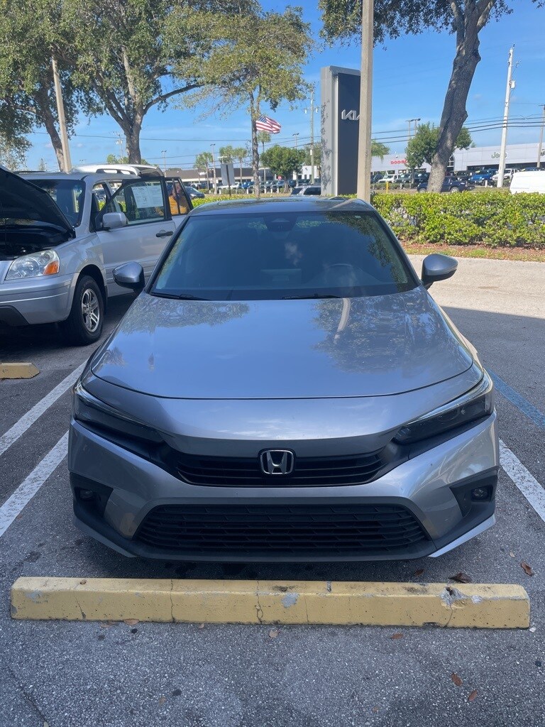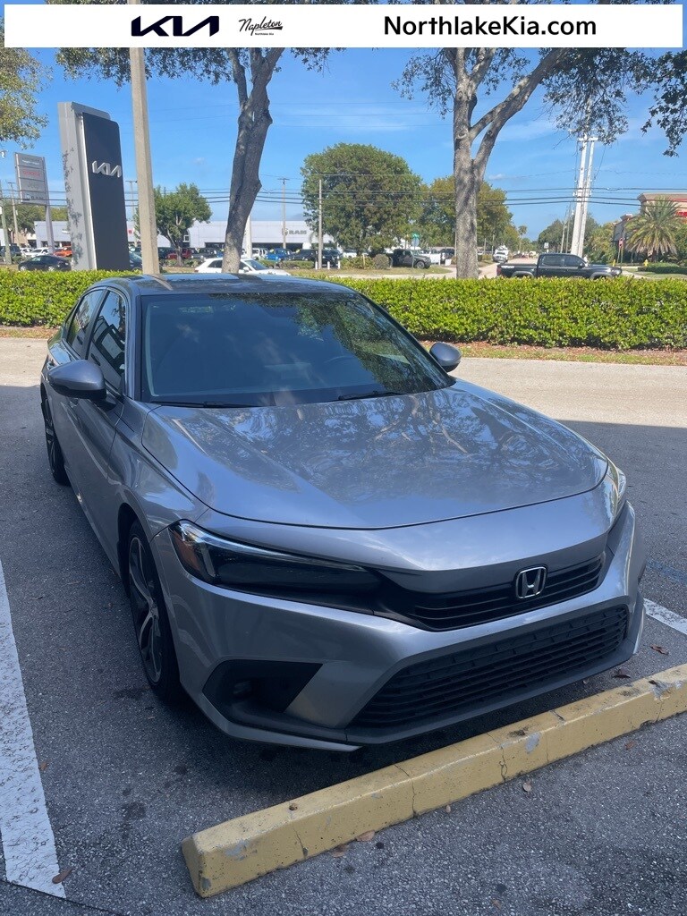 2023 Honda Civic Touring Beautifully finished in with interior. 1.5L I-4 DI DOHC Turbocharged 4D Sedan FWD CVT 12 Speakers, 4-Wheel Disc Brakes, ABS brakes, Adaptive Cruise Control: Adaptive Cruise Control (ACC) with Low-Speed Follow, Air Conditioning, Alloy wheels, AM/FM radio: SiriusXM, Apple CarPlay/Android Auto, Auto High-beam Headlights, Auto-dimming Rear-View mirror, Automatic temperature control, Blind Spot Information (BSI) System warning, Brake assist, Bumpers: body-color, Compass, Delay-off headlights, Driver door bin, Driver vanity mirror, Dual front impact airbags, Dual front side impact airbags, Electronic Stability Control, Emergency communication system: HondaLink, Exterior Parking Camera Rear, Four wheel independent suspension, Front anti-roll bar, Front Bucket Seats, Front Center Armrest, Front dual zone A/C, Front fog lights, Front reading lights, Fully automatic headlights, Garage door transmitter: HomeLink, Heated door mirrors, Heated Front Bucket Seats, Heated front seats, Illuminated entry, Knee airbag, Leather Seat Trim, Leather Shift Knob, Leather steering wheel, Low tire pressure warning, Navigation system: Honda Satellite-Linked Navigation System, Occupant sensing airbag, Outside temperature display, Overhead airbag, Overhead console, Panic alarm, Passenger door bin, Passenger vanity mirror, Power door mirrors, Power driver seat, Power moonroof, Power passenger seat, Power steering, Power windows, Radio data system, Radio: Bose Premium Audio System w/12 Speakers, Rain sensing wipers, Rear anti-roll bar, Rear seat center armrest, Rear side impact airbag, Rear window defroster, Remote keyless entry, Security system, Speed control, Speed-sensing steering, Split folding rear seat, Steering wheel mounted audio controls, Tachometer, Telescoping steering wheel, Tilt steering wheel, Traction control, Trip computer, Turn signal indicator mirrors, Variably intermittent wipers, Wheels: 18" Alloy w/Gloss Shark Gray Inserts. CARFAX One-Owner. Clean CARFAX. Priced below KBB Fair Purchase Price! 31/38 City/Highway MPG
