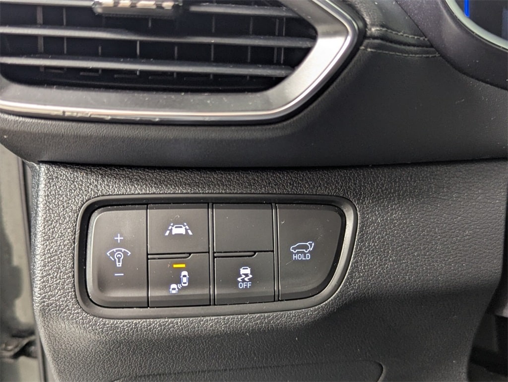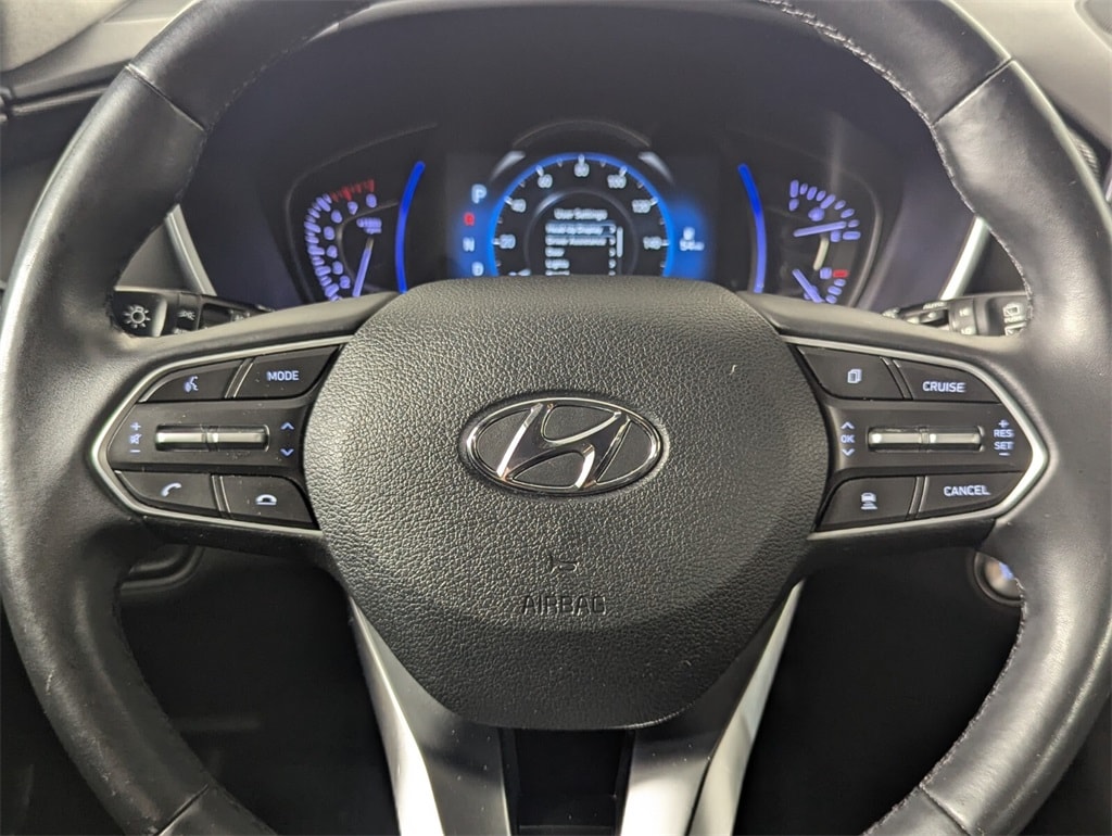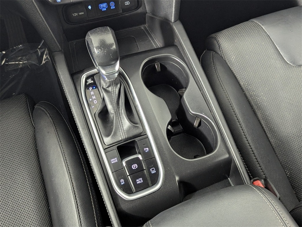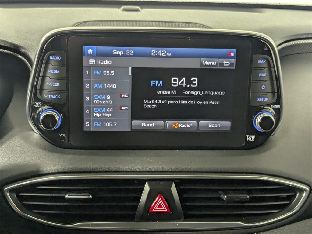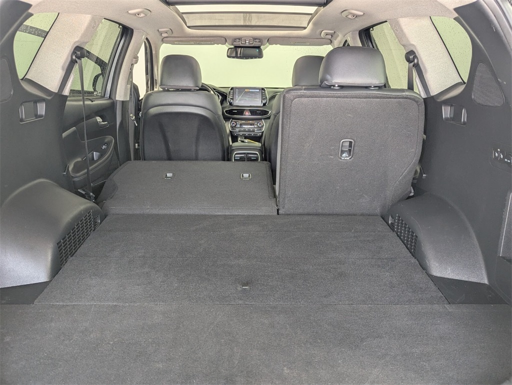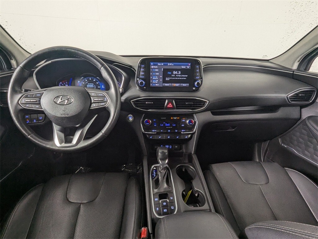 This Santa Fe is well equipped with Option Group 01, Black Leather, 12 Speakers, 4-Wheel Disc Brakes, ABS brakes, Air Conditioning, Alloy wheels, AM/FM radio: SiriusXM, Apple CarPlay & Android Auto, Auto High-beam Headlights, Auto-dimming Rear-View mirror, Automatic temperature control, Axle Ratio 3.320, Brake assist, Bumpers: body-color, Cargo Cover, Cargo Tray, Carpeted Floor Mats, Compass, Delay-off headlights, Driver door bin, Driver vanity mirror, Dual front impact airbags, Dual front side impact airbags, Electronic Stability Control, Emergency communication system, Four wheel independent suspension, Front anti-roll bar, Front Bucket Seats, Front Center Armrest, Front dual zone A/C, Front fog lights, Front reading lights, Fully automatic headlights, Garage door transmitter: HomeLink, Heads-Up Display, Heated & Ventilated Front Bucket Seats, Heated door mirrors, Heated front seats, Heated rear seats, Heated steering wheel, Illuminated entry, Leather Seating Surface, Leather Shift Knob, Leather steering wheel, Low tire pressure warning, Memory seat, Navigation System/ GPS, Occupant sensing airbag, Outside temperature display, Overhead airbag, Overhead console, Panic alarm, Passenger door bin, Passenger vanity mirror, Power door mirrors, Power driver seat, Power Liftgate, Power moonroof, Power passenger seat, Power steering, Power windows, Radio: Infinity Premium AM/FM/MP3 Display Audio, Rain sensing wipers, Rear anti-roll bar, Rear Parking Sensors, Rear seat center armrest, Rear window defroster, Rear window wiper, Remote keyless entry, Security system, Speed control, Speed-sensing steering, Split folding rear seat, Spoiler, Steering wheel mounted audio controls, Tachometer, Telescoping steering wheel, Tilt steering wheel, Traction control, Trip computer, Turn signal indicator mirrors, Variably intermittent wipers, Ventilated front seats, and Wheels: 19" x 7.5J Alloy.