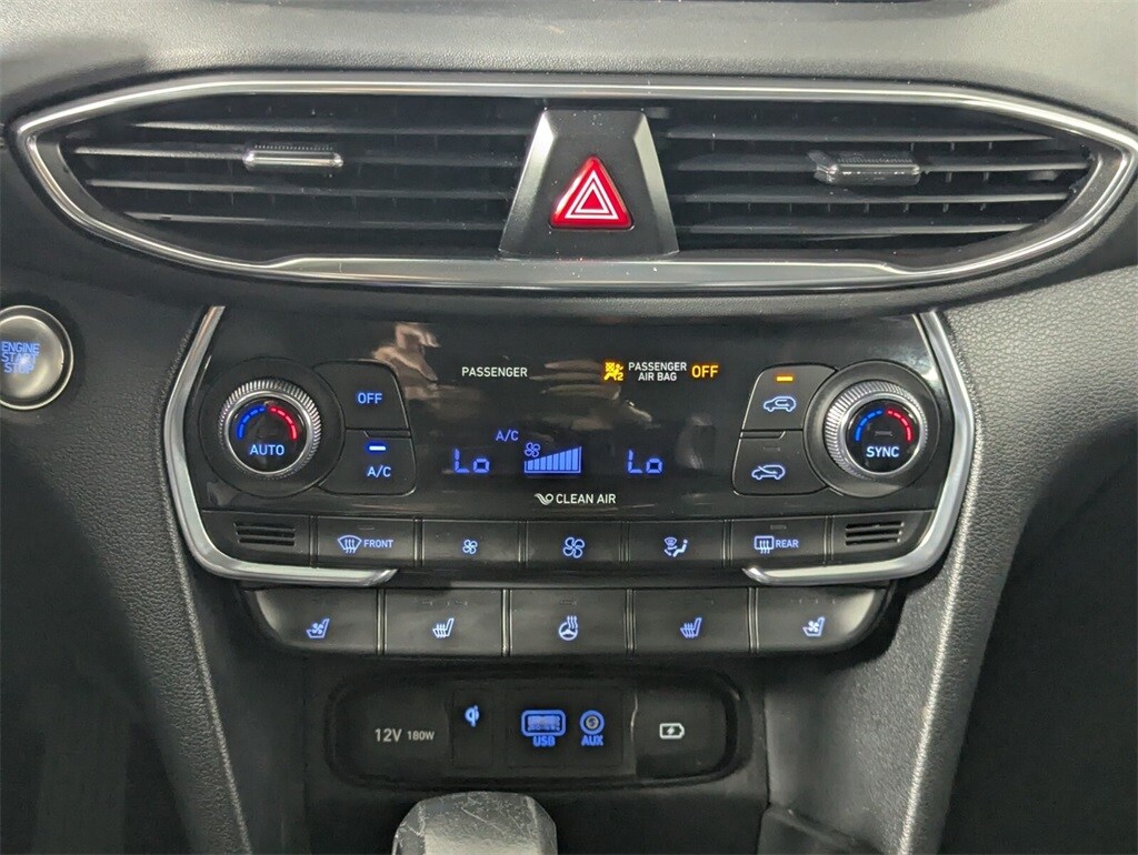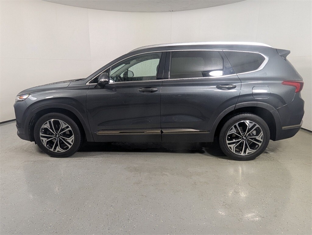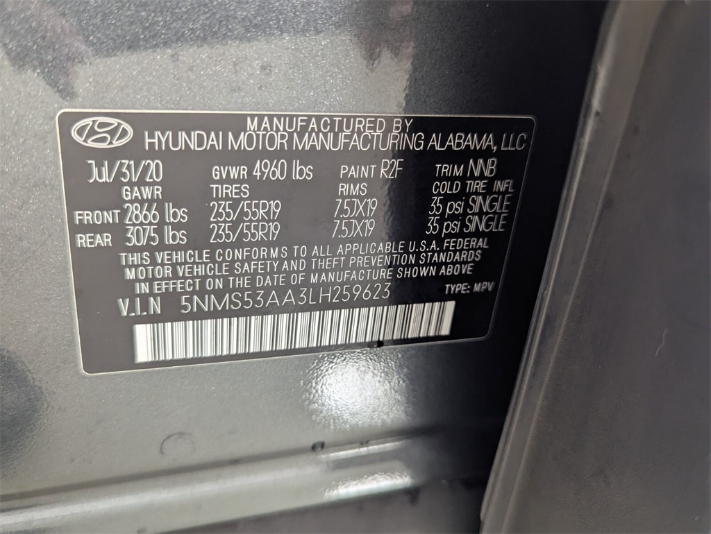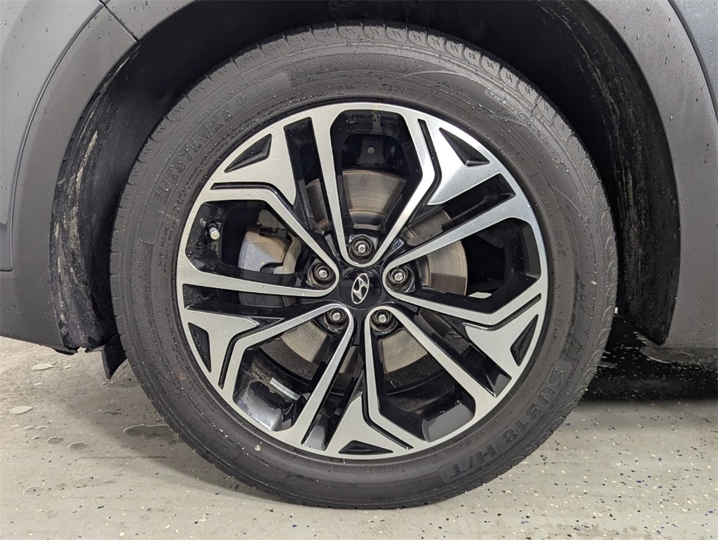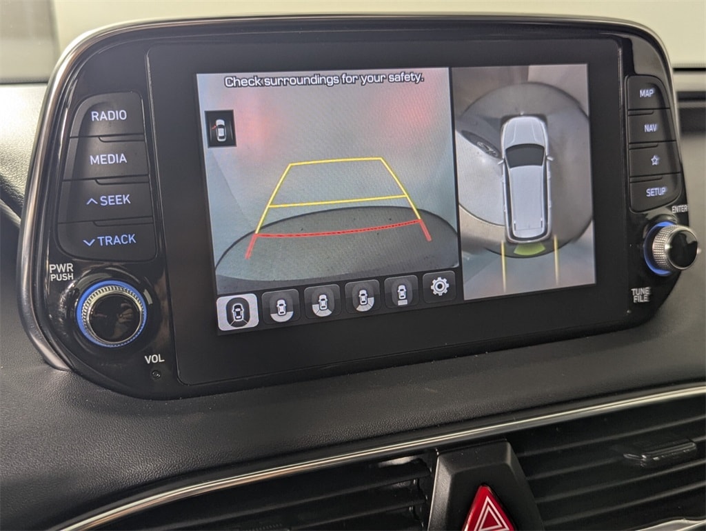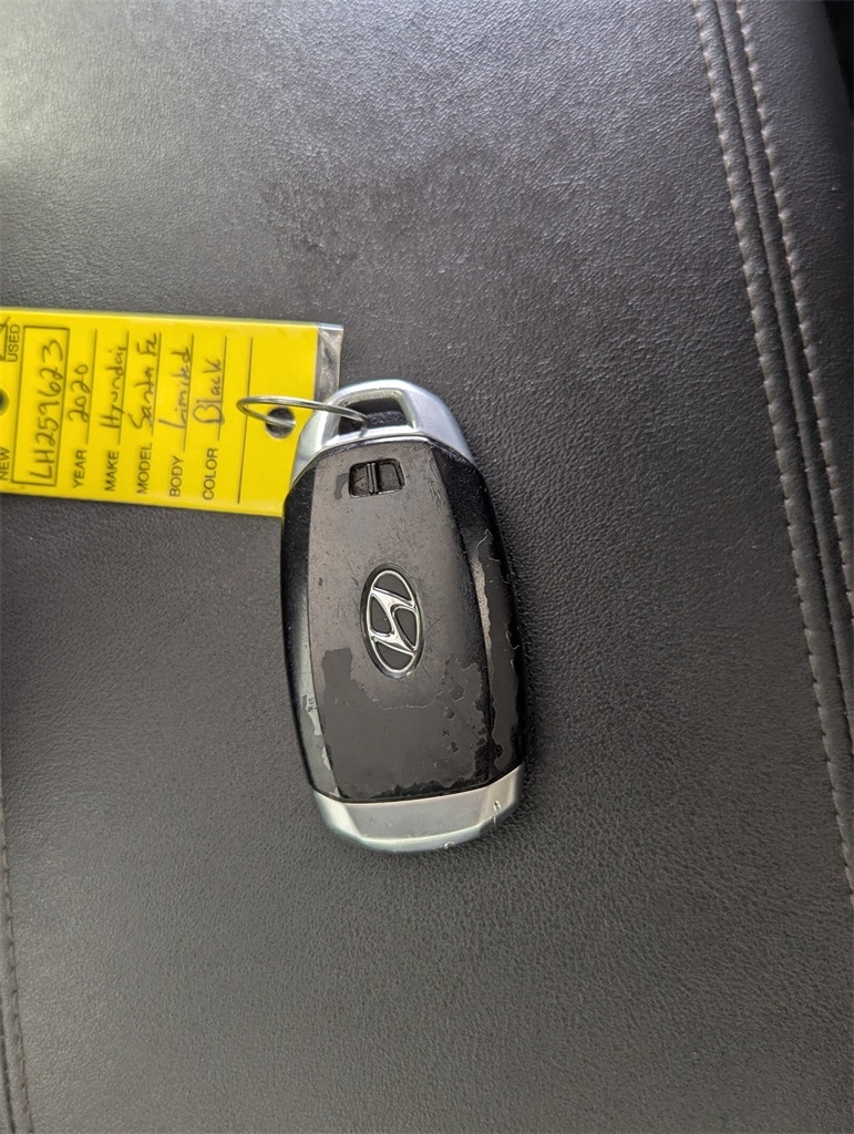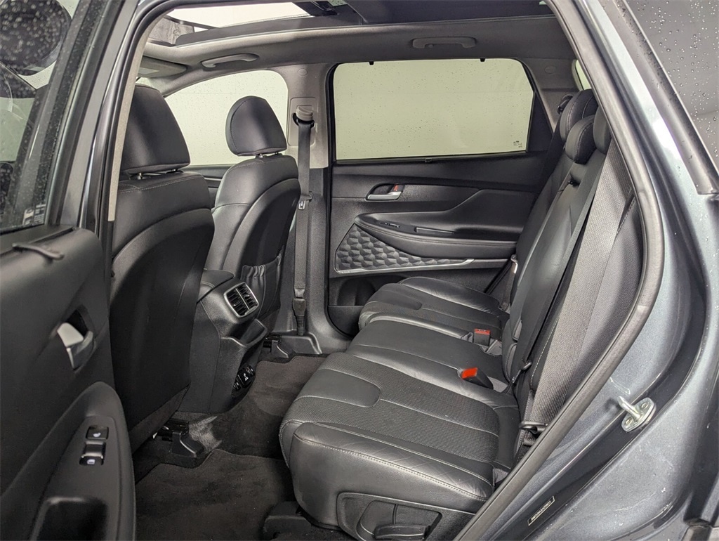 This Santa Fe is well equipped with Option Group 01, Black Leather, 12 Speakers, 4-Wheel Disc Brakes, ABS brakes, Air Conditioning, Alloy wheels, AM/FM radio: SiriusXM, Apple CarPlay & Android Auto, Auto High-beam Headlights, Auto-dimming Rear-View mirror, Automatic temperature control, Axle Ratio 3.320, Brake assist, Bumpers: body-color, Cargo Cover, Cargo Tray, Carpeted Floor Mats, Compass, Delay-off headlights, Driver door bin, Driver vanity mirror, Dual front impact airbags, Dual front side impact airbags, Electronic Stability Control, Emergency communication system, Four wheel independent suspension, Front anti-roll bar, Front Bucket Seats, Front Center Armrest, Front dual zone A/C, Front fog lights, Front reading lights, Fully automatic headlights, Garage door transmitter: HomeLink, Heads-Up Display, Heated & Ventilated Front Bucket Seats, Heated door mirrors, Heated front seats, Heated rear seats, Heated steering wheel, Illuminated entry, Leather Seating Surface, Leather Shift Knob, Leather steering wheel, Low tire pressure warning, Memory seat, Navigation System/ GPS, Occupant sensing airbag, Outside temperature display, Overhead airbag, Overhead console, Panic alarm, Passenger door bin, Passenger vanity mirror, Power door mirrors, Power driver seat, Power Liftgate, Power moonroof, Power passenger seat, Power steering, Power windows, Radio: Infinity Premium AM/FM/MP3 Display Audio, Rain sensing wipers, Rear anti-roll bar, Rear Parking Sensors, Rear seat center armrest, Rear window defroster, Rear window wiper, Remote keyless entry, Security system, Speed control, Speed-sensing steering, Split folding rear seat, Spoiler, Steering wheel mounted audio controls, Tachometer, Telescoping steering wheel, Tilt steering wheel, Traction control, Trip computer, Turn signal indicator mirrors, Variably intermittent wipers, Ventilated front seats, and Wheels: 19" x 7.5J Alloy.