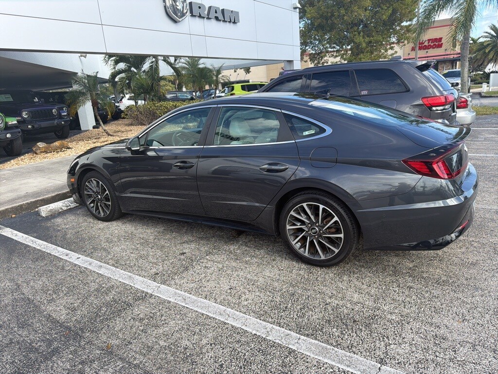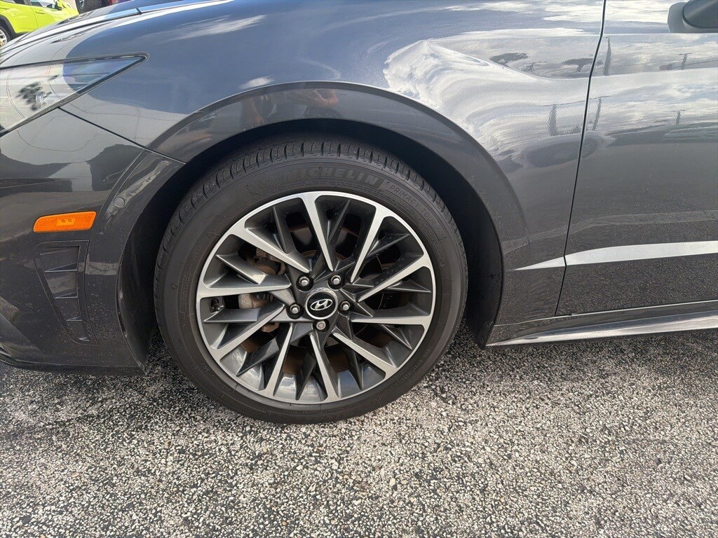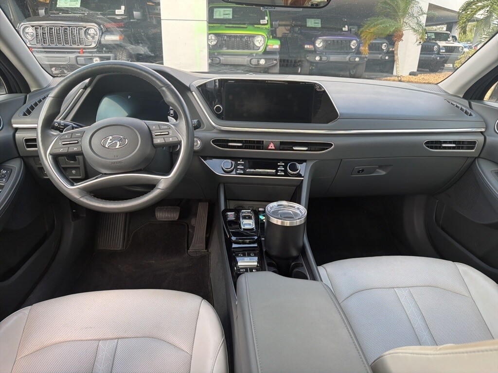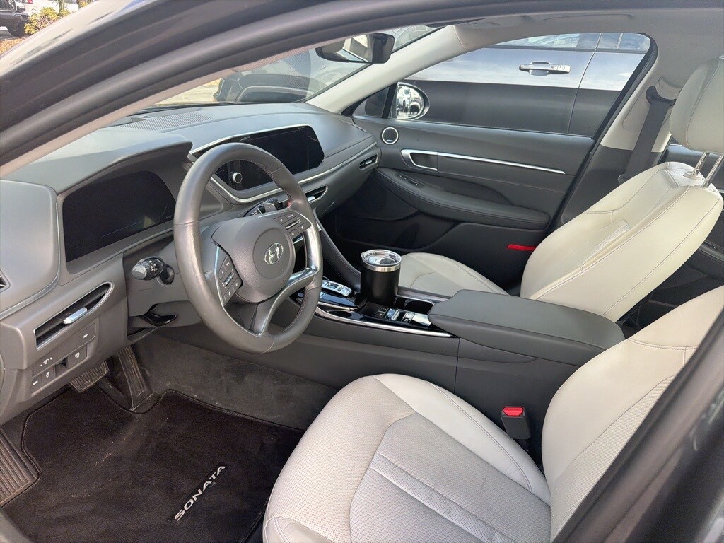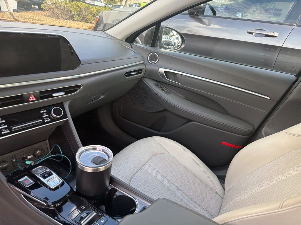 This Sonata is well equipped with Blue Link Connected Care & Remote Package, Option Group 01, Dark Gray Leather, 12 Speakers, 4-Wheel Disc Brakes, ABS brakes, Air Conditioning, Alloy wheels, AM/FM radio: SiriusXM, Apple CarPlay & Android Auto, Auto High-beam Headlights, Auto-dimming Rear-View mirror, Automatic temperature control, Bose Premium Audio, Brake assist, Bumpers: body-color, Cargo Net, Carpeted Floor Mats, Delay-off headlights, Driver door bin, Driver vanity mirror, Dual front impact airbags, Dual front side impact airbags, Electronic Stability Control, Emergency communication system: Blue Link Connected Care (3-year subscription), First Aid Kit, Four wheel independent suspension, Front anti-roll bar, Front Bucket Seats, Front Center Armrest, Front dual zone A/C, Front reading lights, Fully automatic headlights, Garage door transmitter: HomeLink, Heads-Up Display, Heated door mirrors, Heated front seats, Heated steering wheel, Heated/Ventilated Front Bucket Seats, Illuminated entry, Knee airbag, Leather Seating Surfaces, Low tire pressure warning, Memory seat, Navigation System/ GPS, Occupant sensing airbag, Outside temperature display, Overhead airbag, Overhead console, Panic alarm, Passenger door bin, Passenger vanity mirror, Power door mirrors, Power driver seat, Power moonroof, Power passenger seat, Power steering, Power windows, Radio data system, Radio: AM/FM/MP3/HD/SiriusXM Display Audio w/Nav, Rain sensing wipers, Rear anti-roll bar, Rear seat center armrest, Rear side impact airbag, Rear window defroster, Remote keyless entry, Security system, Speed control, Speed-sensing steering, Speed-Sensitive Wipers, Split folding rear seat, Steering wheel mounted audio controls, Tachometer, Telescoping steering wheel, Tilt steering wheel, Traction control, Trip computer, Turn signal indicator mirrors, Variably intermittent wipers, Ventilated front seats, Wheel Locks, Wheels: 18 x 7.5J Machine/Argent Finish Alum Alloy, and Wireless Phone Charging.