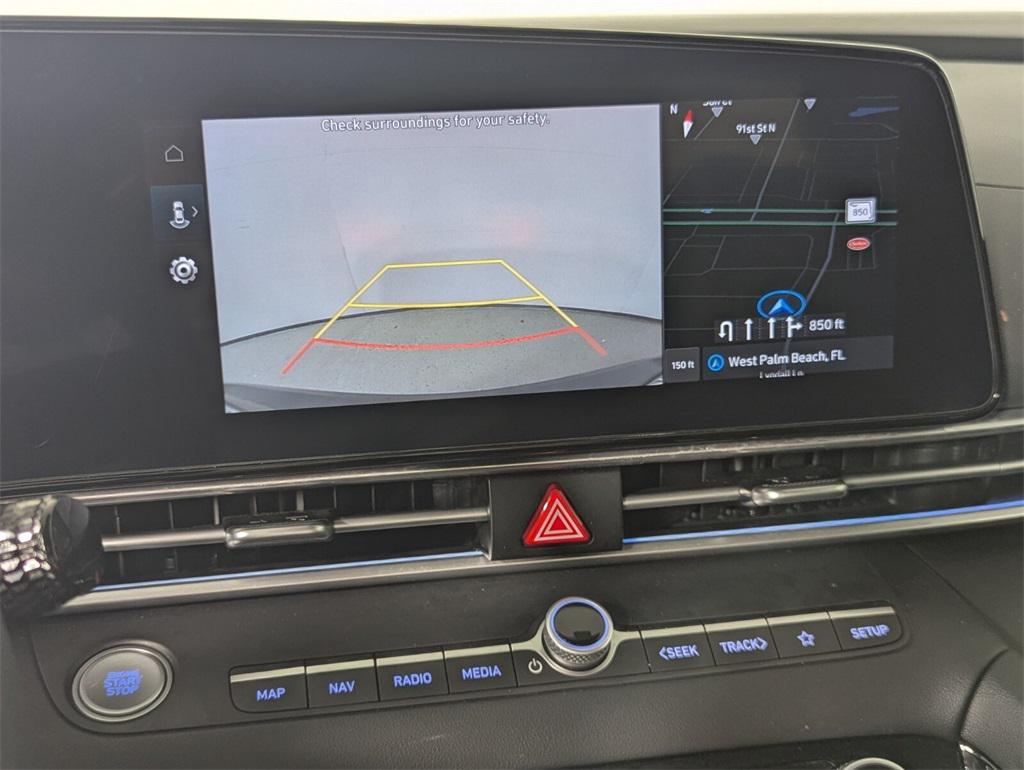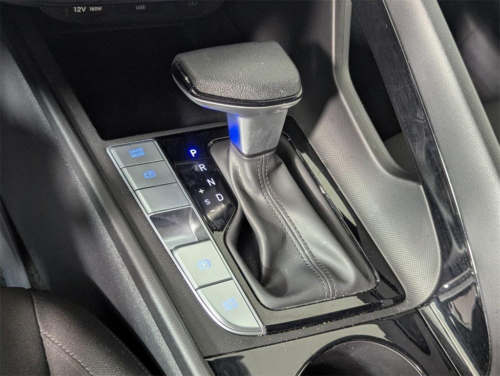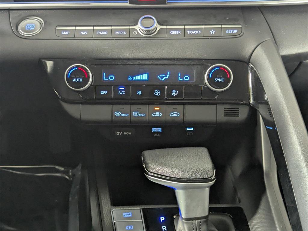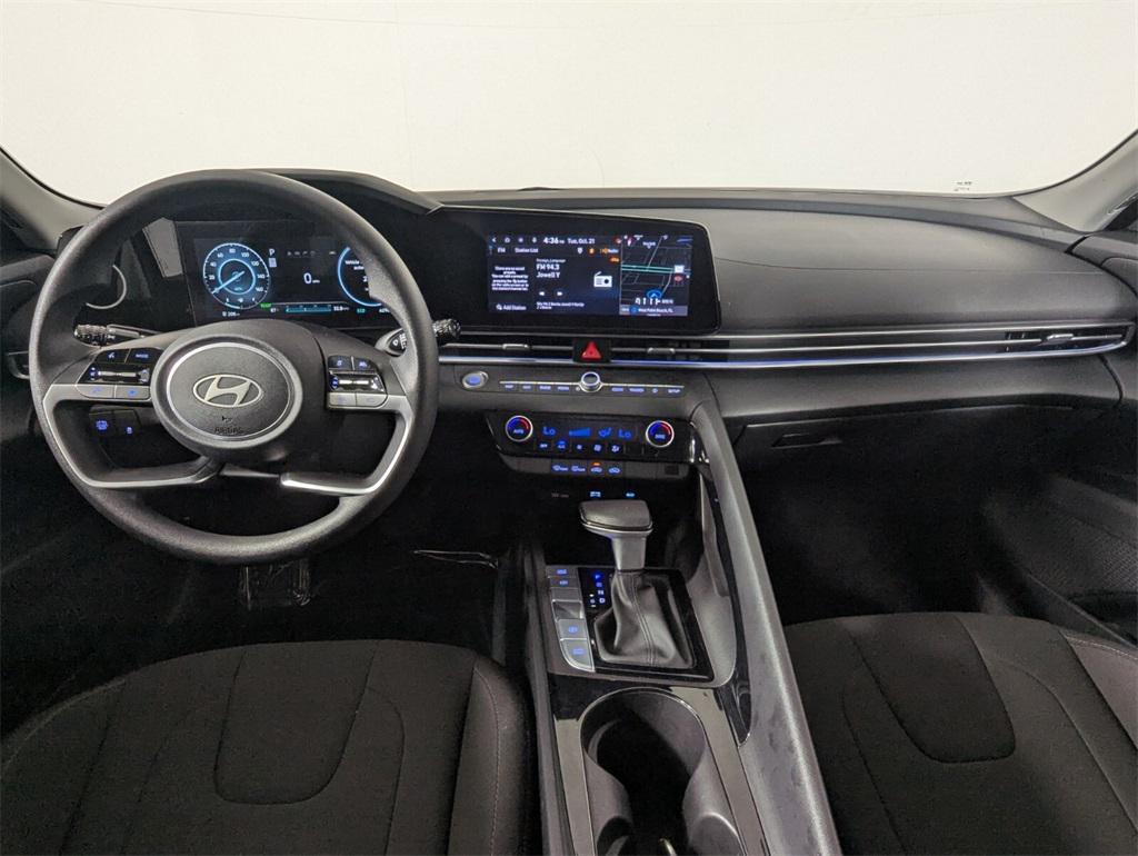 Features: Option Group 01, Elantra Hybrid Blue, 4D Sedan, I4, 6-Speed Dual Clutch, FWD, Abyss Black, Black Cloth, 16" x 6.5J Alloy Wheels, 4-Wheel Disc Brakes, 6 Speakers, ABS brakes, Air Conditioning, Alloy wheels, AM/FM radio: SiriusXM, Apple CarPlay & Android Auto, Auto High-beam Headlights, Automatic temperature control, Brake assist, Bumpers: body-color, Cargo Net, Carpeted Floor Mats, Delay-off headlights, Driver door bin, Driver vanity mirror, Dual front impact airbags, Dual front side impact airbags, Electronic Stability Control, Emergency communication system: Bluelink+, Exterior Parking Camera Rear, First Aid Kit, Front anti-roll bar, Front Bucket Seats, Front Center Armrest, Front dual zone A/C, Front reading lights, Front wheel independent suspension, Fully automatic headlights, Heated door mirrors, Illuminated entry, Low tire pressure warning, Navigation System, Occupant sensing airbag, Outside temperature display, Overhead airbag, Overhead console, Panic alarm, Passenger door bin, Passenger vanity mirror, Power door mirrors, Power steering, Power windows, Premium Cloth Seat Trim, Radio: AM/FM/HD/SiriusXM Display Audio, Rear side impact airbag, Rear window defroster, Remote keyless entry, Reversible Cargo Tray, Security system, Speed control, Speed-sensing steering, Steering wheel mounted audio controls, Tachometer, Telescoping steering wheel, Tilt steering wheel, Traction control, Trip computer, Variably intermittent wipers, and Wheel Locks.