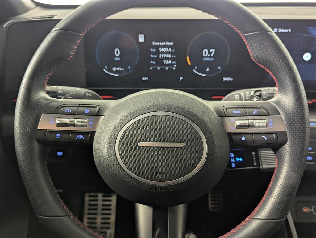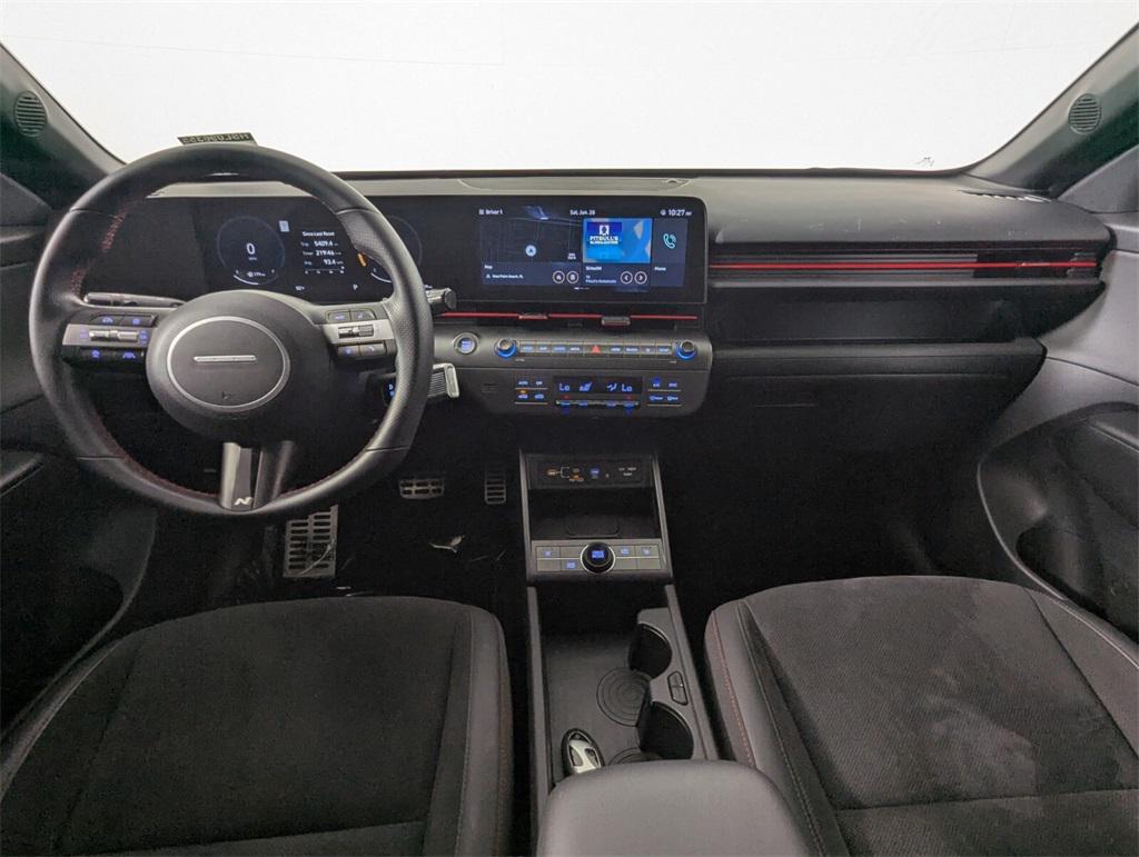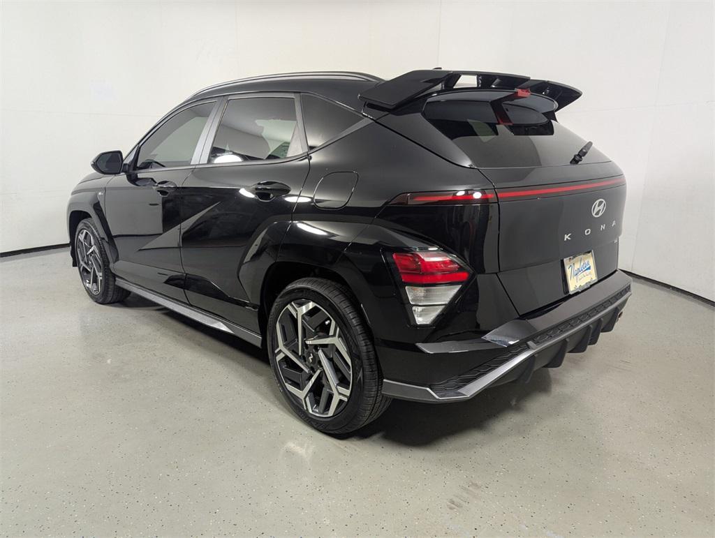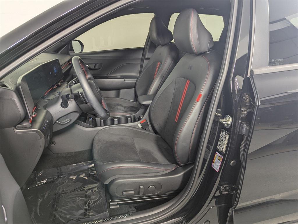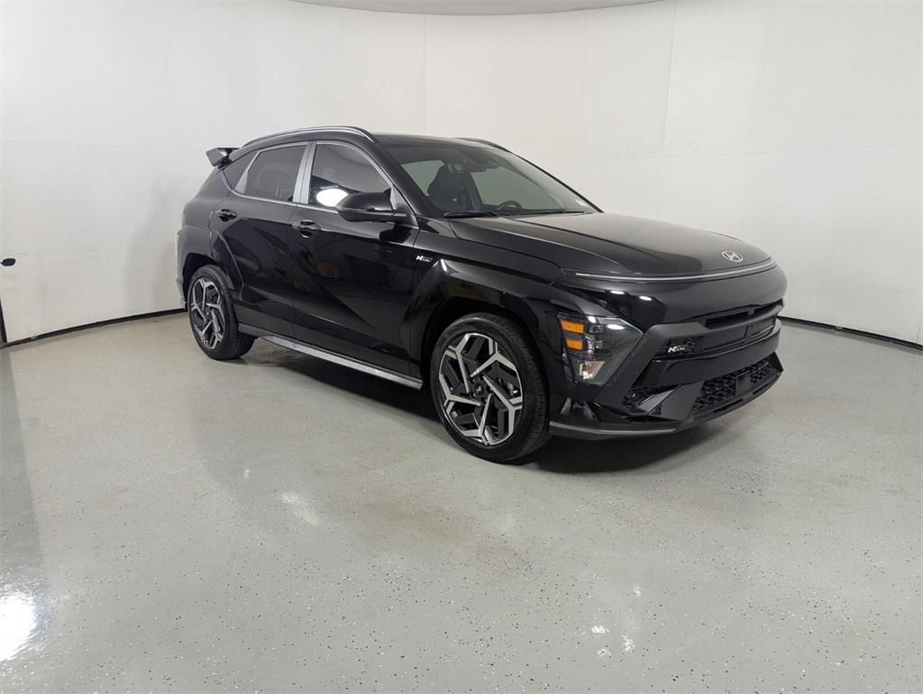 Features: Option Group 01, Kona N Line, 4D Sport Utility, I4, 8-Speed Automatic, FWD, Abyss Black Pearl, Black Artificial Leather, 3.510 Axle Ratio, 4-Wheel Disc Brakes, 8 Speakers, ABS brakes, Air Conditioning, Alloy wheels, AM/FM radio: SiriusXM, Apple CarPlay & Android Auto, Auto High-beam Headlights, Auto-dimming Rear-View mirror, Automatic temperature control, Brake assist, Bumpers: body-color, Cargo Net, Cargo Tray, Carpeted Floor Mats, Column-Mounted Shift-By-Wire, Delay-off headlights, Driver door bin, Driver vanity mirror, Dual front impact airbags, Dual front side impact airbags, Electronic Stability Control, Emergency communication system: Bluelink+, Exterior Parking Camera Rear, Front anti-roll bar, Front Bucket Seats, Front Center Armrest, Front dual zone A/C, Front reading lights, Front wheel independent suspension, Fully automatic headlights, Heated door mirrors, Heated front seats, Heated Front Sport Bucket Seats, Illuminated entry, Leather Shift Knob, Leather steering wheel, Low tire pressure warning, N-Line Alcantara Sport Combination Seat Trim, Navigation System, Occupant sensing airbag, Outside temperature display, Overhead airbag, Panic alarm, Passenger door bin, Passenger vanity mirror, Power door mirrors, Power driver seat, Power moonroof, Power steering, Power windows, Radio: AM/FM/HD Radio/SiriusXM Audio System, Rear seat center armrest, Rear window defroster, Rear window wiper, Remote keyless entry, Security system, Speed control, Speed-sensing steering, Split folding rear seat, Spoiler, Steering wheel mounted audio controls, Tachometer, Telescoping steering wheel, Tilt steering wheel, Traction control, Trip computer, Turn signal indicator mirrors, Variably intermittent wipers, Wheel Locks, and Wheels: 19" x 7.5J Metallic Alloy.