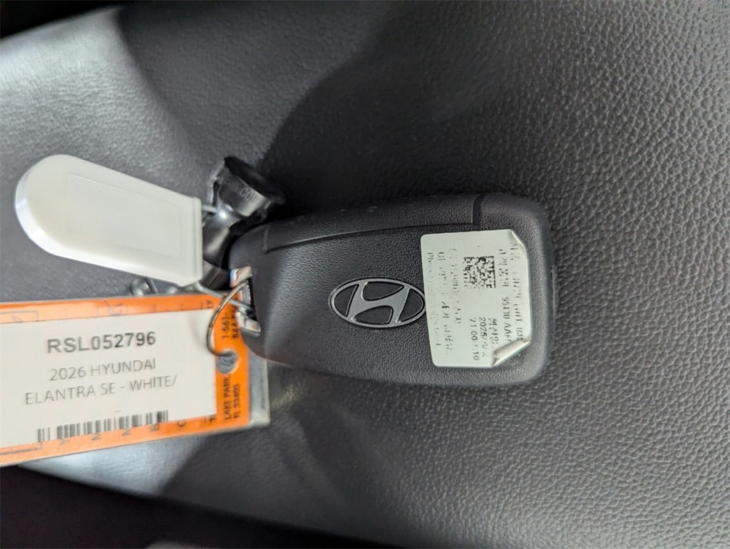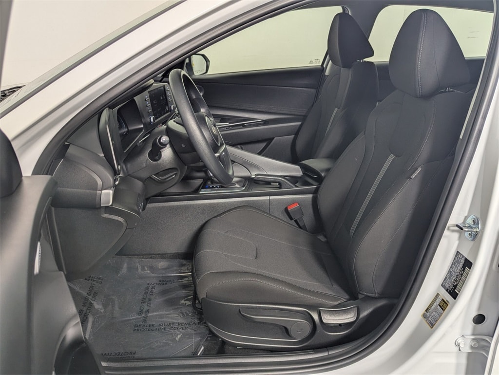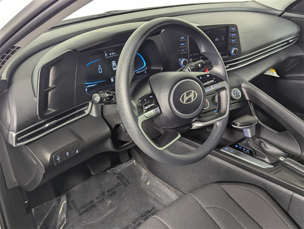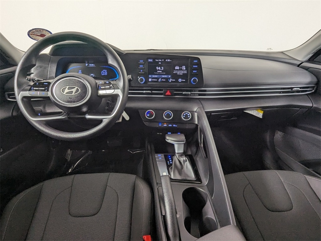 Features: Option Group 01, Elantra SE, 4D Sedan, I4, CVT, FWD, Serenity White, Black Cloth, 15" x 6.0J Alloy Wheels, 4-Wheel Disc Brakes, 6 Speakers, ABS brakes, Air Conditioning, Alloy wheels, AM/FM radio, Apple CarPlay & Android Auto, Auto High-beam Headlights, Brake assist, Bumpers: body-color, Cargo Net, Cargo Side Bins, Carpeted Floor Mats, Delay-off headlights, Driver door bin, Driver vanity mirror, Dual front impact airbags, Dual front side impact airbags, Electronic Stability Control, Exterior Parking Camera Rear, First Aid Kit, Front anti-roll bar, Front Bucket Seats, Front Center Armrest, Front reading lights, Front wheel independent suspension, Fully automatic headlights, Illuminated entry, Low tire pressure warning, Occupant sensing airbag, Outside temperature display, Overhead airbag, Overhead console, Panic alarm, Passenger door bin, Passenger vanity mirror, Power door mirrors, Power steering, Power windows, Premium Cloth Seat Trim, Radio: AM/FM/HD Display Audio, Rear side impact airbag, Rear window defroster, Remote keyless entry, Reversible Cargo Tray, Roadside Assistance Kit, Security system, Speed control, Speed-sensing steering, Steering wheel mounted audio controls, Tachometer, Telescoping steering wheel, Tilt steering wheel, Traction control, Trip computer, and Variably intermittent wipers.