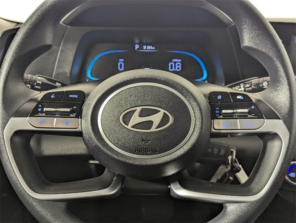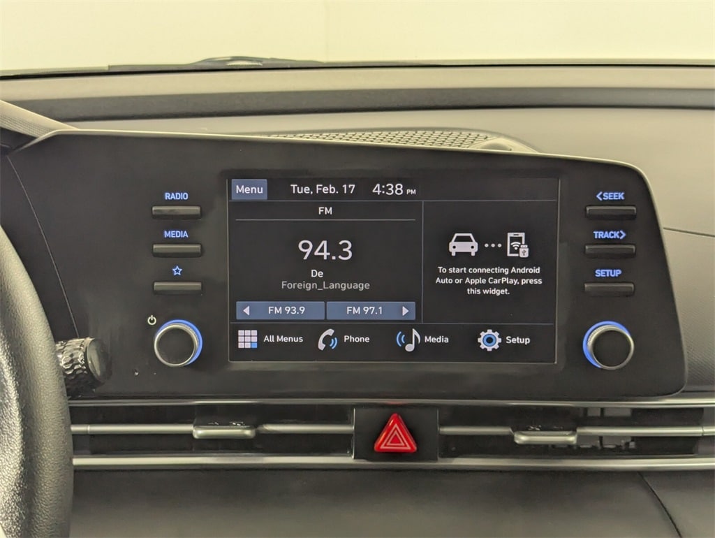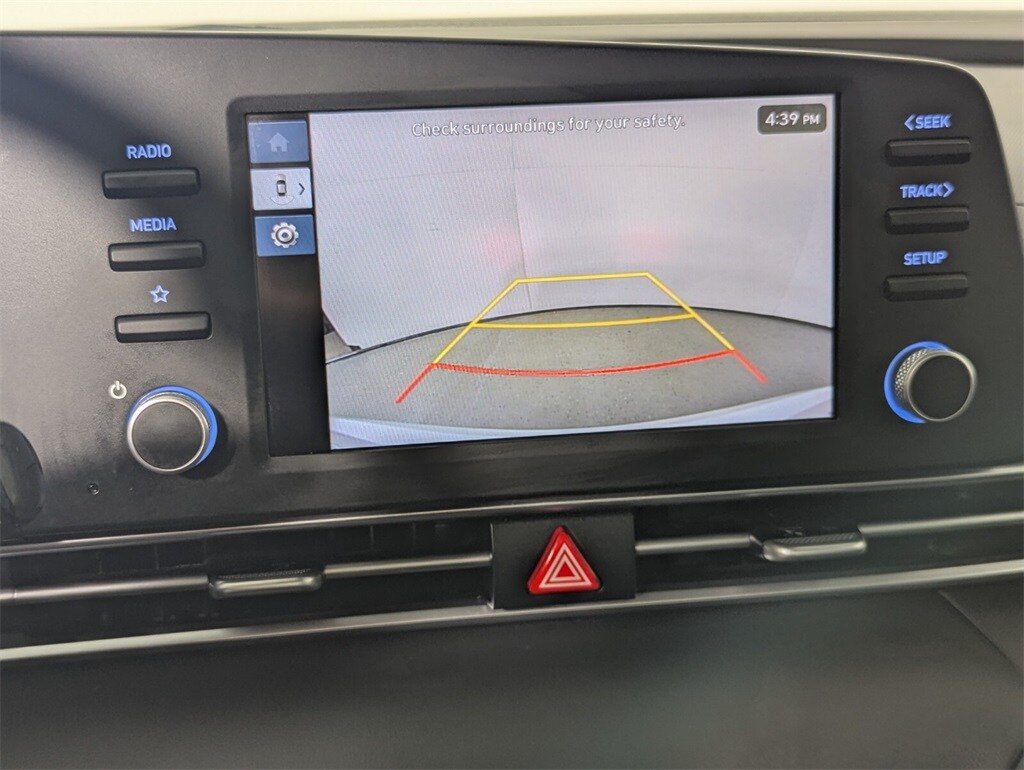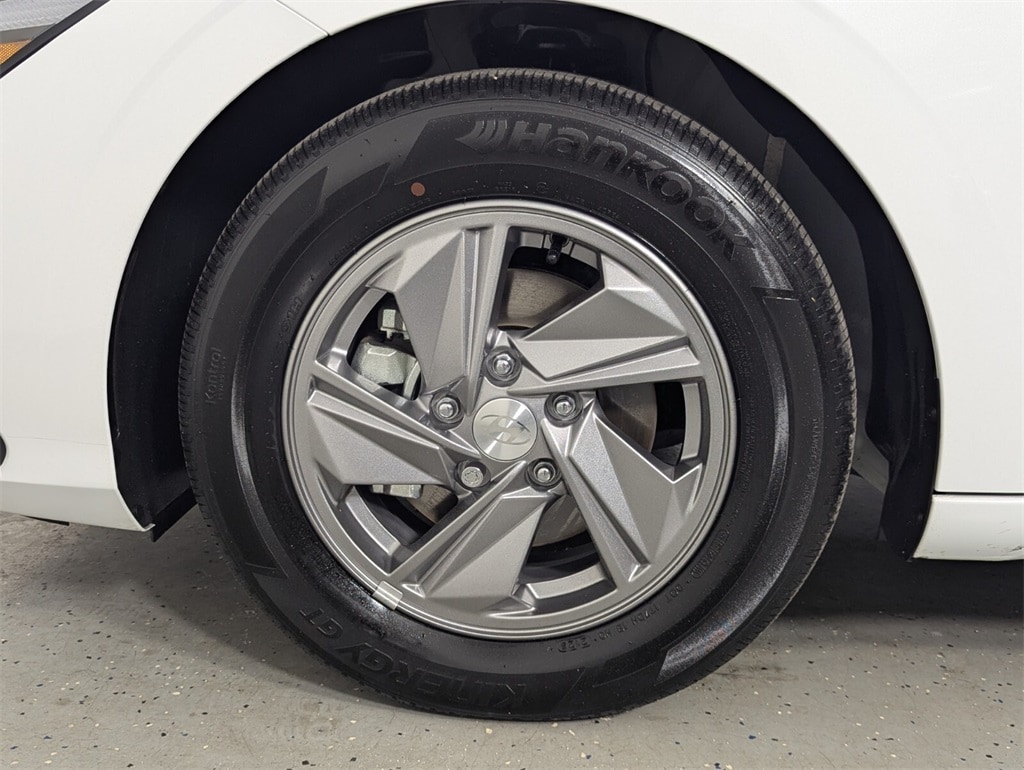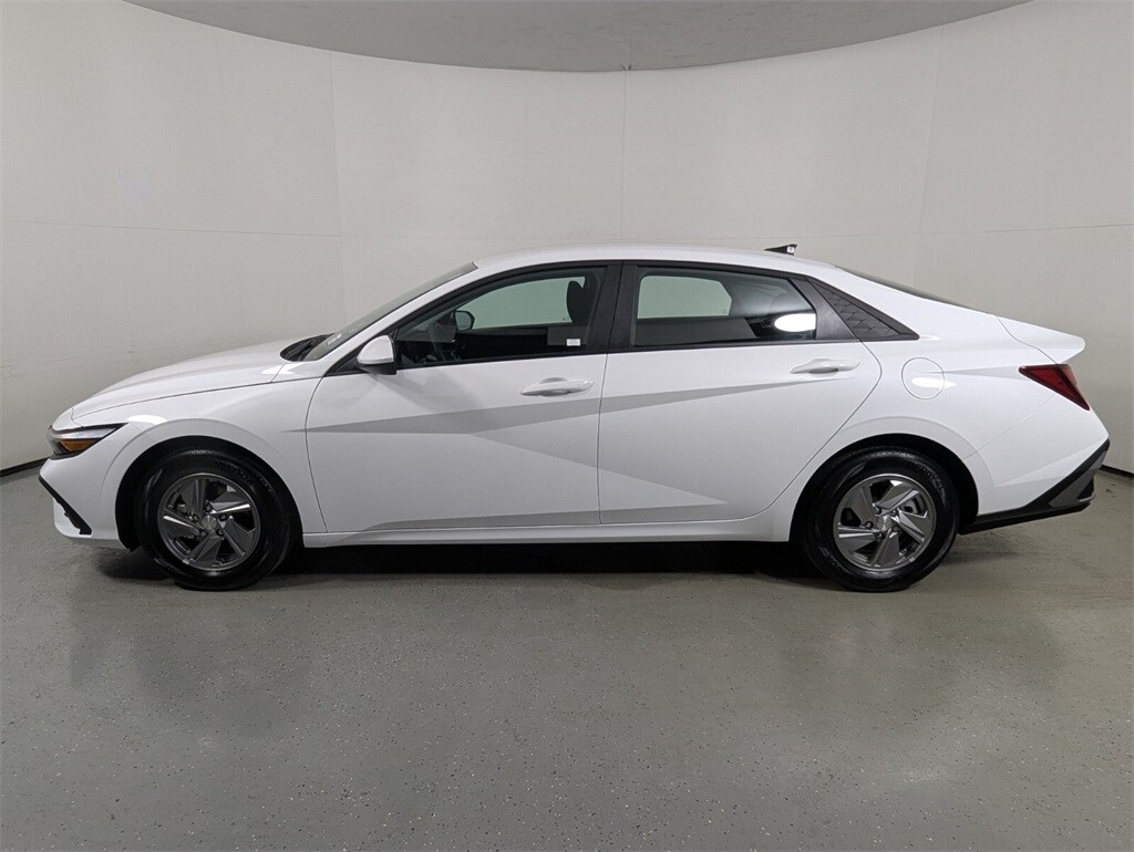 Features: Option Group 01, Elantra SE, 4D Sedan, I4, CVT, FWD, Serenity White, Black Cloth, 15" x 6.0J Alloy Wheels, 4-Wheel Disc Brakes, 6 Speakers, ABS brakes, Air Conditioning, Alloy wheels, AM/FM radio, Apple CarPlay & Android Auto, Auto High-beam Headlights, Brake assist, Bumpers: body-color, Cargo Net, Cargo Side Bins, Carpeted Floor Mats, Delay-off headlights, Driver door bin, Driver vanity mirror, Dual front impact airbags, Dual front side impact airbags, Electronic Stability Control, Exterior Parking Camera Rear, First Aid Kit, Front anti-roll bar, Front Bucket Seats, Front Center Armrest, Front reading lights, Front wheel independent suspension, Fully automatic headlights, Illuminated entry, Low tire pressure warning, Occupant sensing airbag, Outside temperature display, Overhead airbag, Overhead console, Panic alarm, Passenger door bin, Passenger vanity mirror, Power door mirrors, Power steering, Power windows, Premium Cloth Seat Trim, Radio: AM/FM/HD Display Audio, Rear side impact airbag, Rear window defroster, Remote keyless entry, Reversible Cargo Tray, Roadside Assistance Kit, Security system, Speed control, Speed-sensing steering, Steering wheel mounted audio controls, Tachometer, Telescoping steering wheel, Tilt steering wheel, Traction control, Trip computer, and Variably intermittent wipers.