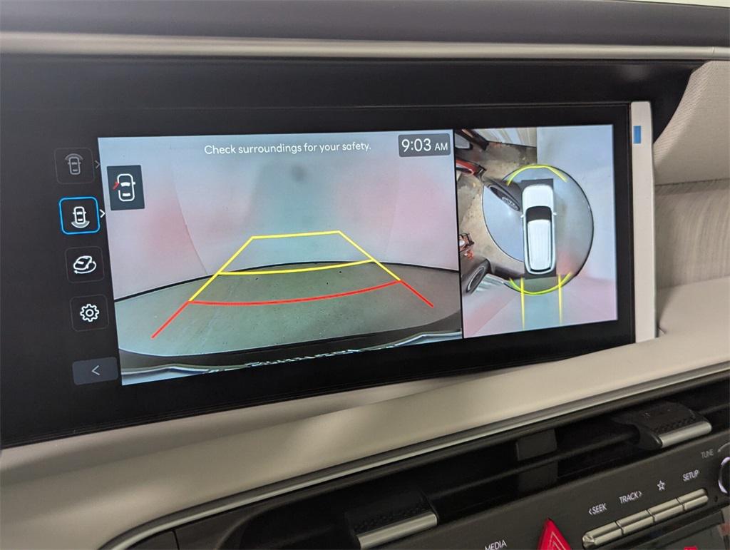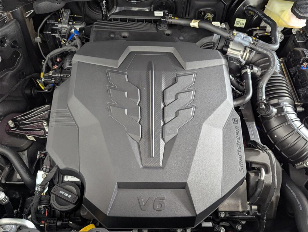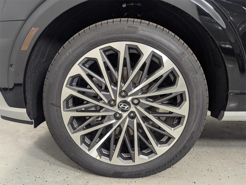 Features: Option Group 01, Palisade Calligraphy, 4D Sport Utility, V6, 8-Speed Automatic, FWD, Abyss Black Pearl, Gray/Navy Leather, 14 Speakers, 3rd row seats: split-bench, 4-Wheel Disc Brakes, ABS brakes, Air Conditioning, Alloy wheels, AM/FM radio: SiriusXM, Apple CarPlay & Android Auto, Audio memory, Auto High-beam Headlights, Auto-dimming door mirrors, Auto-dimming Rear-View mirror, Auto-leveling suspension, Automatic temperature control, Brake assist, Bumpers: body-color, Cargo Cover, Cargo Net, Cargo Tray, Carpeted Floor Mats, Compass, Delay-off headlights, Driver door bin, Driver vanity mirror, Dual front impact airbags, Dual front side impact airbags, Electronic Stability Control, Emergency communication system: Bluelink+, Exterior Parking Camera Rear, First Aid Kit, Four wheel independent suspension, Front anti-roll bar, Front Bucket Seats, Front Center Armrest, Front dual zone A/C, Front reading lights, Fully automatic headlights, Garage door transmitter: HomeLink, Genuine wood console insert, Genuine wood dashboard insert, Heads-Up Display, Heated & Ventilated Front Bucket Seats, Heated door mirrors, Heated front seats, Heated rear seats, Heated steering wheel, HVAC memory, Illuminated entry, Knee airbag, Leather steering wheel, Low tire pressure warning, Memory seat, Navigation System, Occupant sensing airbag, Outside temperature display, Overhead airbag, Overhead console, Panic alarm, Passenger door bin, Passenger vanity mirror, Power door mirrors, Power driver seat, Power Liftgate, Power moonroof, Power passenger seat, Power steering, Power windows, Premium Nappa Leather Seat Trim, Radio data system, Radio: Infotainment Navigation System, Rain sensing wipers, Rear air conditioning, Rear anti-roll bar, Rear audio controls, Rear reading lights, Rear side impact airbag, Rear window defroster, Rear window wiper, Reclining 3rd row seat, Remote keyless entry, Security system, Speed control, Split folding rear seat, Spoiler, Steering wheel mounted audio controls, Tachometer, Telescoping steering wheel, Tilt steering wheel, Traction control, Trip computer, Turn signal indicator mirrors, Variably intermittent wipers, Ventilated front seats, Ventilated rear seats, and Wheels: 21" x 8.5J Alloy.