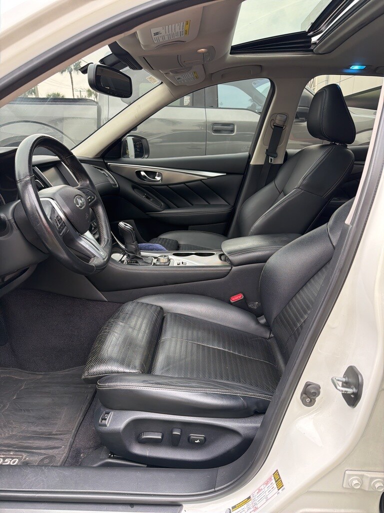 This Q50 is well equipped with All Weather Package (L93) (All-Season Floor Mats and Trunk Protector), Essential Package (3.0t SPORT) (60/40 Split-Folding Rear Seats, Heated Front Seats, Heated Steering Wheel, INFINITI InTouch Navigation System, and Remote Engine Start), 4-Wheel Disc Brakes, 6 Speakers, ABS brakes, Air Conditioning, Alloy wheels, AM/FM radio: SiriusXM, Anti-whiplash front head restraints, Auto-dimming door mirrors, Auto-dimming Rear-View mirror, Automatic temperature control, Brake assist, Bumpers: body-color, CD player, Compass, Delay-off headlights, Driver door bin, Driver vanity mirror, Dual front impact airbags, Dual front side impact airbags, Electronic Stability Control, Four wheel independent suspension, Front anti-roll bar, Front Bucket Seats, Front Center Armrest, Front dual zone A/C, Front fog lights, Front reading lights, Front Sport Seats, Fully automatic headlights, Garage door transmitter: HomeLink, Heated door mirrors, Illuminated entry, Leather Shift Knob, Leather steering wheel, Low tire pressure warning, Memory seat, Occupant sensing airbag, Outside temperature display, Overhead airbag, Overhead console, Panic alarm, Passenger door bin, Passenger vanity mirror, Power door mirrors, Power driver seat, Power moonroof, Power passenger seat, Power steering, Power windows, Radio data system, Radio: AM/FM/CD w/MP3 Playback Capability, Rain sensing wipers, Rear anti-roll bar, Rear reading lights, Rear seat center armrest, Rear window defroster, Remote keyless entry, Security system, Speed control, Speed-sensing steering, Speed-Sensitive Wipers, Splash Guards, Sport Leather-Appointed Seating Surfaces, Sport steering wheel, Steering wheel memory, Steering wheel mounted audio controls, Tachometer, Telescoping steering wheel, Tilt steering wheel, Traction control, Trip computer, Turn signal indicator mirrors, Variably intermittent wipers, and Wheels: 19" x 8.5" Aluminum-Alloy Sport.