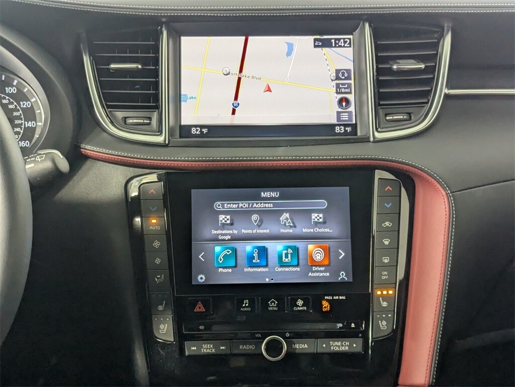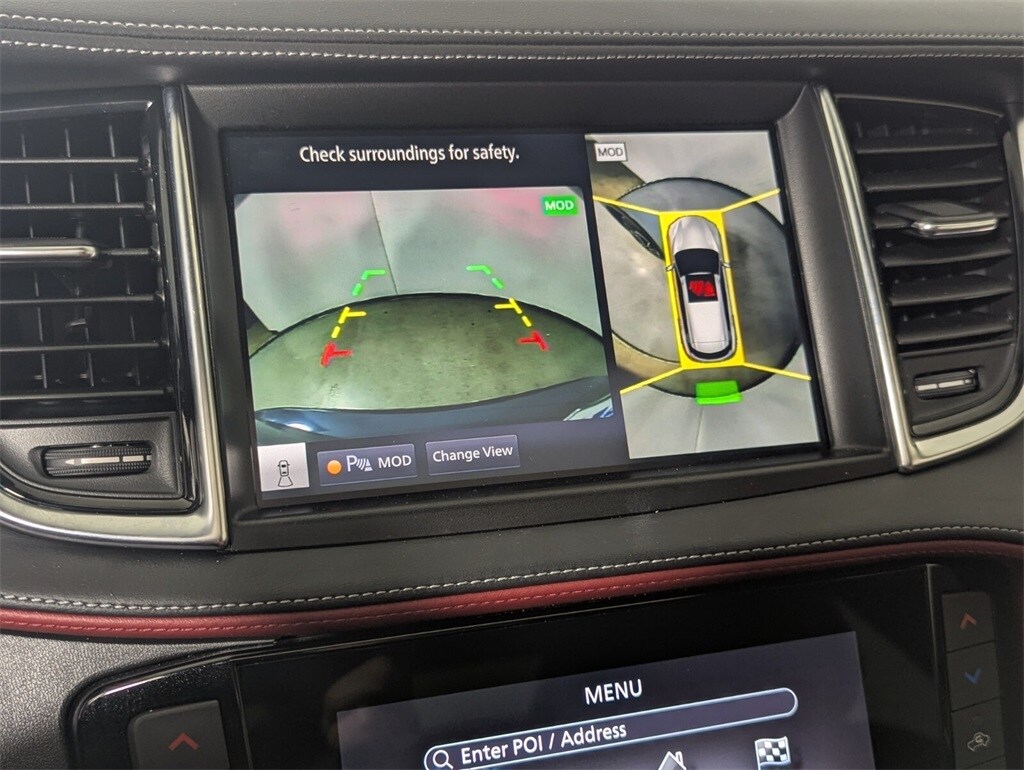 Features: 12 Speakers, 4-Wheel Disc Brakes, 5.846 Axle Ratio, ABS brakes, Air Conditioning, Alloy wheels, AM/FM radio: SiriusXM, Auto High-beam Headlights, Auto-dimming Rear-View mirror, Automatic temperature control, Bose Premium Audio System, Brake assist, Bumpers: body-color, CD player, Climate Controlled Front Bucket Seats, Delay-off headlights, Driver door bin, Driver vanity mirror, Dual front impact airbags, Dual front side impact airbags, Electronic Stability Control, Emergency communication system: INFINITI InTouch (1-year complimentary trial), Floor Mats, Four wheel independent suspension, Front anti-roll bar, Front Bucket Seats, Front Center Armrest, Front dual zone A/C, Front fog lights, Front reading lights, Fully automatic headlights, Garage door transmitter: HomeLink, Heated door mirrors, Heated front seats, Heated steering wheel, Illuminated entry, Illuminated Kick Plates, Knee airbag, Leather Shift Knob, Leather steering wheel, Literature Kit, Low tire pressure warning, Memory seat, Navigation system: INFINITI InTouch Navigation, Occupant sensing airbag, Outside temperature display, Overhead airbag, Overhead console, Panic alarm, Passenger door bin, Passenger vanity mirror, Power door mirrors, Power driver seat, Power Liftgate, Power moonroof, Power passenger seat, Power steering, Power windows, Radio data system, Rear anti-roll bar, Rear reading lights, Rear seat center armrest, Rear side impact airbag, Rear window defroster, Rear window wiper, Remote keyless entry, Security system, Semi-Aniline Leather-Appointed Seat Trim, Speed control, Speed-sensing steering, Speed-Sensitive Wipers, Splash Guards (Set of 4), Split folding rear seat, Spoiler, Steering wheel mounted audio controls, Tachometer, Telescoping steering wheel, Tilt steering wheel, Traction control, Trip computer, Turn signal indicator mirrors, Variably intermittent wipers, Ventilated front seats, and Wheels: 20" Black Painted Machine Finished.