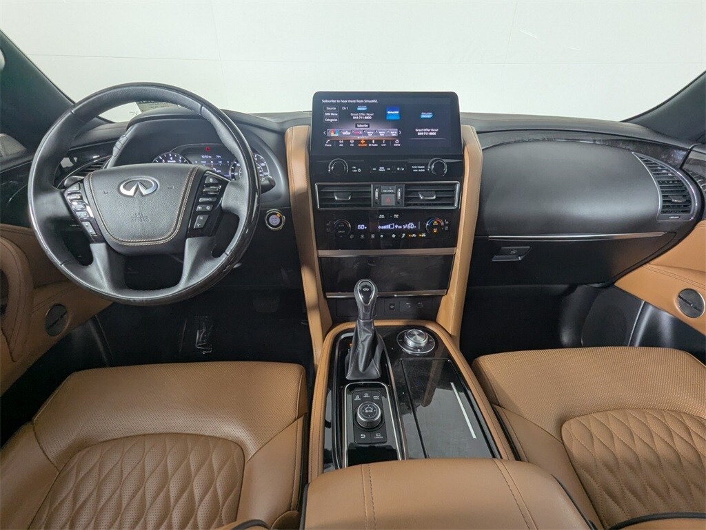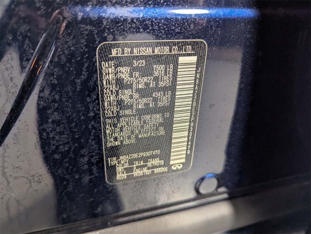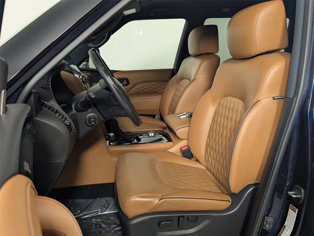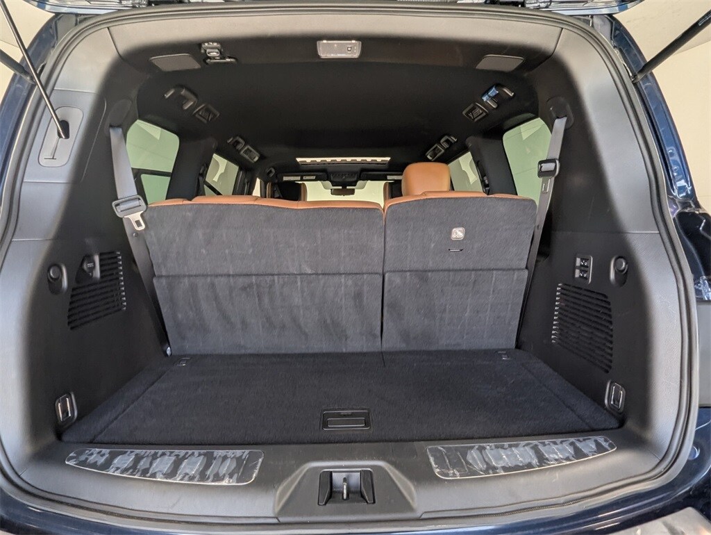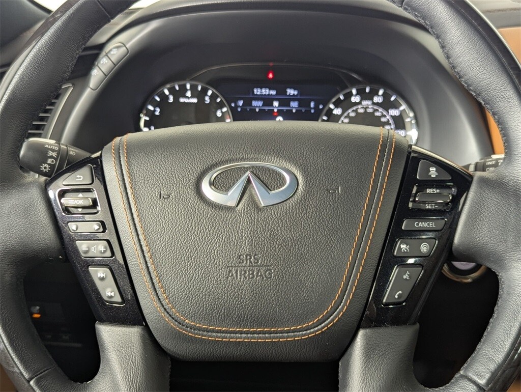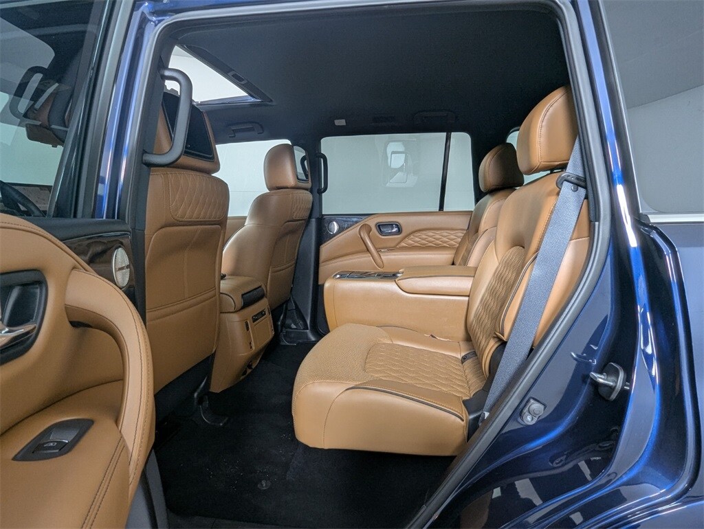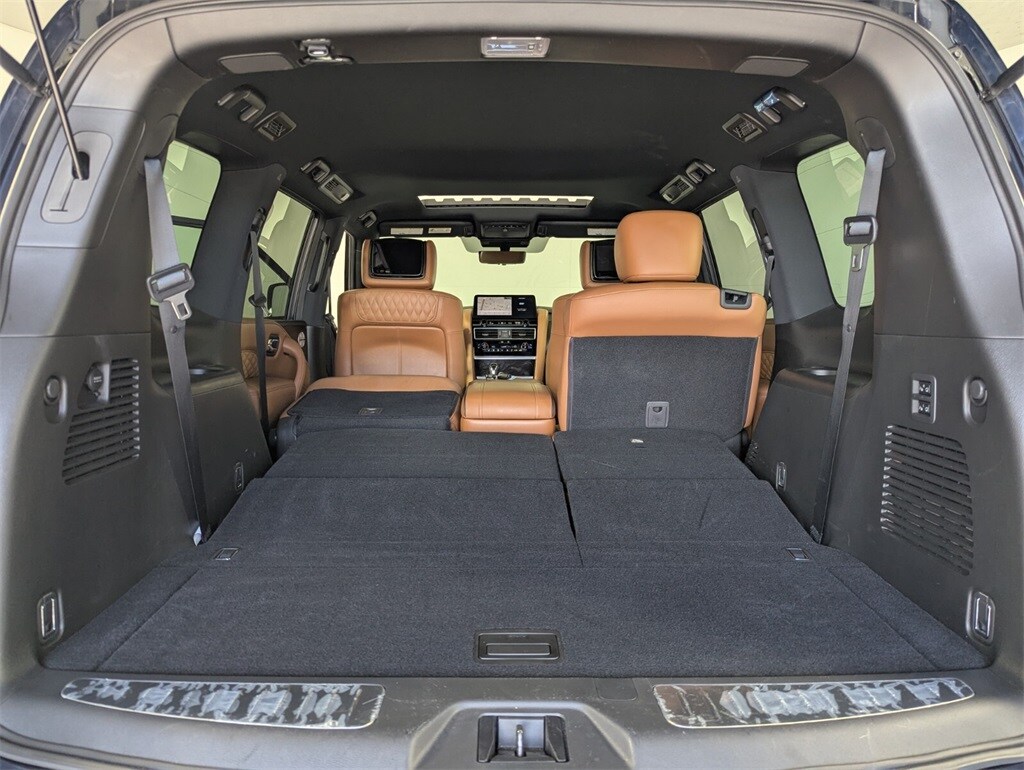 Features: Cargo Package (Cargo Net, Carpeted Cargo Mat, Center Console Tray, Console Net, and First-Aid Kit), 17 Speakers, 2.937 Axle Ratio, 3rd row seats: split-bench, 4-Wheel Disc Brakes, ABS brakes, Air Conditioning, Alloy wheels, AM/FM radio: SiriusXM, Anti-whiplash front head restraints, Auto High-beam Headlights, Auto tilt-away steering wheel, Auto-dimming door mirrors, Auto-dimming Rear-View mirror, Auto-leveling suspension, Automatic temperature control, Brake assist, Bumpers: body-color, Climate Controlled Front Bucket Seats, Compass, Delay-off headlights, Driver door bin, Driver vanity mirror, Dual front impact airbags, Dual front side impact airbags, Electronic Stability Control, Emergency communication system: INFINITI InTouch, Four wheel independent suspension, Front anti-roll bar, Front Bucket Seats, Front Center Armrest, Front dual zone A/C, Front fog lights, Front reading lights, Fully automatic headlights, Garage door transmitter: HomeLink, Heated door mirrors, Heated front seats, Heated rear seats, Heated steering wheel, Illuminated entry, INFINITI Radiant Illuminated Kick Plates, Leather Shift Knob, Leather steering wheel, Literature Kit, Low tire pressure warning, Memory seat, Midyear Change, Navigation system: INFINITI InTouch Navigation, Occupant sensing airbag, Outside temperature display, Overhead airbag, Overhead console, Panic alarm, Passenger door bin, Passenger vanity mirror, Perforated Semi-Aniline Leather-Appointed Seats, Power door mirrors, Power driver seat, Power Liftgate, Power moonroof, Power passenger seat, Power steering, Power windows, Premium audio system: Bose, Radio data system, Radio: Bose Performance Audio System w/17 Speakers, Rain sensing wipers, Rear air conditioning, Rear anti-roll bar, Rear reading lights, Rear seat center armrest, Rear window defroster, Rear window wiper, Rear-Seat Entertainment, Reclining 3rd row seat, Remote keyless entry, Roof Rail Cross Bars, Security system, Speed control, Speed-sensing steering, Split folding rear seat, Spoiler, Steering wheel memory, Steering wheel mounted audio controls, Tachometer, Telescoping steering wheel, Tilt steering wheel, Traction control, Trip computer, Turn signal indicator mirrors, Variably intermittent wipers, Ventilated front seats, Voltmeter, and Wheels: 22" x 8.0" Dark Chrome Cast Aluminum-Alloy.