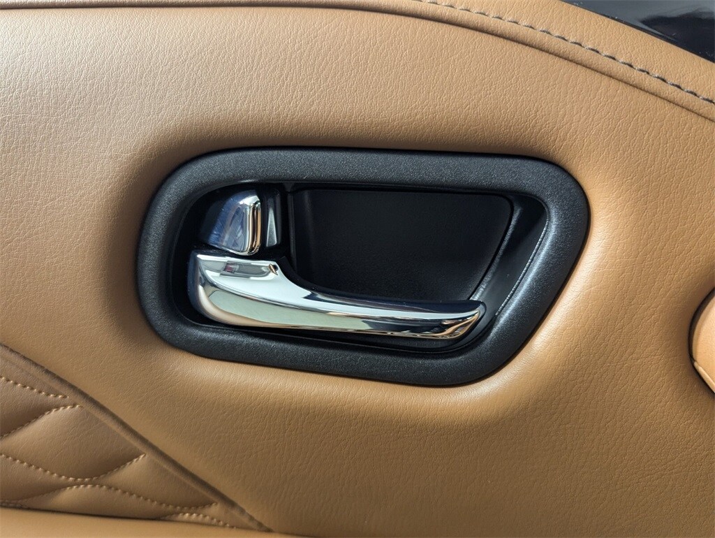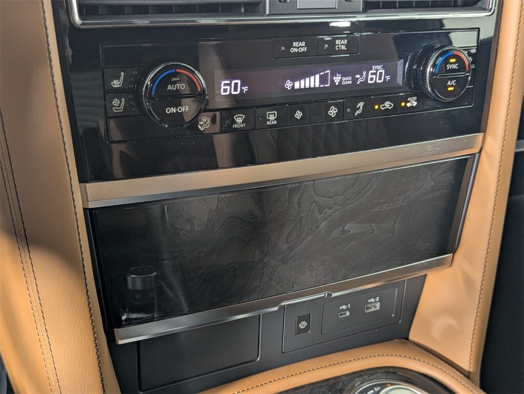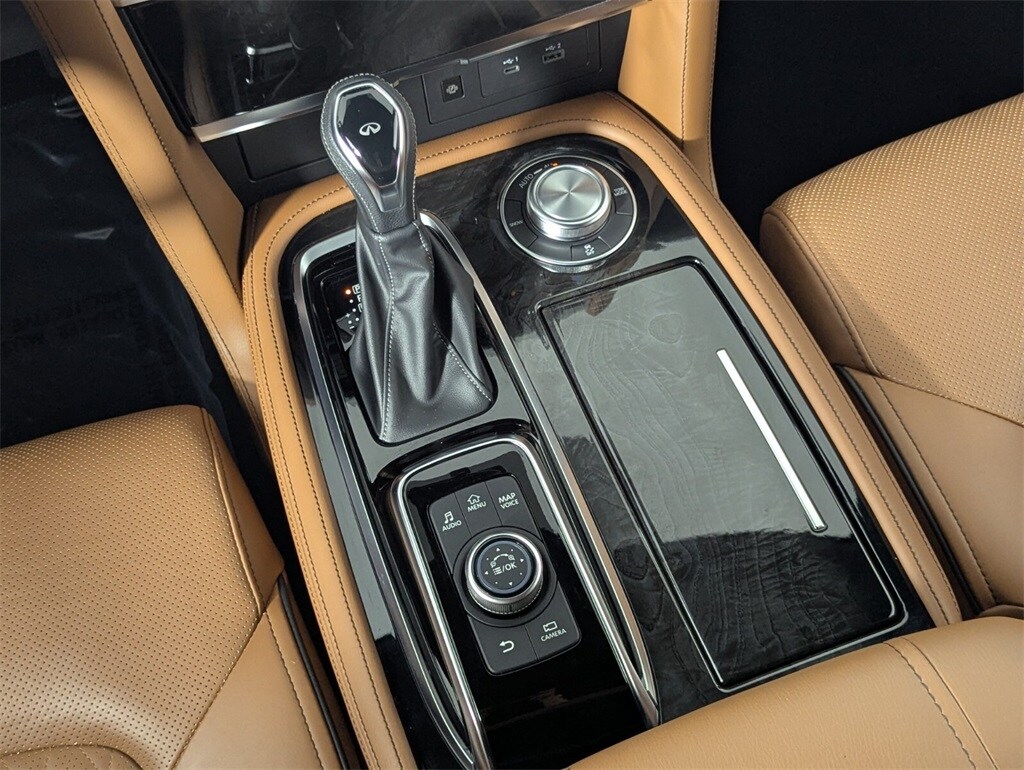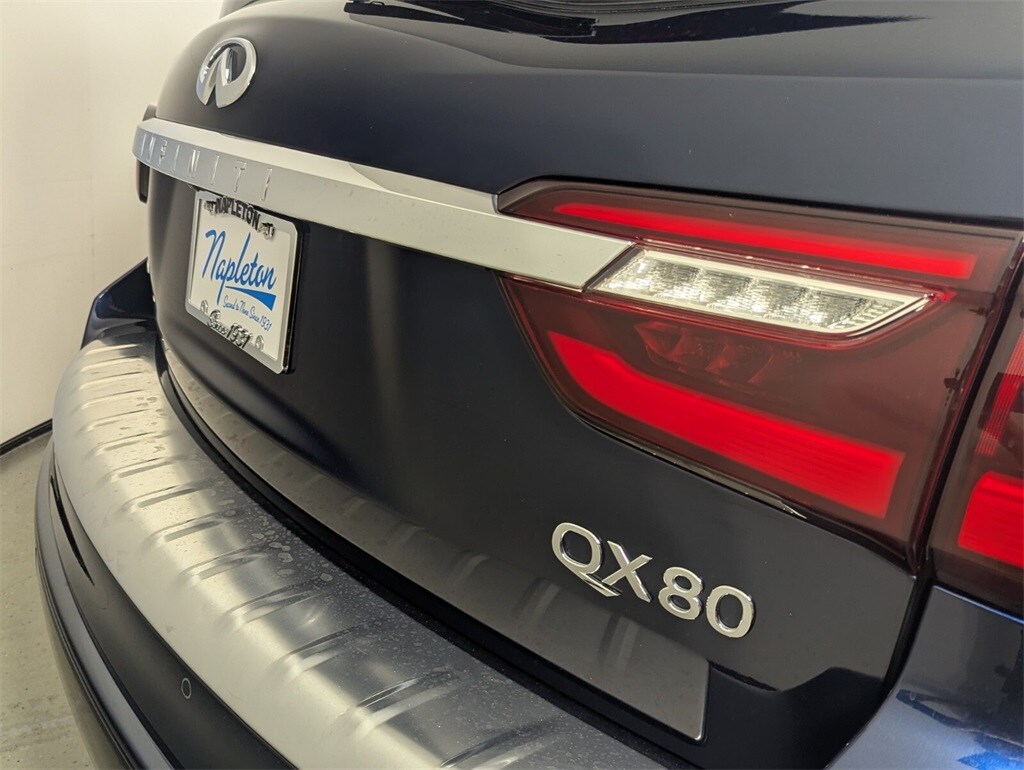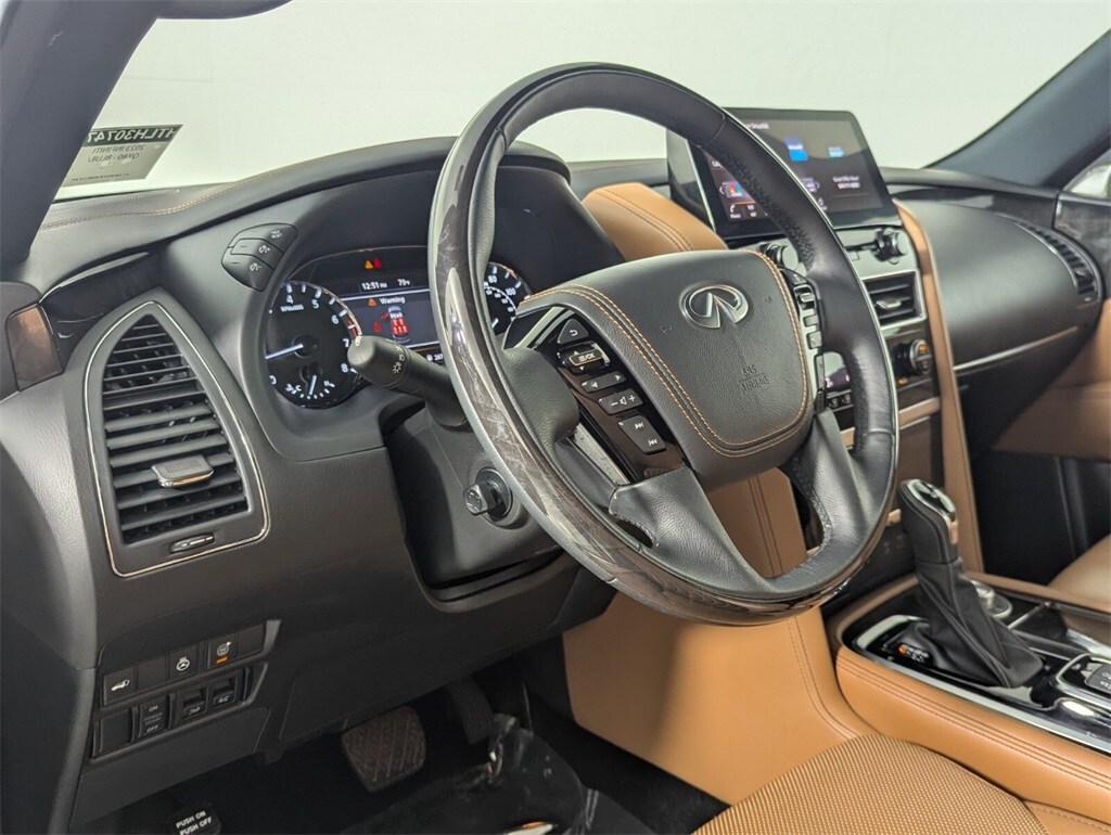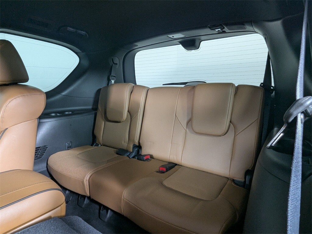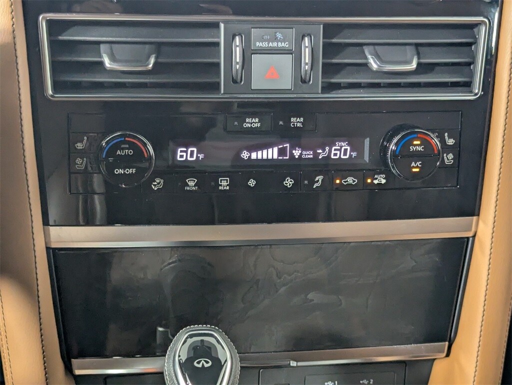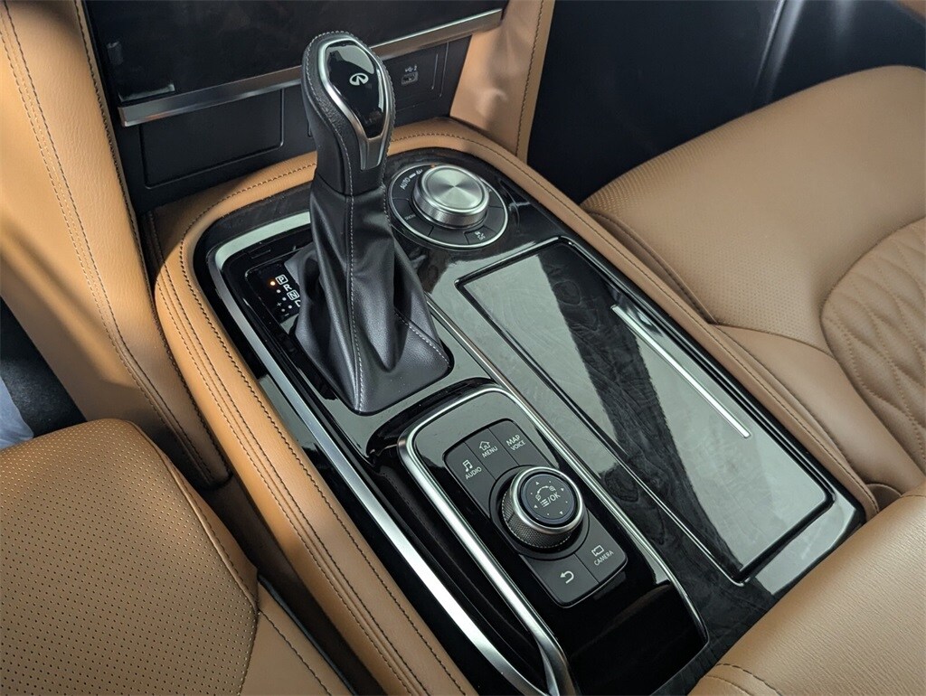 Features: Cargo Package (Cargo Net, Carpeted Cargo Mat, Center Console Tray, Console Net, and First-Aid Kit), 17 Speakers, 2.937 Axle Ratio, 3rd row seats: split-bench, 4-Wheel Disc Brakes, ABS brakes, Air Conditioning, Alloy wheels, AM/FM radio: SiriusXM, Anti-whiplash front head restraints, Auto High-beam Headlights, Auto tilt-away steering wheel, Auto-dimming door mirrors, Auto-dimming Rear-View mirror, Auto-leveling suspension, Automatic temperature control, Brake assist, Bumpers: body-color, Climate Controlled Front Bucket Seats, Compass, Delay-off headlights, Driver door bin, Driver vanity mirror, Dual front impact airbags, Dual front side impact airbags, Electronic Stability Control, Emergency communication system: INFINITI InTouch, Four wheel independent suspension, Front anti-roll bar, Front Bucket Seats, Front Center Armrest, Front dual zone A/C, Front fog lights, Front reading lights, Fully automatic headlights, Garage door transmitter: HomeLink, Heated door mirrors, Heated front seats, Heated rear seats, Heated steering wheel, Illuminated entry, INFINITI Radiant Illuminated Kick Plates, Leather Shift Knob, Leather steering wheel, Literature Kit, Low tire pressure warning, Memory seat, Midyear Change, Navigation system: INFINITI InTouch Navigation, Occupant sensing airbag, Outside temperature display, Overhead airbag, Overhead console, Panic alarm, Passenger door bin, Passenger vanity mirror, Perforated Semi-Aniline Leather-Appointed Seats, Power door mirrors, Power driver seat, Power Liftgate, Power moonroof, Power passenger seat, Power steering, Power windows, Premium audio system: Bose, Radio data system, Radio: Bose Performance Audio System w/17 Speakers, Rain sensing wipers, Rear air conditioning, Rear anti-roll bar, Rear reading lights, Rear seat center armrest, Rear window defroster, Rear window wiper, Rear-Seat Entertainment, Reclining 3rd row seat, Remote keyless entry, Roof Rail Cross Bars, Security system, Speed control, Speed-sensing steering, Split folding rear seat, Spoiler, Steering wheel memory, Steering wheel mounted audio controls, Tachometer, Telescoping steering wheel, Tilt steering wheel, Traction control, Trip computer, Turn signal indicator mirrors, Variably intermittent wipers, Ventilated front seats, Voltmeter, and Wheels: 22" x 8.0" Dark Chrome Cast Aluminum-Alloy.