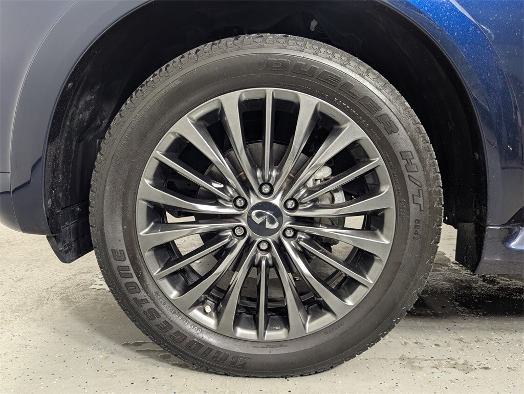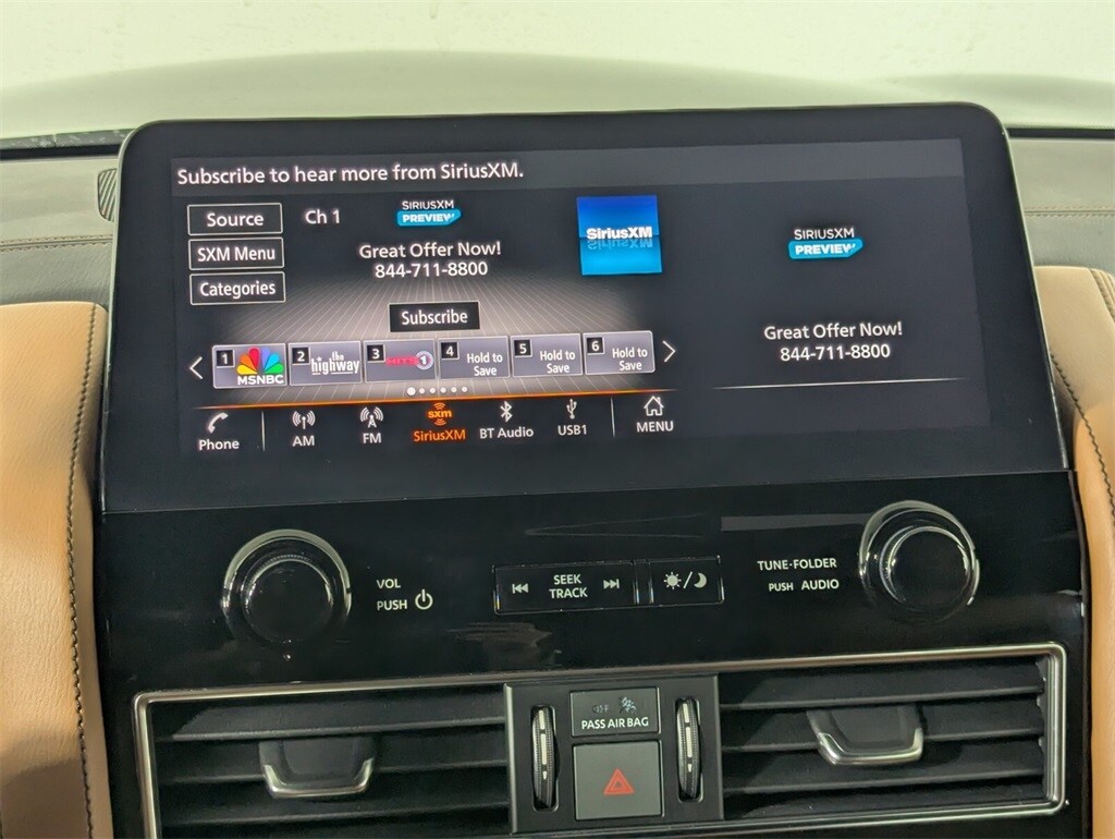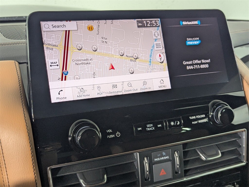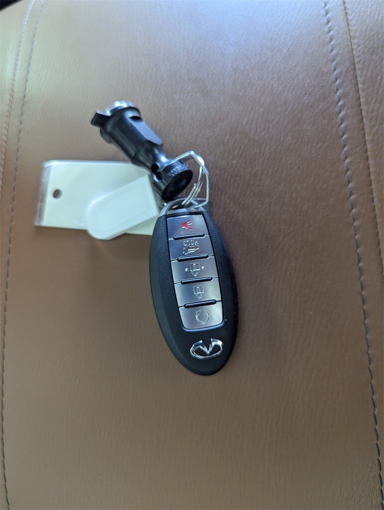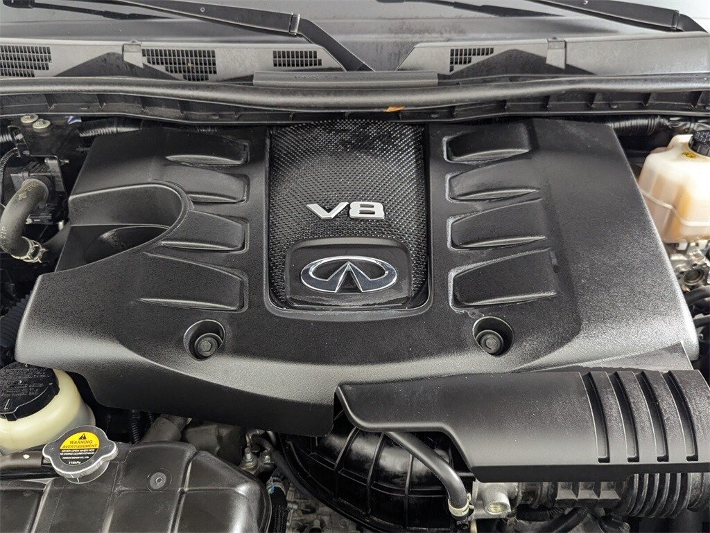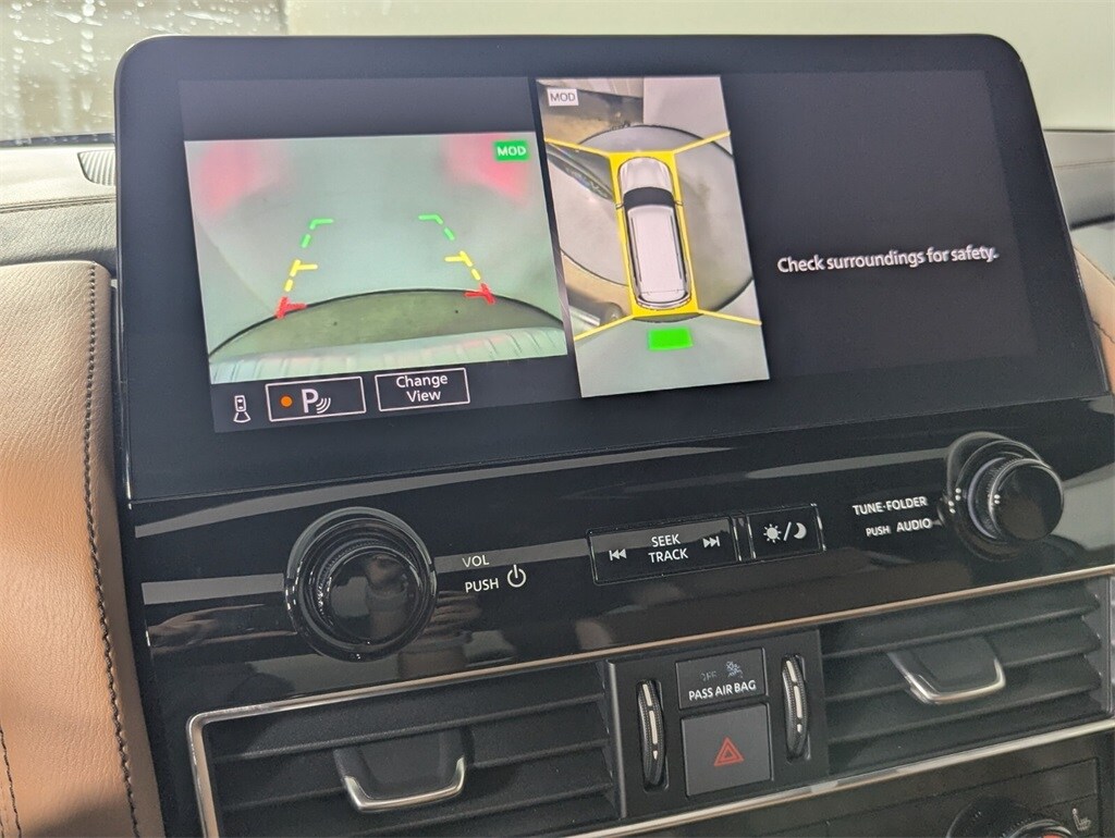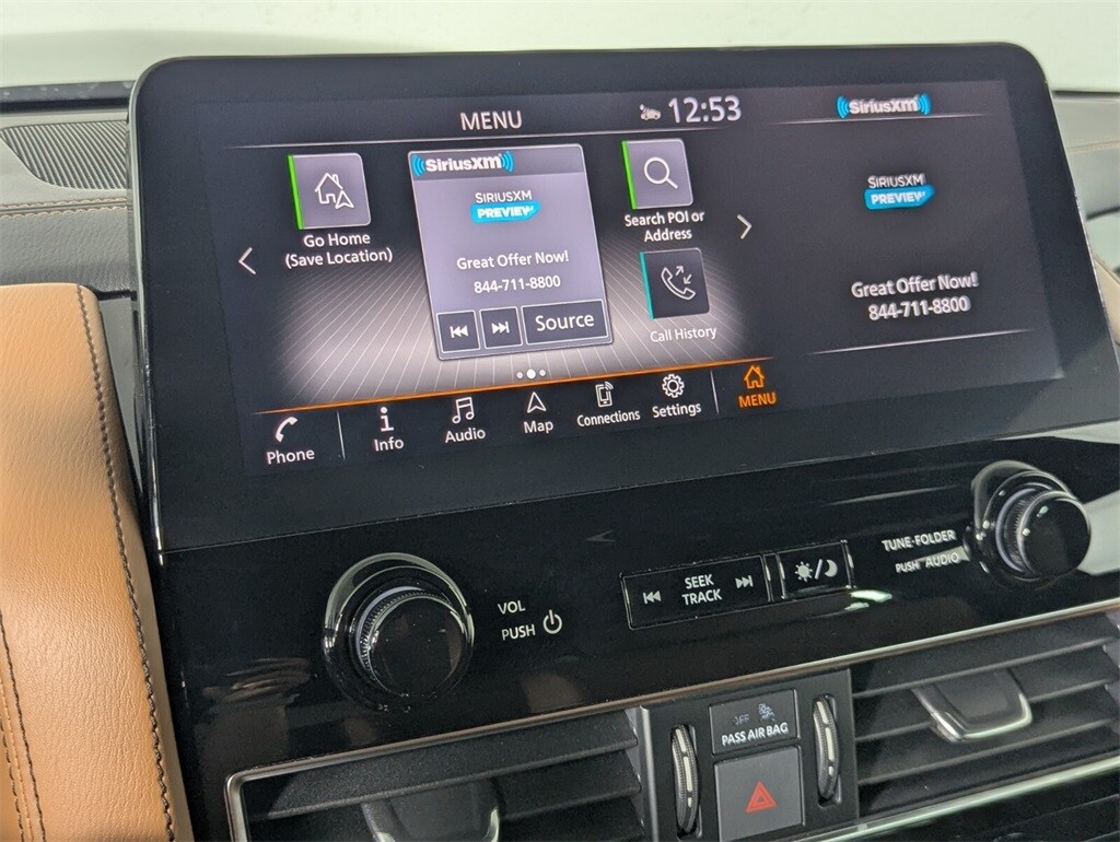 Features: Cargo Package (Cargo Net, Carpeted Cargo Mat, Center Console Tray, Console Net, and First-Aid Kit), 17 Speakers, 2.937 Axle Ratio, 3rd row seats: split-bench, 4-Wheel Disc Brakes, ABS brakes, Air Conditioning, Alloy wheels, AM/FM radio: SiriusXM, Anti-whiplash front head restraints, Auto High-beam Headlights, Auto tilt-away steering wheel, Auto-dimming door mirrors, Auto-dimming Rear-View mirror, Auto-leveling suspension, Automatic temperature control, Brake assist, Bumpers: body-color, Climate Controlled Front Bucket Seats, Compass, Delay-off headlights, Driver door bin, Driver vanity mirror, Dual front impact airbags, Dual front side impact airbags, Electronic Stability Control, Emergency communication system: INFINITI InTouch, Four wheel independent suspension, Front anti-roll bar, Front Bucket Seats, Front Center Armrest, Front dual zone A/C, Front fog lights, Front reading lights, Fully automatic headlights, Garage door transmitter: HomeLink, Heated door mirrors, Heated front seats, Heated rear seats, Heated steering wheel, Illuminated entry, INFINITI Radiant Illuminated Kick Plates, Leather Shift Knob, Leather steering wheel, Literature Kit, Low tire pressure warning, Memory seat, Midyear Change, Navigation system: INFINITI InTouch Navigation, Occupant sensing airbag, Outside temperature display, Overhead airbag, Overhead console, Panic alarm, Passenger door bin, Passenger vanity mirror, Perforated Semi-Aniline Leather-Appointed Seats, Power door mirrors, Power driver seat, Power Liftgate, Power moonroof, Power passenger seat, Power steering, Power windows, Premium audio system: Bose, Radio data system, Radio: Bose Performance Audio System w/17 Speakers, Rain sensing wipers, Rear air conditioning, Rear anti-roll bar, Rear reading lights, Rear seat center armrest, Rear window defroster, Rear window wiper, Rear-Seat Entertainment, Reclining 3rd row seat, Remote keyless entry, Roof Rail Cross Bars, Security system, Speed control, Speed-sensing steering, Split folding rear seat, Spoiler, Steering wheel memory, Steering wheel mounted audio controls, Tachometer, Telescoping steering wheel, Tilt steering wheel, Traction control, Trip computer, Turn signal indicator mirrors, Variably intermittent wipers, Ventilated front seats, Voltmeter, and Wheels: 22" x 8.0" Dark Chrome Cast Aluminum-Alloy.