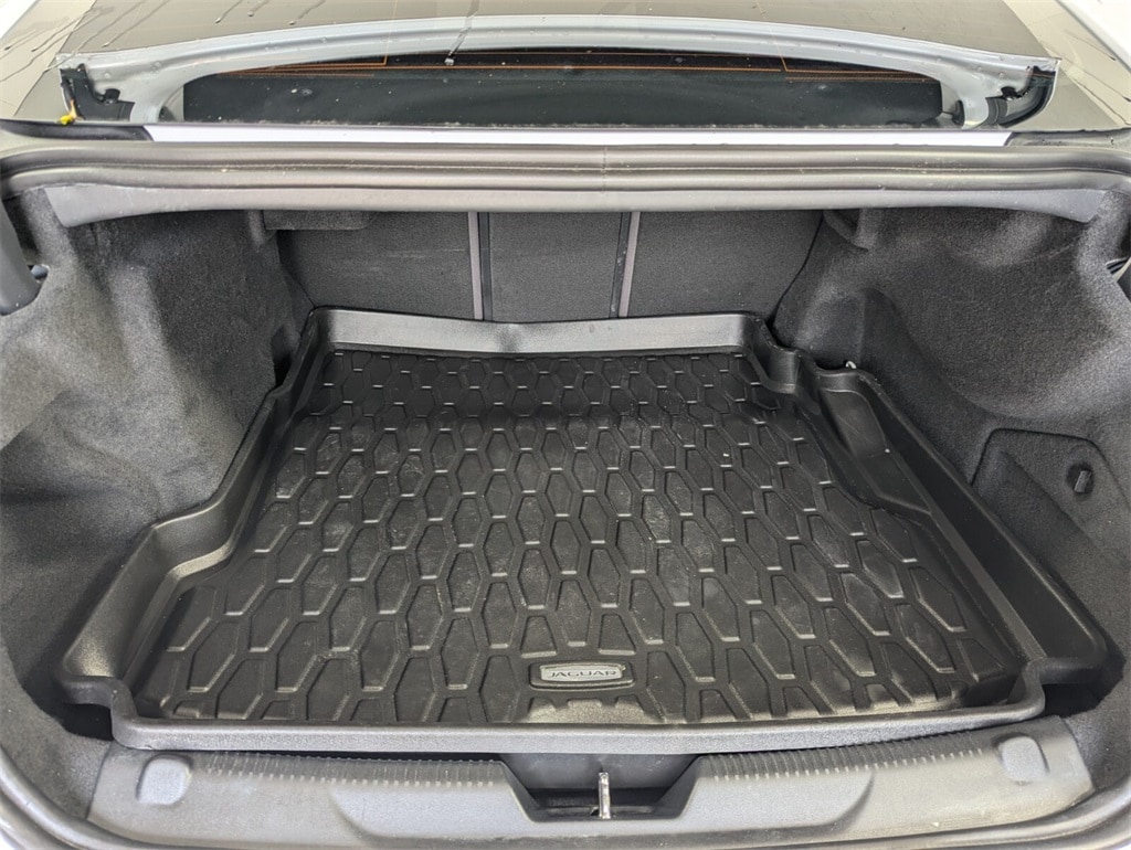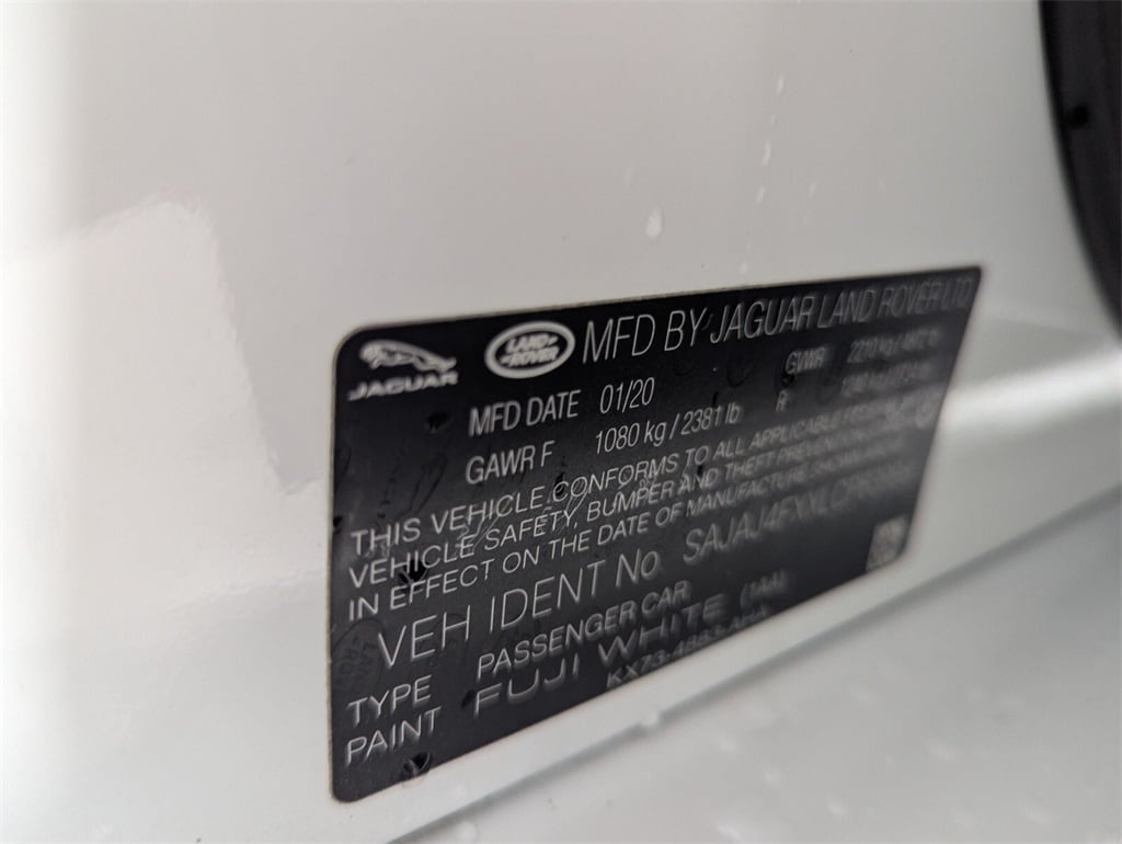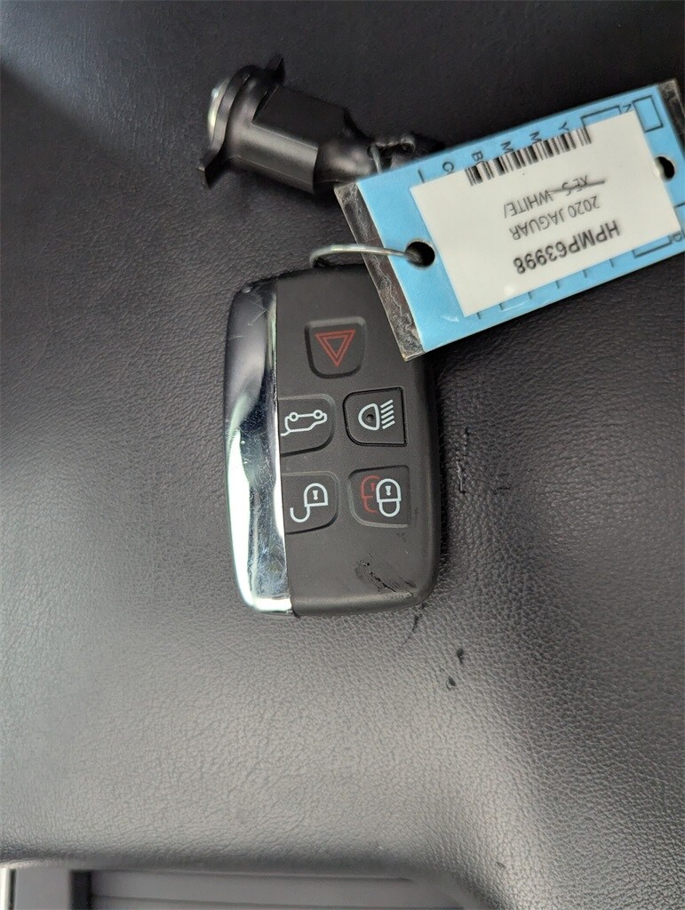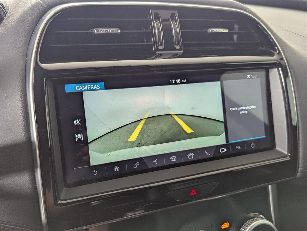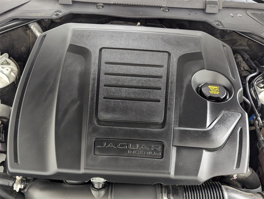 Features: 4-Wheel Disc Brakes, 6 Speakers, ABS brakes, Air Conditioning, Alloy wheels, AM/FM radio, Apple CarPlay/Android Auto, Auto High-beam Headlights, Auto-dimming Rear-View mirror, Automatic temperature control, Brake assist, Bumpers: body-color, Delay-off headlights, Driver door bin, Driver vanity mirror, Dual front impact airbags, Dual front side impact airbags, Electronic Stability Control, Emergency communication system: InControl Protect, Exterior Parking Camera Rear, Four wheel independent suspension, Front anti-roll bar, Front Bucket Seats, Front Center Armrest, Front dual zone A/C, Front reading lights, Fully automatic headlights, Grained Leather Seat Trim, Heated door mirrors, Illuminated entry, Leather Shift Knob, Low tire pressure warning, Occupant sensing airbag, Outside temperature display, Overhead airbag, Overhead console, Panic alarm, Passenger door bin, Passenger vanity mirror, Power door mirrors, Power driver seat, Power moonroof, Power passenger seat, Power steering, Power windows, Radio data system, Radio: Jaguar Sound System, Rain sensing wipers, Rear anti-roll bar, Rear fog lights, Rear seat center armrest, Rear window defroster, Remote keyless entry, Security system, Speed control, Speed-sensing steering, Split folding rear seat, Steering wheel mounted audio controls, Tachometer, Telescoping steering wheel, Tilt steering wheel, Traction control, Trip computer, Turn signal indicator mirrors, Variably intermittent wipers, and Wheels: 18" Gloss Sparkle Silver (Style 1022)