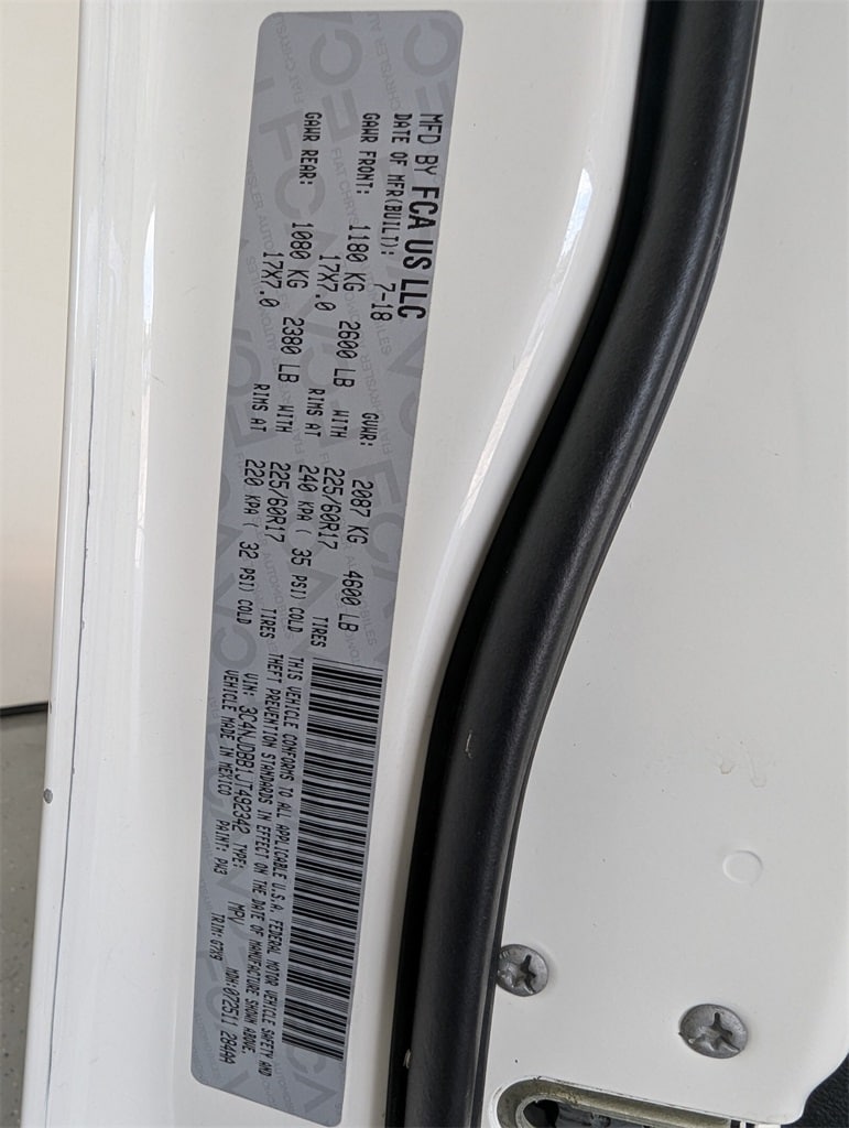 Features: MOPAR Interior Protection Package (MOPAR Molded Cargo Tray), Quick Order Package 27J, 3.833 Axle Ratio, 4-Wheel Disc Brakes, 6 Speakers, ABS brakes, Air Conditioning, Alloy wheels, AM/FM radio, Anti-whiplash front head restraints, Brake assist, Bumpers: body-color, Compass, Delay-off headlights, Driver door bin, Driver vanity mirror, Dual front impact airbags, Dual front side impact airbags, Electronic Stability Control, Four wheel independent suspension, Front anti-roll bar, Front Bucket Seats, Front Center Armrest w/Storage, Front fog lights, Front reading lights, Fully automatic headlights, Heated door mirrors, Illuminated entry, Knee airbag, Low tire pressure warning, Manufacturer's Statement of Origin, Occupant sensing airbag, Outside temperature display, Overhead airbag, Overhead console, Panic alarm, ParkView Rear Back-Up Camera, Passenger door bin, Passenger vanity mirror, Power door mirrors, Power steering, Power windows, Premium Cloth/Vinyl Bucket Seats, Radio: Uconnect 3 w/5" Display, Rear anti-roll bar, Rear seat center armrest, Rear window defroster, Rear window wiper, Remote keyless entry, Roof rack: rails only, Speed control, Split folding rear seat, Spoiler, Steering wheel mounted audio controls, Tachometer, Telescoping steering wheel, Tilt steering wheel, Traction control, Trip computer, Variably intermittent wipers, and Wheels: 17" x 7.0" Silver Painted Aluminum.