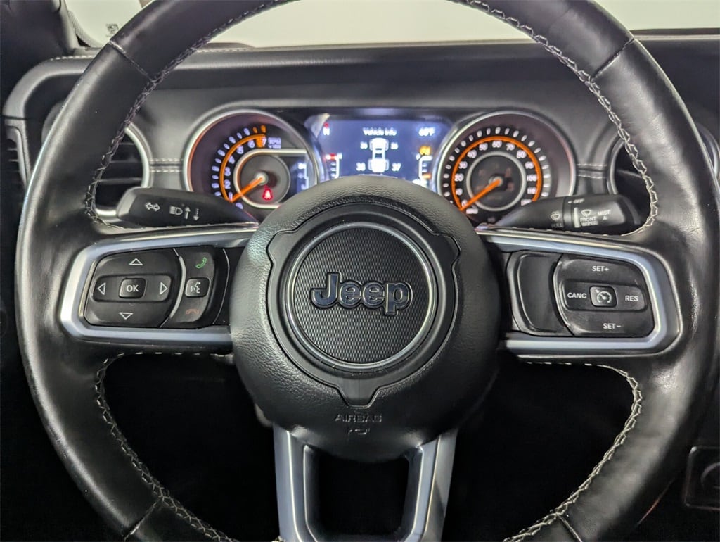 Features: 3.73 Rear Axle Ratio, 4-Wheel Disc Brakes, 400W Inverter, 8 Speakers, ABS brakes, Air Conditioning, Alloy wheels, AM/FM radio: SiriusXM, Apple CarPlay/Android Auto, Automatic temperature control, Brake assist, Compass, Delay-off headlights, Driver door bin, Driver vanity mirror, Dual front impact airbags, Dual front side impact airbags, Electronic Stability Control, Front anti-roll bar, Front Bucket Seats, Front Center Armrest w/Storage, Front dual zone A/C, Front fog lights, Front reading lights, Fully automatic headlights, Garage door transmitter, Heated door mirrors, Illuminated entry, Integrated roll-over protection, Leather steering wheel, Low tire pressure warning, Normal Duty Plus Suspension, Occupant sensing airbag, Outside temperature display, Overland Cloth Bucket Seats, Panic alarm, ParkView Rear Back-Up Camera, Passenger door bin, Passenger vanity mirror, Power door mirrors, Power steering, Power windows, Premium Door Trim Panel, Radio data system, Radio: Uconnect 4 w/7" Display, Rear anti-roll bar, Rear reading lights, Remote keyless entry, Security system, Speed control, Split folding rear seat, Steering wheel mounted audio controls, Tachometer, Telescoping steering wheel, Tilt steering wheel, Traction control, Trip computer, Variably intermittent wipers, Voltmeter, and Wheels: 18" x 7.5" Granite Crystal Aluminum.