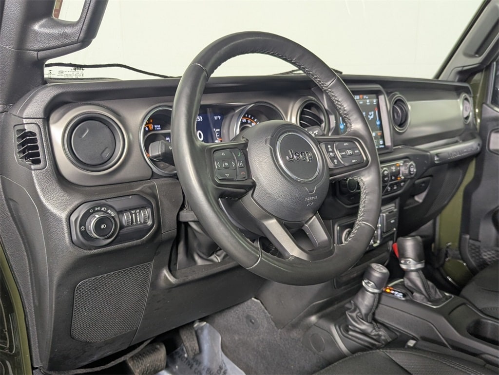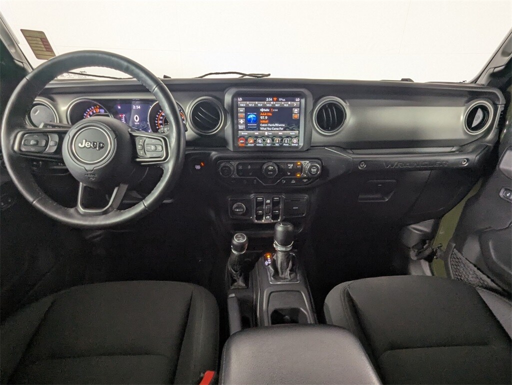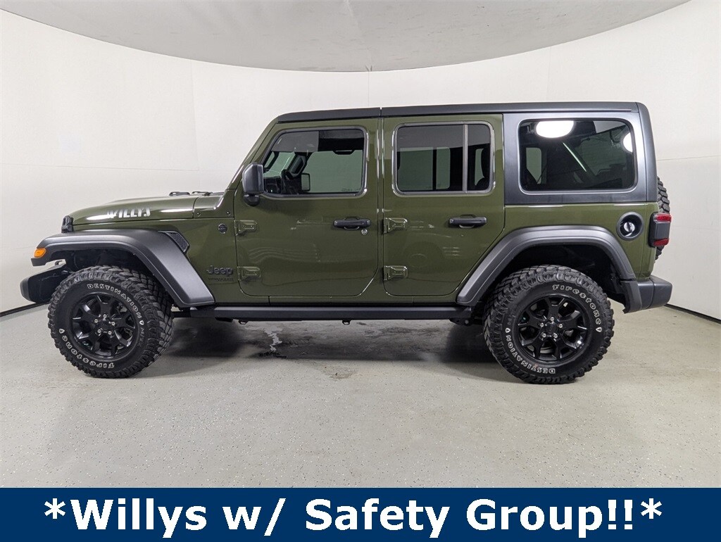 This Wrangler is well equipped with 8.4" Radio & Premium Audio Group (1-Year SiriusXM Guardian Trial, 5-Year SiriusXM Travel Link Service, 8.4" Touchscreen Display, Air Conditioning w/Auto Temperature Control, Air Filtering, Alpine Premium Audio System, Auto-Dimming Rear-View Mirror, Emergency/Assistance Call, HD Radio, Off-Road Info Pages, Radio: Uconnect 4C Nav w/8.4" Display, SiriusXM Satellite Radio, SiriusXM Traffic Plus, and SiriusXM Travel Link), Advanced Safety Group, Cold Weather Group (Leather Wrapped Steering Wheel), Convenience Group, Quick Order Package 25W Willys (Mold In Color Bumper w/Gloss Black and Wheels: 17" x 7.5" Moab Black Aluminum), Safety Group (Injection Molded Black Rear Bumper and LED Taillamps), Technology Group (2-Door Passive Entry, Front Door Locks), 110 MPH Vehicle Max Speed Calibration, 3.45 Rear Axle Ratio, 4-Wheel Disc Brakes, 8 Speakers, ABS brakes, Air Conditioning, AM/FM radio, Apple CarPlay/Android Auto, Aux Battery, Black 3-Piece Hard Top, Brake assist, Cloth Low-Back Bucket Seats, Compass, Corning Gorilla Glass, Delay-off headlights, Driver door bin, Driver vanity mirror, Dual front impact airbags, Dual front side impact airbags, Electronic Stability Control, Emergency communication system: SiriusXM Guardian, Engine Oil Cooler, Front anti-roll bar, Front Bucket Seats, Front Center Armrest w/Storage, Front fog lights, Front reading lights, Integrated roll-over protection, Low tire pressure warning, MOPAR Hardtop Headliner, Non-Lock Fuel Cap w/o Discriminator, Normal Duty Suspension, Occupant sensing airbag, Outside temperature display, ParkView Rear Back-Up Camera, Passenger door bin, Passenger vanity mirror, Power steering, Radio data system, Radio: Uconnect 4 w/7" Display, Rear anti-roll bar, Rear reading lights, Speed control, Split folding rear seat, Steering wheel mounted audio controls, Stop-Start Dual Battery System, Tachometer, Telescoping steering wheel, Tilt steering wheel, Traction control, Trip computer, Variably intermittent wipers, and Wheels: 17" x 7.5" Black Steel Styled.