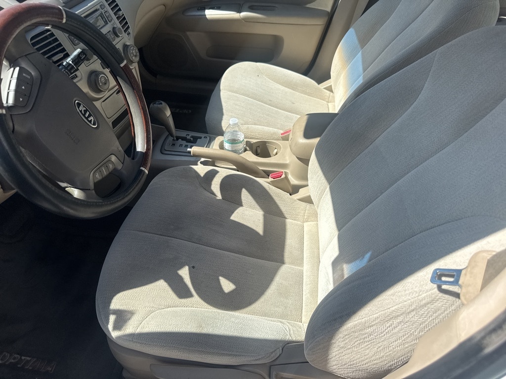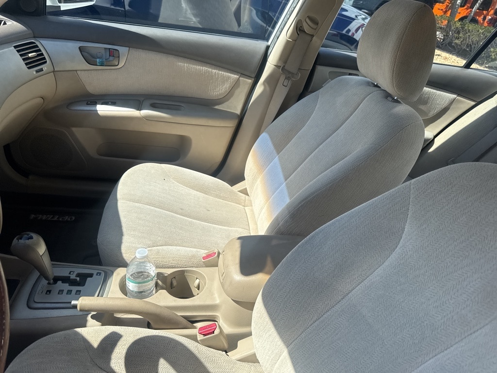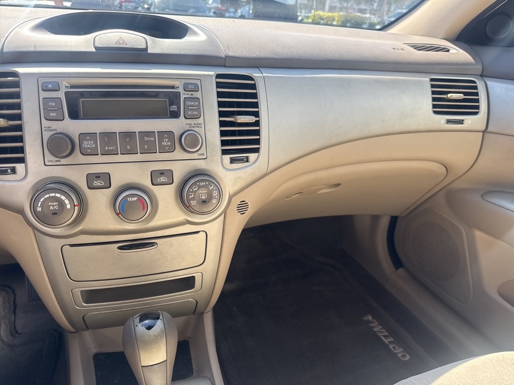This Optima is well equipped with Beige Cloth, 4-Wheel Disc Brakes, 6 Speakers, 6.5J x 16" Steel Wheels, Air Conditioning, AM/FM radio, AM/FM w/Single In-Dash CD Player, Anti-whiplash front head restraints, Bodyside moldings, Bumpers: body-color, CD player, Cloth Seat Trim, Driver door bin, Driver vanity mirror, Dual front impact airbags, Dual front side impact airbags, Four wheel independent suspension, Front anti-roll bar, Front Bucket Seats, Front Center Armrest, Front reading lights, Heated door mirrors, Low tire pressure warning, Occupant sensing airbag, Overhead airbag, Overhead console, Panic alarm, Passenger door bin, Passenger vanity mirror, Power door mirrors, Power steering, Power windows, Rear anti-roll bar, Rear seat center armrest, Rear window defroster, Remote keyless entry, Speed control, Split folding rear seat, Steering wheel mounted audio controls, Tachometer, Telescoping steering wheel, Tilt steering wheel, and Variably intermittent wipers.