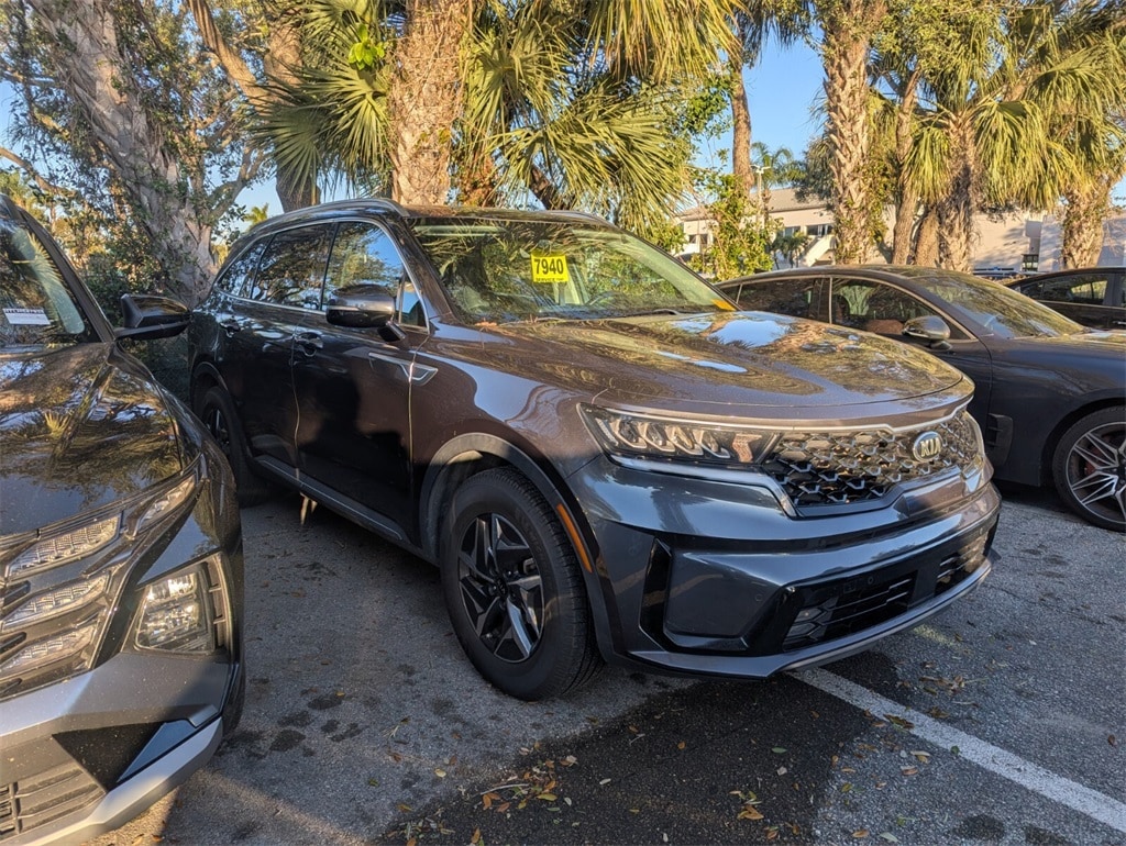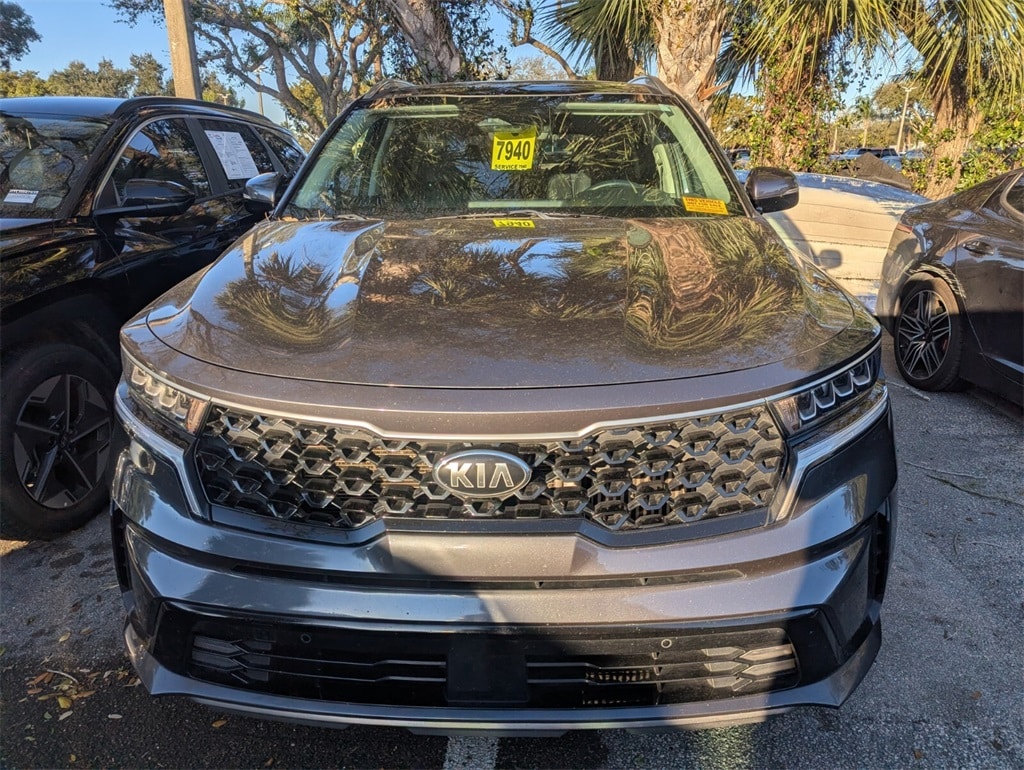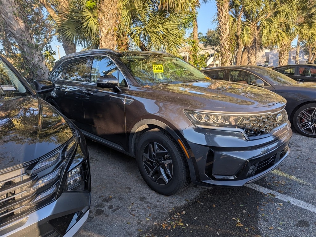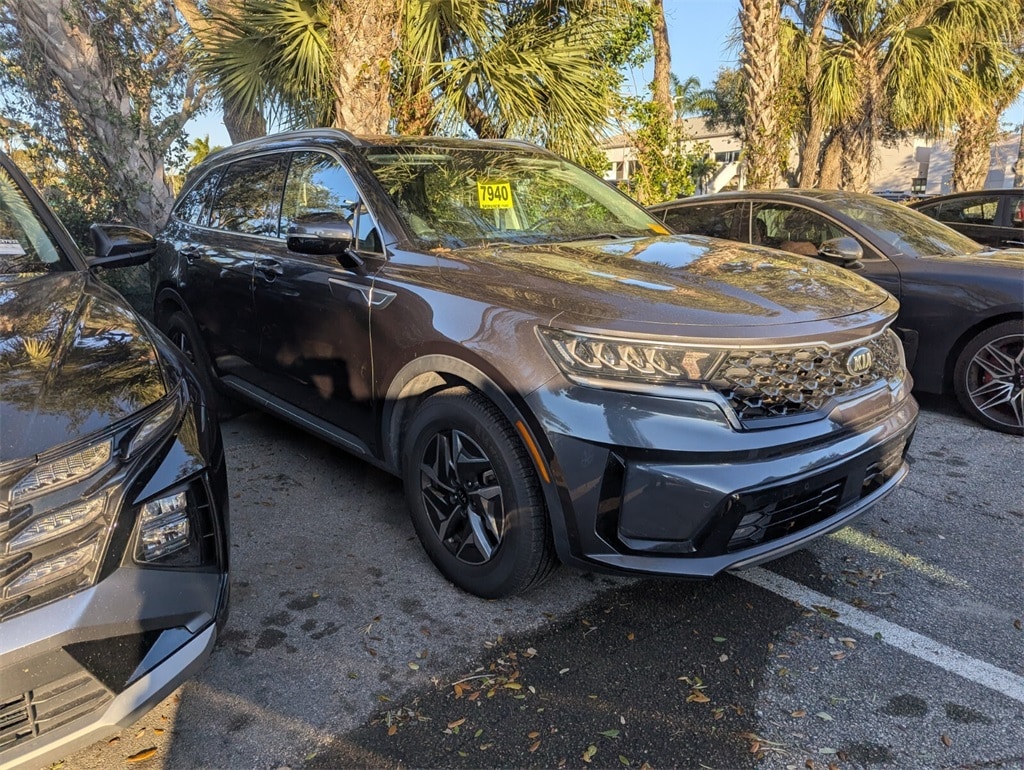 2021 Kia Sorento Hybrid EX Beautifully finished in Platinum Graphite with Black Artificial Leather interior. 1.6L I4 DGI Hybrid Turbocharged DOHC 16V LEV3-ULEV70 4D Sport Utility FWD 6-Speed Automatic 1.6L I4 DGI Hybrid Turbocharged DOHC 16V LEV3-ULEV70, 3rd row seats: split-bench, 4-Wheel Disc Brakes, 6 Speakers, ABS brakes, Air Conditioning, Alloy wheels, AM/FM radio: SiriusXM, Apple CarPlay & Android Auto, Auto High-beam Headlights, Automatic temperature control, Axle Ratio: 3.510, Brake assist, Bumpers: body-color, Carpeted Floor Mats, Delay-off headlights, Driver door bin, Driver vanity mirror, Dual front impact airbags, Dual front side impact airbags, Electronic Stability Control, Exterior Parking Camera Rear, Four wheel independent suspension, Front anti-roll bar, Front Bucket Seats, Front Center Armrest, Front dual zone A/C, Front fog lights, Front reading lights, Fully automatic headlights, Heated door mirrors, Heated Front Bucket Seats, Heated front seats, Illuminated entry, Knee airbag, Leather steering wheel, Low tire pressure warning, Occupant sensing airbag, Outside temperature display, Overhead airbag, Overhead console, Panic alarm, Passenger door bin, Passenger vanity mirror, Power door mirrors, Power driver seat, Power Liftgate, Power moonroof, Power steering, Power windows, Premium Leatherette Seat Trim, Radio data system, Radio: AM/FM Audio System, Rear air conditioning, Rear anti-roll bar, Rear reading lights, Rear window defroster, Rear window wiper, Remote keyless entry, Roof rack: rails only, Security system, Speed control, Speed-sensing steering, Split folding rear seat, Spoiler, Steering wheel mounted audio controls, Tachometer, Telescoping steering wheel, Tilt steering wheel, Traction control, Trip computer, Turn signal indicator mirrors, Variably intermittent wipers, Wheels: 17" Machine-Finished Aero Style Alloy, 1.6L I4 DGI Hybrid Turbocharged DOHC 16V LEV3-ULEV70. CARFAX One-Owner. Clean CARFAX. Priced below KBB Fair Purchase Price! 39/35 City/Highway MPG
