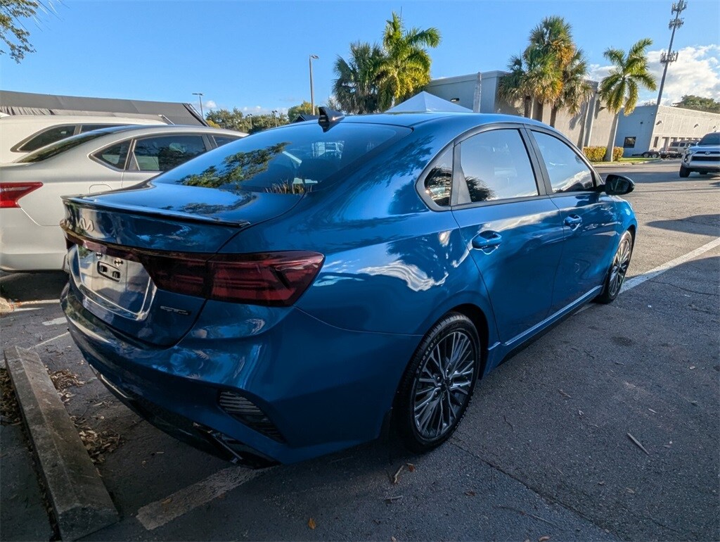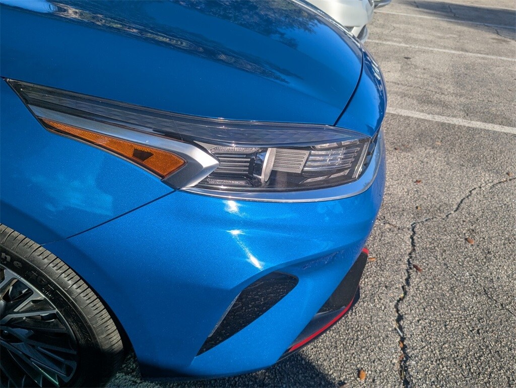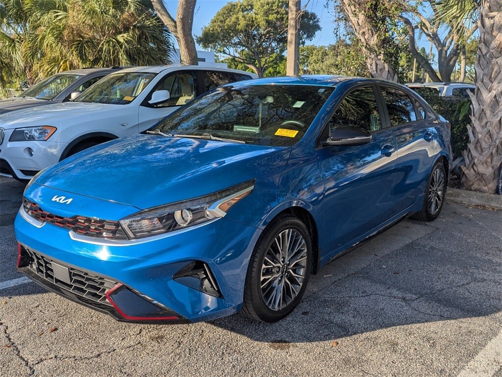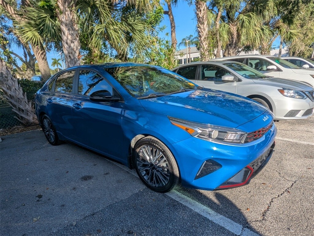 2023 Kia Forte GT-Line Beautifully finished in Sporty Blue with Black Cloth interior. 2.0L I4 MPI 4D Sedan FWD CVT 10-Way Power Driver's Seat, 17" x 7.0J Alloy Wheels, 4-Wheel Disc Brakes, 6 Speakers, ABS brakes, Air Conditioning, Alloy wheels, AM/FM radio: SiriusXM, Apple CarPlay & Android Auto, Auto High-beam Headlights, Automatic temperature control, Brake assist, Bumpers: body-color, Carpet Floor Mats, Cloth & SynTex Seat Trim, Delay-off headlights, Driver door bin, Driver vanity mirror, Dual front impact airbags, Dual front side impact airbags, Electronic Parking Brake (EPB), Electronic Stability Control, Emergency communication system, Exterior Parking Camera Rear, Forward Collision Avoidance-Assist - Cyclist, Front anti-roll bar, Front Bucket Seats, Front Center Armrest, Front dual zone A/C, Front fog lights, Front reading lights, Front wheel independent suspension, Fully automatic headlights, GT-Line Premium Package, GT-Line Sport Premium Package, Heated & Ventilated Front Seats, Heated door mirrors, Illuminated entry, Leather Shift Knob, Leather steering wheel, LED Interior Lighting, Low tire pressure warning, Navigation System, Navigation-Based Smart Cruise Control (NSCC), Occupant sensing airbag, Outside temperature display, Overhead airbag, Overhead console, Panic alarm, Passenger door bin, Passenger vanity mirror, Power door mirrors, Power steering, Power Sunroof, Power windows, Radio data system, Radio: 10.25" Display Audio, Radio: harman kardon Premium Audio, Rear AC Vent, Rear seat center armrest, Rear USB Charger, Rear window defroster, Remote keyless entry, Security system, Smart Cruise Control w/Stop & Go, Speed control, Split folding rear seat, Spoiler, Sport steering wheel, Steering wheel mounted audio controls, SynTex Seat Trim, Tachometer, Telescoping steering wheel, Tilt steering wheel, Traction control, Trip computer, Turn signal indicator mirrors, Variably intermittent wipers, Wireless Charging. 28/39 City/Highway MPG