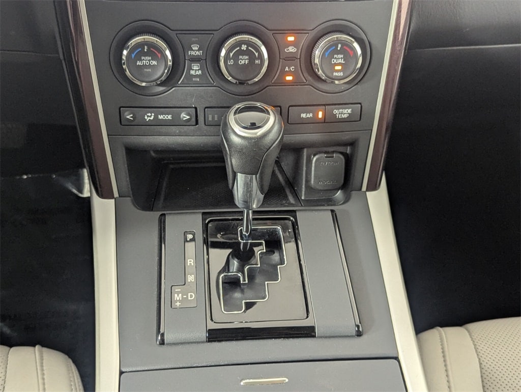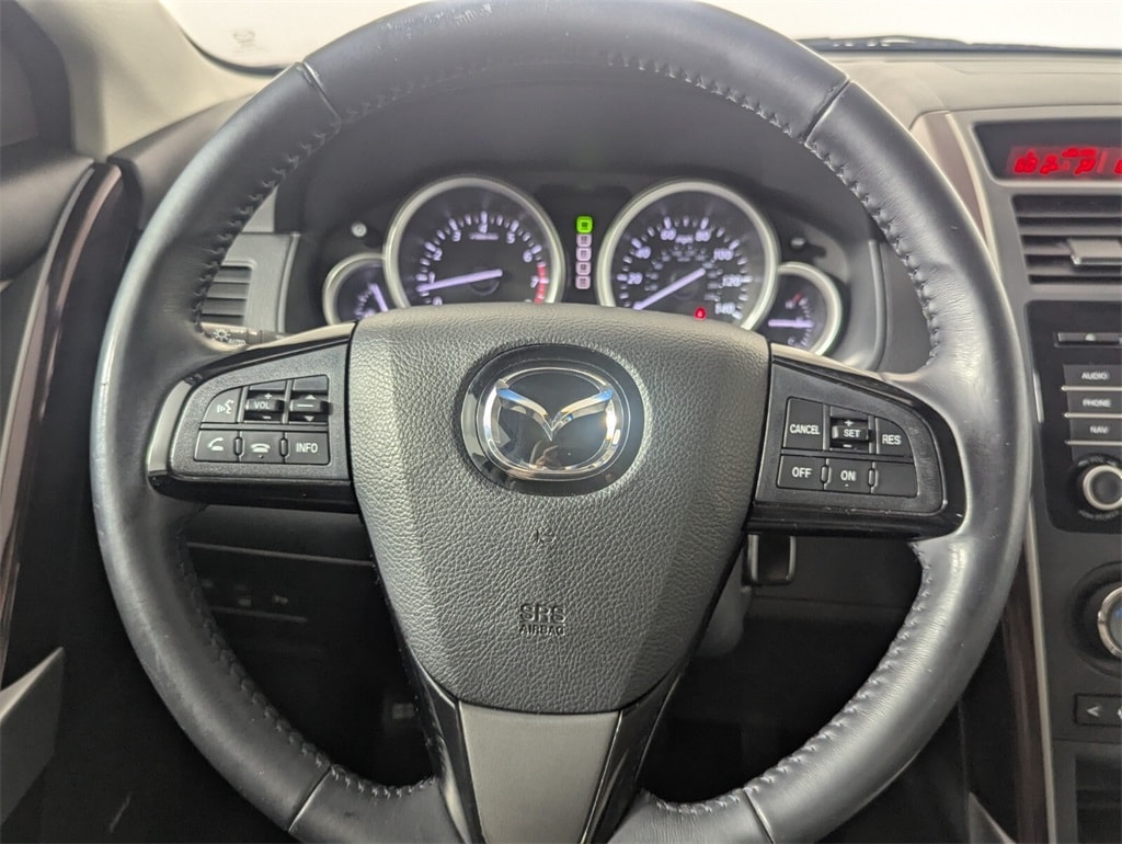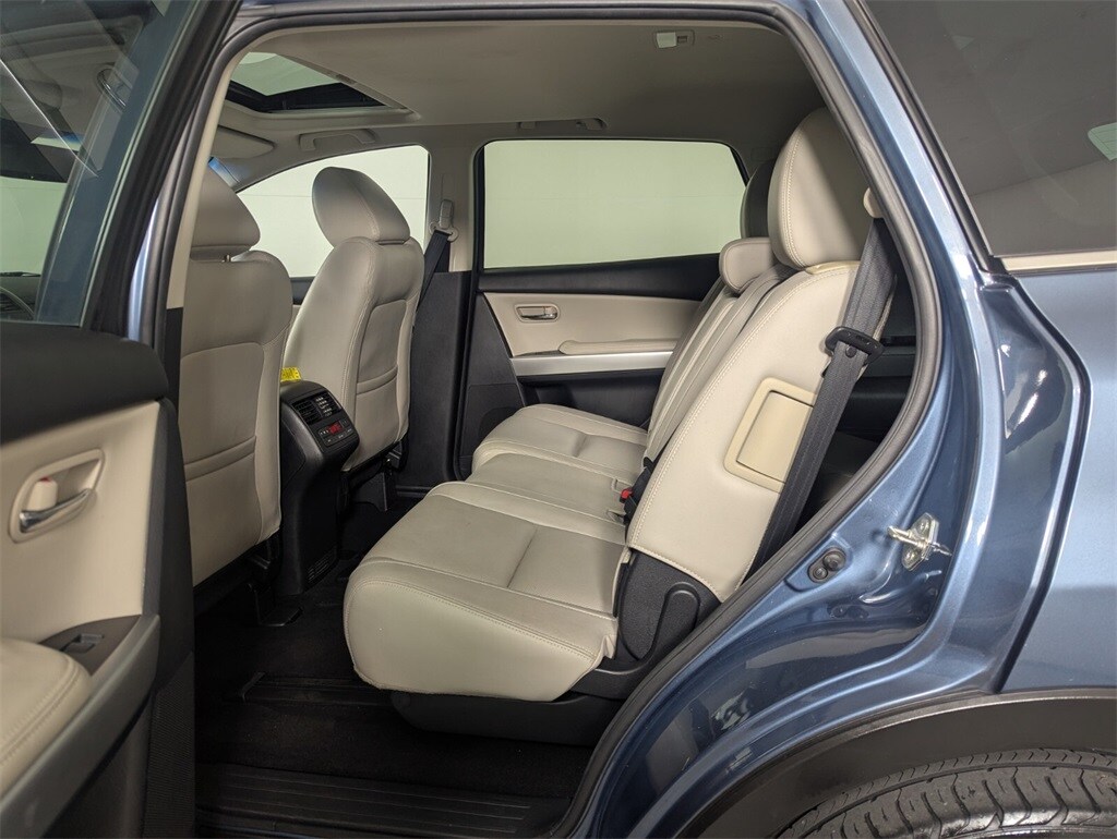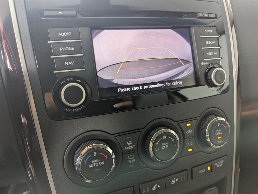 This Mazda CX-9 is well equipped with GT Technology Package (Navigation System w/Real Time Traffic, Power Sliding Glass Moonroof w/Interior Sunshade, and SiriusXM Satellite Radio), Recreational Accessory Package (Cargo Netting, Rear Bumper Guard, and Roof Rack w/Roof Rails), Towing Prep (Heavy-Duty Transmission Cooler), 20" x 7.5J Aluminum Alloy Wheels, 3.464 Axle Ratio, 3rd row seats: split-bench, 4-Wheel Disc Brakes, 6 Speakers, ABS brakes, Air Conditioning, Alloy wheels, AM/FM radio, AM/FM Sound System w/CD & 6 Speakers, Anti-whiplash front head restraints, Auto-dimming Rear-View mirror, Automatic temperature control, Bose Centerpoint w/11 speakers, Brake assist, Bumpers: body-color, CD player, Delay-off headlights, Driver door bin, Driver vanity mirror, Dual front impact airbags, Dual front side impact airbags, Electronic Stability Control, Exterior Parking Camera Rear, Four wheel independent suspension, Front anti-roll bar, Front Bucket Seats, Front Center Armrest, Front dual zone A/C, Front fog lights, Front reading lights, Fully automatic headlights, Garage door transmitter: HomeLink, Heated door mirrors, Heated Front Bucket Seats, Heated front seats, High intensity discharge headlights: Bi-Xenon, Illuminated entry, Leather Shift Knob, Leather Trimmed Seats, Low tire pressure warning, Memory seat, Occupant sensing airbag, Outside temperature display, Overhead airbag, Overhead console, Panic alarm, Passenger door bin, Passenger vanity mirror, Power door mirrors, Power driver seat, Power Liftgate, Power passenger seat, Power steering, Power windows, Rain sensing wipers, Rear air conditioning, Rear anti-roll bar, Rear Parking Sensors, Rear seat center armrest, Rear window defroster, Rear window wiper, Remote keyless entry, Security system, Speed control, Speed-sensing steering, Split folding rear seat, Spoiler, Steering wheel mounted audio controls, Tachometer, Telescoping steering wheel, Tilt steering wheel, Traction control, Trip computer, Turn signal indicator mirrors, and Variably intermittent wipers.