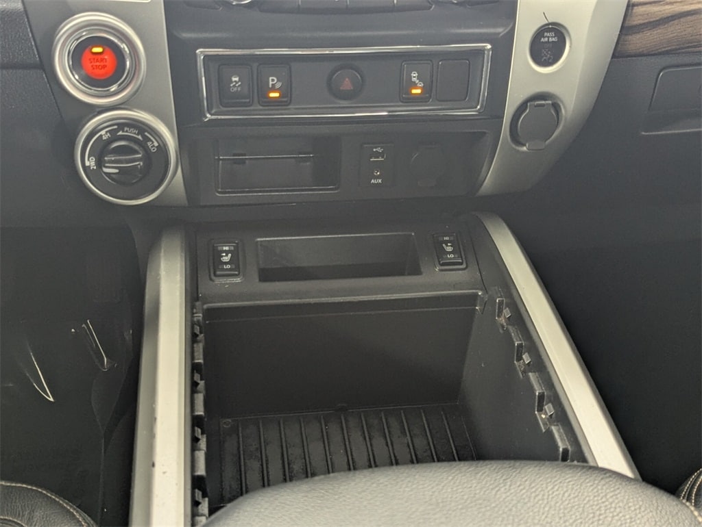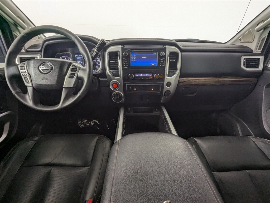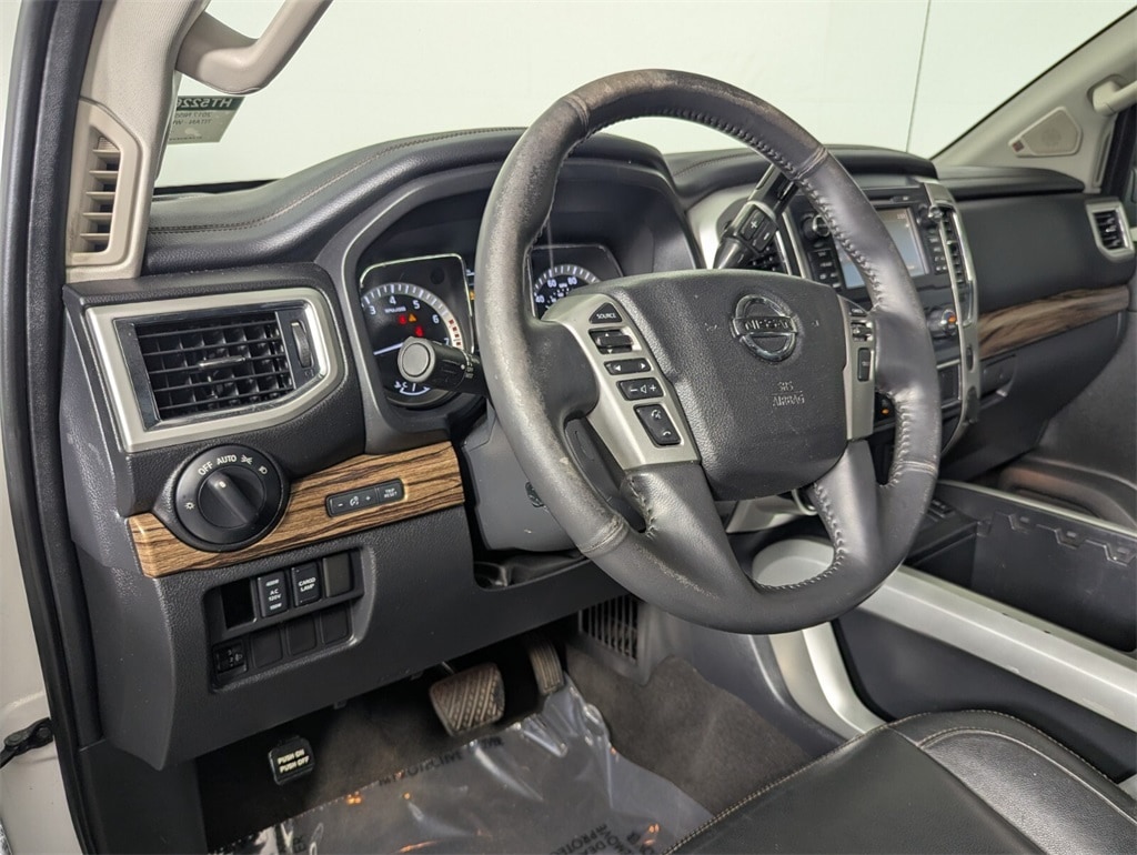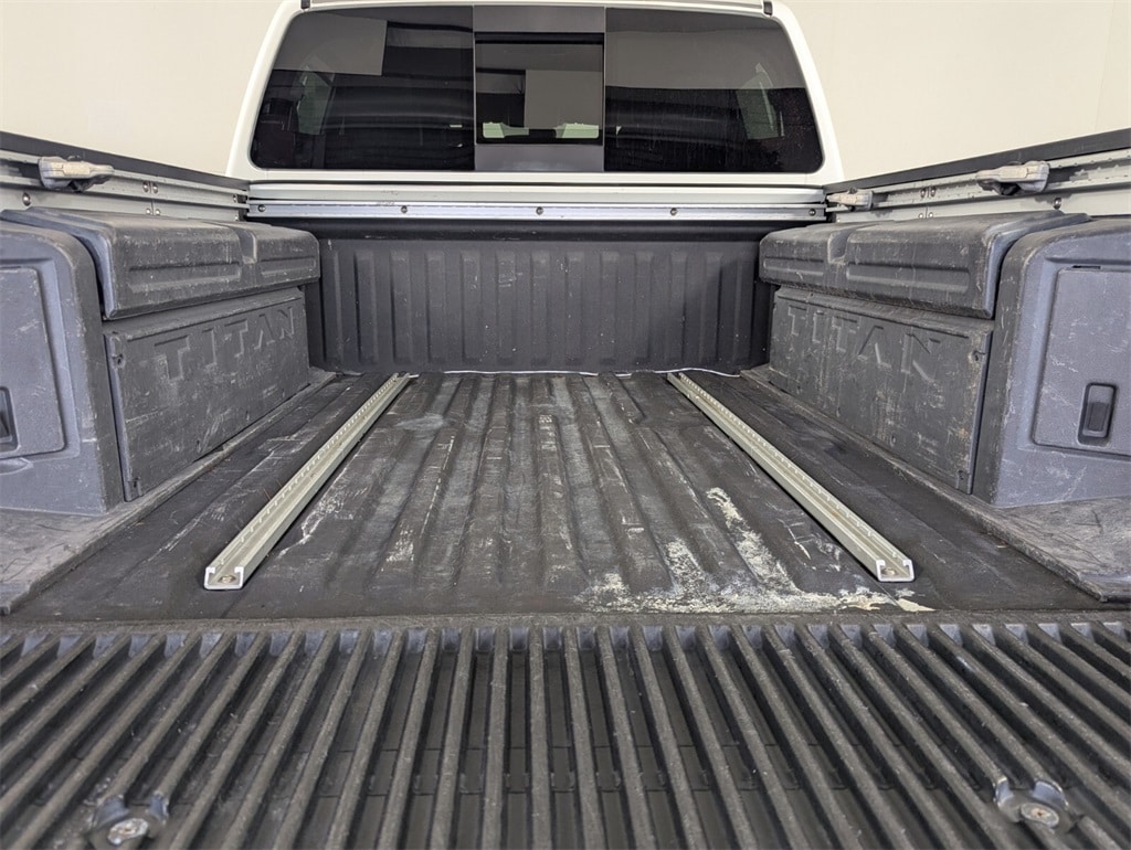 Features: Titan SL, 4D Crew Cab, 5.6L V8, 7-Speed Automatic, 4WD, Pearl White Metallic, Black Leather, 12 Speakers, 2.937 Axle Ratio, 4-Wheel Disc Brakes, ABS brakes, Air Conditioning, Alloy wheels, AM/FM radio: SiriusXM, Auto tilt-away steering wheel, Auto-dimming door mirrors, Auto-dimming Rear-View mirror, Automatic temperature control, Black Finish Grille, Blind Spot Warning, Brake assist, Bumpers: chrome, Carpeted Floor Mats, CD player, Compass, Delay-off headlights, Driver door bin, Driver vanity mirror, Dual front impact airbags, Dual front side impact airbags, Electronic Stability Control, Emergency communication system: NissanConnect Services, Front anti-roll bar, Front Bucket Seats, Front Center Armrest, Front dual zone A/C, Front fog lights, Front reading lights, Front wheel independent suspension, Garage door transmitter: HomeLink, Heated door mirrors, Heated Front Captain's Chairs, Heated front seats, Illuminated entry, Leather Seat Trim, Leather steering wheel, Low tire pressure warning, Memory seat, Navigation System, Occupant sensing airbag, Outside temperature display, Overhead airbag, Overhead console, Panic alarm, Passenger door bin, Passenger vanity mirror, Power door mirrors, Power driver seat, Power passenger seat, Power steering, Power windows, Radio data system, Radio: NissanConnect w/SiriusXM/Navi & Mobile Apps, Rain sensing wipers, Rear anti-roll bar, Rear seat center armrest, Rear step bumper, Rear window defroster, Remote keyless entry, Security system, Speed control, Speed-sensing steering, Speed-Sensitive Wipers, Splash Guards, Split folding rear seat, Steering wheel memory, Steering wheel mounted audio controls, Tachometer, Telescoping steering wheel, Tilt steering wheel, Titan Box w/Inside Bed Storage w/New Cleat, Traction control, Trip computer, Turn signal indicator mirrors, Variably intermittent wipers, Voltmeter, and Wheels: 20" x 8" Painted Alloy.