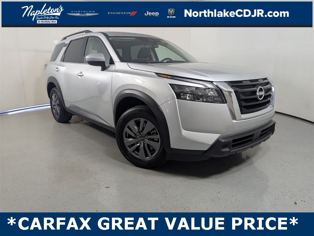 This Pathfinder is well equipped with Pathfinder SV, 3.5L V6 DOHC, Heated Front Bucket Seats, Power Liftgate, Rear Parking Sensors, 3rd row seats: bench, 4-Wheel Disc Brakes, 6 Speakers, ABS brakes, Air Conditioning, Alloy wheels, AM/FM radio: SiriusXM, Auto High-beam Headlights, Automatic temperature control, Brake assist, Bumpers: body-color, Cloth Seating Surfaces, Delay-off headlights, Driver door bin, Driver vanity mirror, Dual front impact airbags, Dual front side impact airbags, Electronic Stability Control, Emergency communication system, Four wheel independent suspension, Front anti-roll bar, Front Bucket Seats, Front Center Armrest, Front dual zone A/C, Front reading lights, Fully automatic headlights, Heated door mirrors, Heated front seats, Illuminated entry, Knee airbag, Leather steering wheel, Low tire pressure warning, NissanConnect featuring Apple CarPlay and Android Auto, Occupant sensing airbag, Outside temperature display, Overhead airbag, Overhead console, Panic alarm, Passenger door bin, Passenger vanity mirror, Power door mirrors, Power driver seat, Power steering, Power windows, Radio data system, Radio: AM/FM Audio System w/NissanConnect, Rear air conditioning, Rear anti-roll bar, Rear reading lights, Rear seat center armrest, Rear side impact airbag, Rear window defroster, Rear window wiper, Reclining 3rd row seat, Remote keyless entry, Security system, Speed control, Speed-sensing steering, Split folding rear seat, Spoiler, Steering wheel mounted audio controls, Tachometer, Telescoping steering wheel, Tilt steering wheel, Traction control, Trip computer, Turn signal indicator mirrors, Variably intermittent wipers, and Wheels: 18" x 8J Painted Alloy.