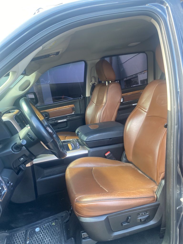 This 1500 is well equipped with Convenience Group (Keyless Enter-N-Go and Remote Proximity Keyless Entry), Quick Order Package 26K Laramie Longhorn, 10 Speakers, 115V Auxiliary Power Outlet, 20" x 9" Aluminum Polished/Gold Inserts Wheels, 3.21 Rear Axle Ratio, 4-Wheel Disc Brakes, ABS brakes, Adjustable pedals, Air Conditioning, Alloy wheels, AM/FM radio, Audio memory, Auto-dimming door mirrors, Auto-dimming Rear-View mirror, Automatic temperature control, Brake assist, Bucket Seats, Center Hub, Class IV Receiver Hitch, Compass, Delay-off headlights, Driver door bin, Driver vanity mirror, Dual front impact airbags, Dual front side impact airbags, Electronic Stability Control, Electronically Controlled Throttle, Emergency communication system: Uconnect Access, Folding Flat Load Floor Storage, Front anti-roll bar, Front Bucket Seats, Front Center Armrest w/Storage, Front dual zone A/C, Front fog lights, Front reading lights, Front wheel independent suspension, Fully automatic headlights, Garage door transmitter, Genuine wood dashboard insert, Genuine wood door panel insert, Heated door mirrors, Heated Front Seats, Heated front seats, Heated rear seats, Heated Second Row Seats, Heated Steering Wheel, Heated steering wheel, High Back Seats, Illuminated entry, Leather Shift Knob, Leather steering wheel, Low tire pressure warning, Manufacturer's Statement of Origin, Memory seat, Navigation System/ GPS, Occupant sensing airbag, Outside temperature display, Overhead airbag, Overhead console, Panic alarm, ParkView Rear Back-Up Camera, Passenger door bin, Passenger vanity mirror, Pedal memory, Power 10-Way Memory Driver & 6-Way Passenger Seats, Power door mirrors, Power driver seat, Power Lumbar Adjust, Power passenger seat, Power steering, Power windows, Premium Filigree Leather Seats, Radio data system, Radio: Uconnect 8.4 NAV, Rear 60/40 Split Folding Seat, Rear anti-roll bar, Rear seat center armrest, Rear step bumper, Remote keyless entry, Security system, Speed control, Split folding rear seat, Steering Wheel Mounted Audio Controls, Steering wheel mounted audio controls, Tachometer, Tilt steering wheel, Traction control, Trip computer, Turn signal indicator mirrors, Variably intermittent wipers, Ventilated Front Seats, Ventilated front seats, Voltmeter, Wheel to Wheel Side Steps, and Wheels: 20" x 9" Polished Aluminum Forged.