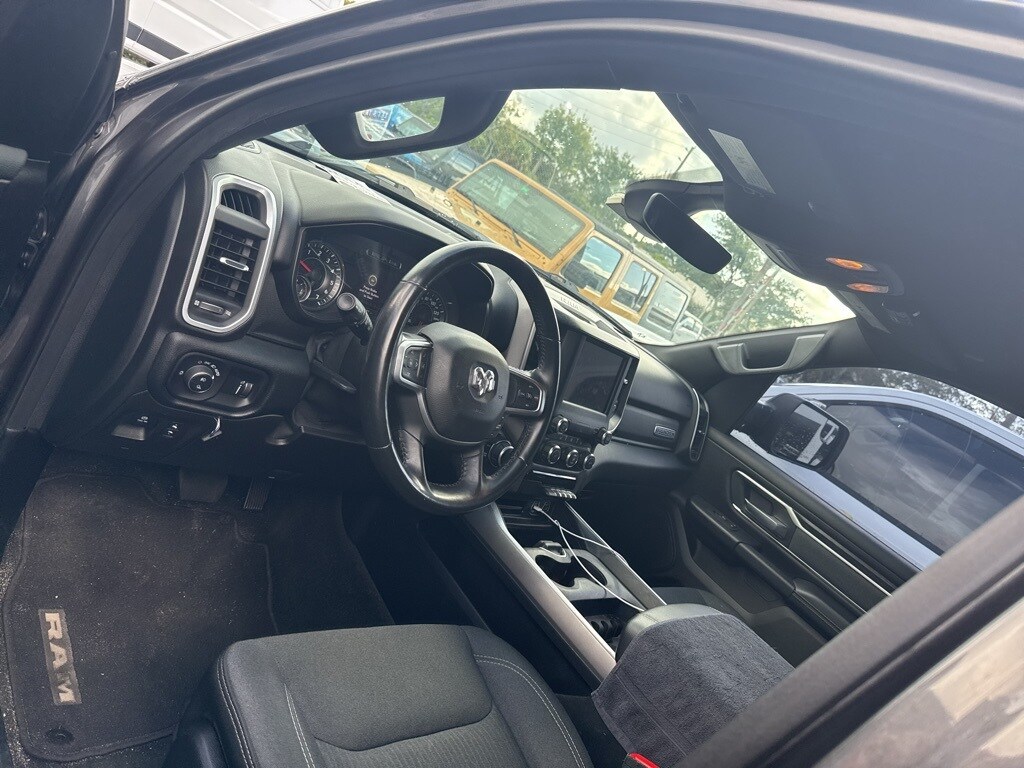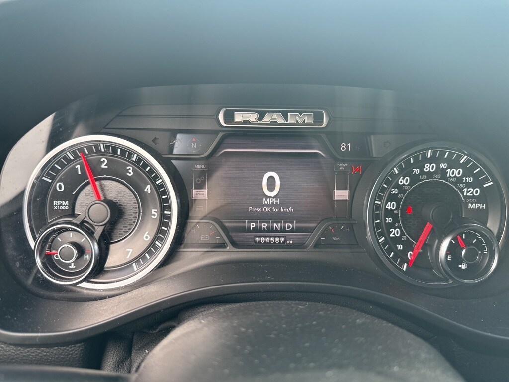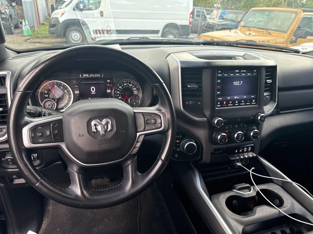 This 1500 is well equipped with Big Horn Level 2 Equipment Group (115V Auxiliary Power Outlet, 115V Auxiliary Rear Power Outlet, 2nd Row In Floor Storage Bins, 400W Inverter, Air Conditioning ATC w/Dual Zone Control, Auto-Dimming Exterior Driver Mirror, Auto-Dimming Rear-View Mirror, Black Premium Power Mirrors, Class IV Receiver Hitch, Cluster 7.0" TFT Color Display, Exterior Mirrors Courtesy Lamps, Exterior Mirrors w/Supplemental Signals, Foam Bottle Insert (Door Trim Panel), For More Info, Call 800-643-2112, Glove Box Lamp, Heated Front Seats, Heated Steering Wheel, Media Hub w/2 Charge Only USBs, ParkSense Front/Rear Park Assist w/Stop, Power 4-Way Driver Lumbar Adjust, Power 8-Way Driver Seat, Power Adjustable Pedals, Power-Folding Mirrors, Rear Dome w/On/Off Switch Lamp, Rear Power Sliding Window, Rear Window Defroster, Security Alarm, SiriusXM Radio Service, Sun Visors w/Illuminated Vanity Mirrors, and Universal Garage Door Opener), Night Edition (3 Rear Seat Head Restraints, 4 Way Front Headrests, Accent Color Premium Power Mirrors, Anti-Spin Differential Rear Axle, Black Exterior Truck Badging, Black Headlamp Bezels, Black Interior Accents, Black Painted Exterior Mirrors Caps, Body Color Front Bumper, Body Color Rear Bumper w/Step Pads, Bucket Seats, Center Console Parts Module, Deluxe Cloth Bucket Seats, Dual Exhaust w/Black Tips, Exterior Mirrors w/Memory, Front Seat Back Map Pockets, Full Length Floor Console, Manual Adjust 4-Way Front Passenger Seat, Rear 60/40 Folding Seat, and Wheels: 20" x 9.0" Premium Paint/Polished), Quick Order Package 27Z Big Horn (Big Horn Badge), 3.21 Rear Axle Ratio, 4-Wheel Disc Brakes, 40/20/40 Split Bench Seat, 48V Belt Starter Generator, 6 Speakers, ABS brakes, Air Conditioning, Alloy wheels, AM/FM radio, Black Exterior Mirrors, Brake assist, Bumpers: chrome, Cloth Bench Seat, Compass, Delay-off headlights, Driver door bin, Dual front impact airbags, Dual front side impact airbags, Electronic Stability Control, Front anti-roll bar, Front Center Armrest w/Storage, Front fog lights, Front reading lights, Front wheel independent suspension, Fully automatic headlights, GPS Antenna Input, Heated door mirrors, Illuminated entry, Integrated Voice Command w/Bluetooth, Leather steering wheel, Low tire pressure warning, Occupant sensing airbag, Outside temperature display, Overhead airbag, Overhead console, Panic alarm, ParkView Rear Back-Up Camera, Passenger door bin, Passenger vanity mirror, Power door mirrors, Power steering, Power windows, Radio data system, Radio: Uconnect 3 w/5" Display, Radio: Uconnect 4 w/8.4" Display, Rear anti-roll bar, Rear seat center armrest, Rear step bumper, Remote keyless entry, Remote Start System, Speed control, Split folding rear seat, Steering wheel mounted audio controls, Tachometer, Telescoping steering wheel, Tilt steering wheel, Traction control, Trip computer, Variably intermittent wipers, Voltmeter, and Wheels: 18" x 8" Cast-Aluminum Painted.
