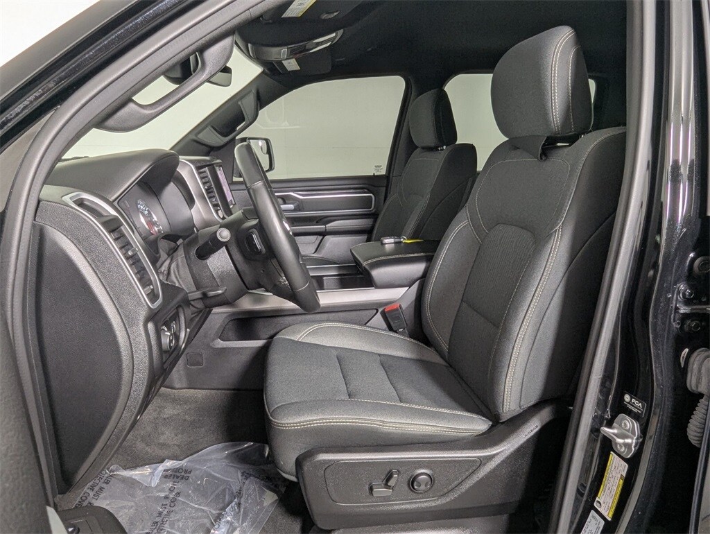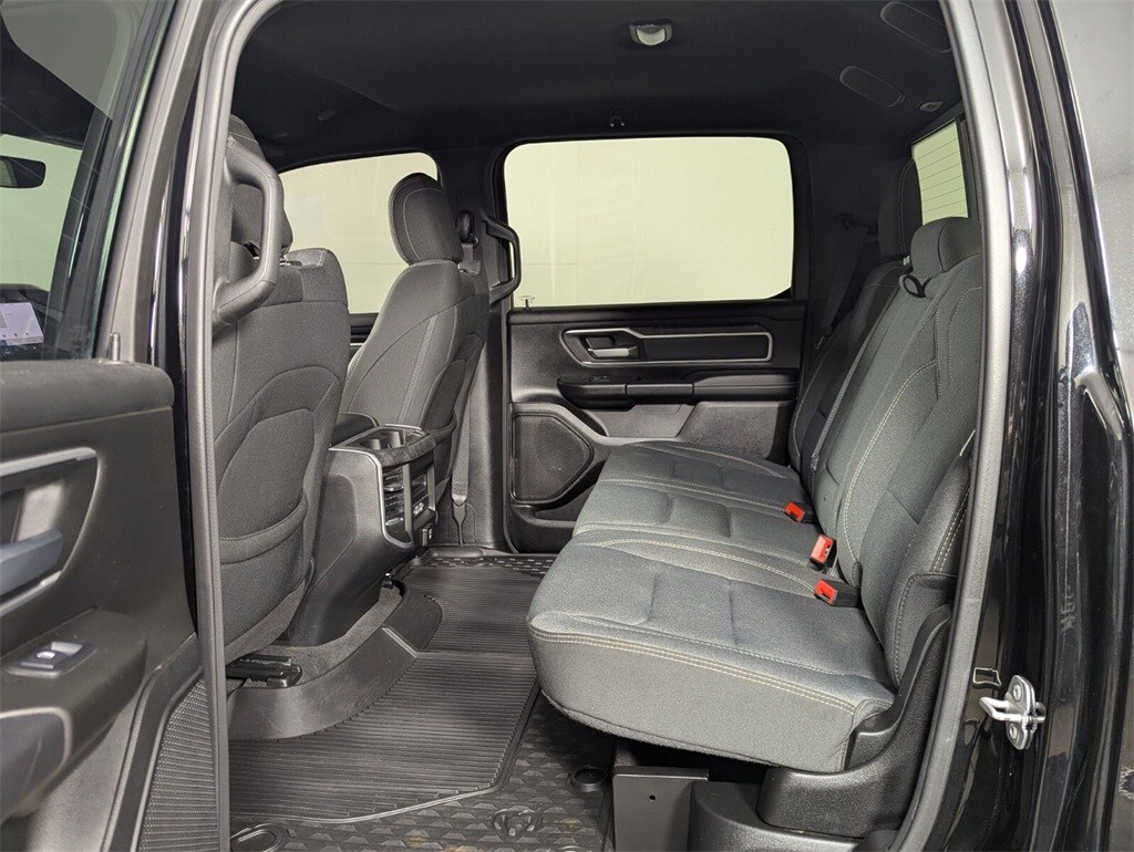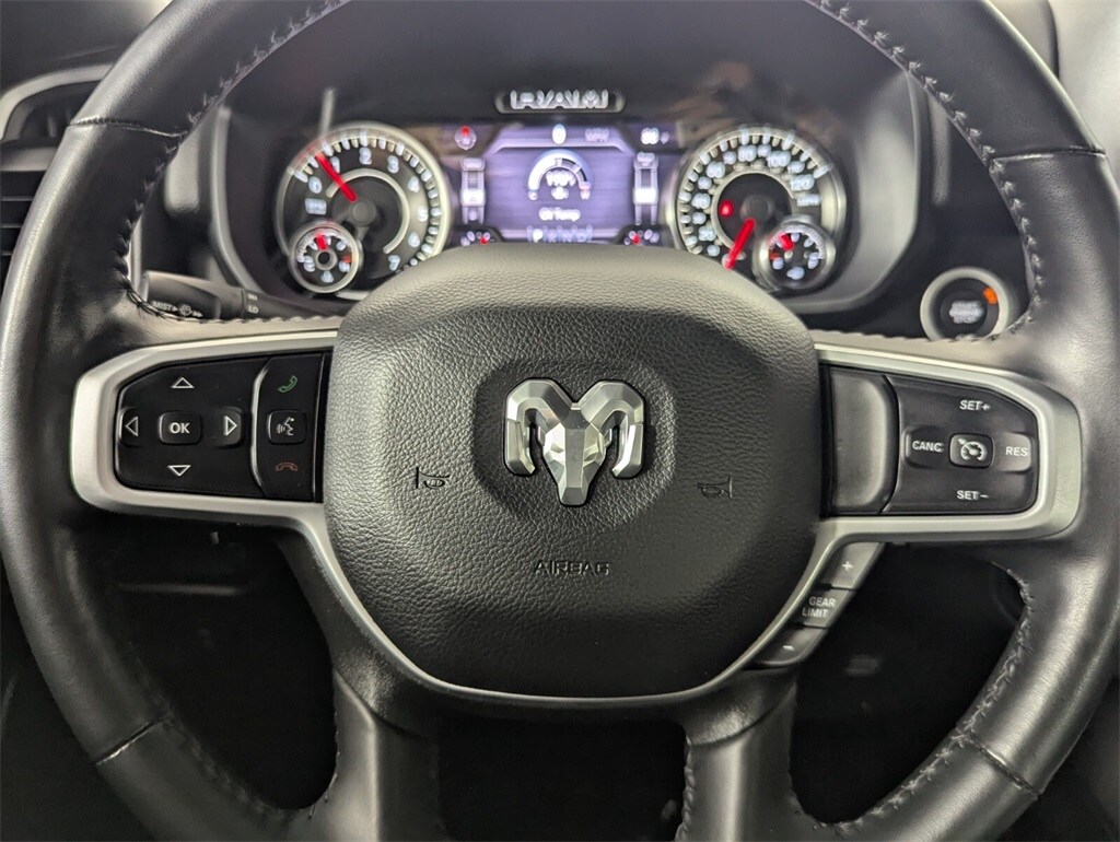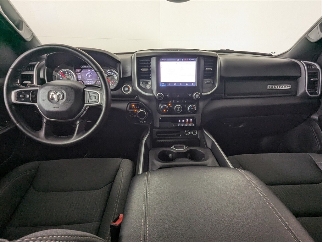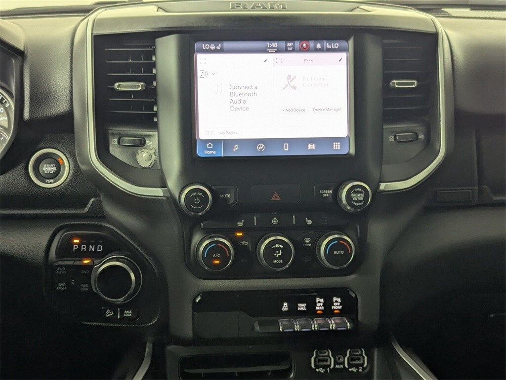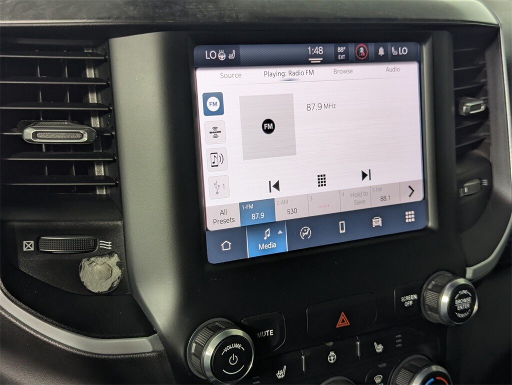 This 1500 is well equipped with Bed Utility Group (MOPAR Spray In Bedliner and Pick-Up Box Lighting), Big Horn Level B Equipment Group (DISC) (115V Auxiliary Power Outlet, 115V Auxiliary Rear Power Outlet, 2nd Row In Floor Storage Bins, 400W Inverter, 4G LTE Wi-Fi Hot Spot, 8.4" Touchscreen Display, Air Conditioning ATC w/Dual Zone Control, Apple CarPlay, Auto-Dimming Exterior Driver Mirror, Auto-Dimming Rear-View Mirror, Black Premium Power Mirrors (GUL), Bluetooth Handsfree Phone & Audio, Class IV Receiver Hitch, Cluster 7.0" TFT Color Display, Connectivity - US/Canada, Exterior Mirrors Courtesy Lamps, Exterior Mirrors w/Supplemental Signals, Foam Bottle Insert (Door Trim Panel), For More Info, Call 800-643-2112, Glove Box Lamp, Google Android Auto, Heated Front Seats, Heated Steering Wheel, Integrated Center Stack Radio, Media Hub w/2 Charge Only USBs, ParkSense Front/Rear Park Assist w/Stop, Power 2-Way Driver Lumbar Adjust, Power 8-Way Driver Seat, Power Adjustable Pedals, Radio: Uconnect 5 W w/8.4" Display, Rear Dome w/On/Off Switch Lamp, Rear Power Sliding Window, Rear Window Defroster, Remote Start System, Security Alarm, SiriusXM Radio Service, SiriusXM Satellite Radio, Sun Visors w/Illuminated Vanity Mirrors, Universal Garage Door Opener, and USB Host Flip), Off Road Group (All Plant-Installed Decals, E-Locker Rear Axle, Front Extra HD Shock Absorbers, Hill Descent Control, Off Road Decals, Raised Ride Height, Rear Extra HD Shock Absorbers, and Tow Hooks), Quick Order Package 25Z Big Horn, FCA US LLC Certified Pre-Owned Certified, 3 Rear Seat Head Restraints, 3.21 Rear Axle Ratio, 4 Way Front Headrests, 4-Wheel Disc Brakes, 48V Belt Starter Generator, 6 Speakers, 9 Amplified Speakers w/Subwoofer, ABS brakes, Air Conditioning, Alloy wheels, AM/FM radio, Black Exterior Mirrors, Brake assist, Bumpers: chrome, Cloth Bench Seat, Compass, Convex Wide-Angle Mirror Insert, Delay-off headlights, Driver door bin, Dual front impact airbags, Dual front side impact airbags, Electronic Stability Control, Emergency communication system: SiriusXM Guardian, Front anti-roll bar, Front Center Armrest w/Storage, Front fog lights, Front reading lights, Front Seat Back Map Pockets, Front wheel independent suspension, Fully automatic headlights, Global Telematics Box Module (TBM), GPS Antenna Input, Heated door mirrors, Heavy-Duty Engine Cooling, Illuminated entry, Integrated Voice Command w/Bluetooth, Leather steering wheel, Low tire pressure warning, Manufacturer's Statement of Origin, MOPAR Front & Rear Rubber Floor Mats, Occupant sensing airbag, Outside temperature display, Overhead airbag, Overhead console, Panic alarm, ParkView Rear Back-Up Camera, Passenger door bin, Passenger vanity mirror, Power door mirrors, Power steering, Power windows, Radio data system, Radio: Uconnect 3 w/5" Display, Rear 60/40 Folding Seat, Rear anti-roll bar, Rear seat center armrest, Rear step bumper, Rear Underseat Compartment Storage (DISC), Remote keyless entry, Speed control, Split folding rear seat, Steering wheel mounted audio controls, Tachometer,