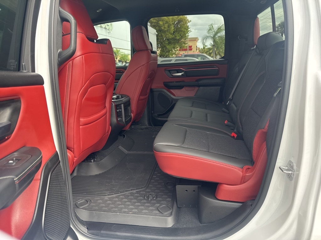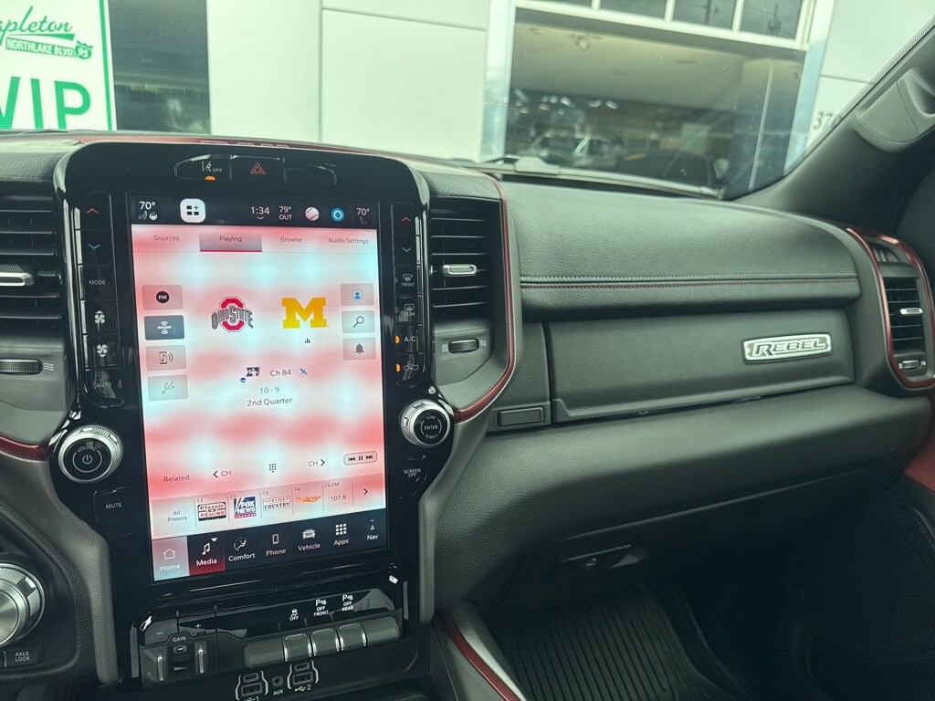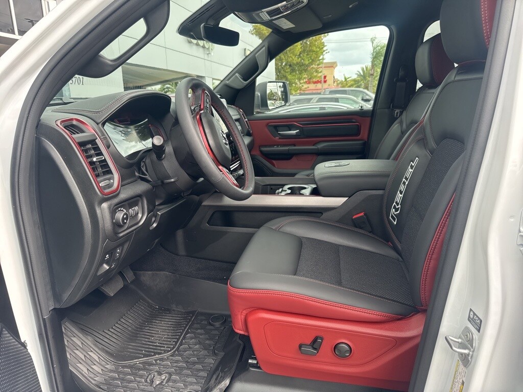 This 1500 is well equipped with Bed Utility Group (Exterior 115V AC Outlet, MOPAR 4 Adjustable Cargo Tie-Down Hooks, and MOPAR Spray in Bedliner), Quick Order Package 21W Rebel, Rebel Level 1 Equipment Group (Auto Power-Folding Mirrors, Auto-Dimming Exterior Driver Mirror, Black Exterior Mirrors, Black Premium Power Mirrors, Convex Wide-Angle Exterior Mirror Insert, Exterior Mirrors Courtesy Lamps, Exterior Mirrors with Heating Element, Exterior Mirrors with Supplemental Signals, Power Adjustable Pedals, Rear Window Defroster, Remote Tailgate Release, and Wireless Charging Pad), 10 Speakers, 3.92 Rear Axle Ratio, 4 Way Front Headrests, 4-Wheel Disc Brakes, 4G LTE Wi-Fi Hot Spot, ABS brakes, Active Noise Control System, Air Conditioning, Alloy wheels, AM/FM radio: SiriusXM with 360L, Apple CarPlay, Apple CarPlay/Android Auto, Auto High-beam Headlights, Auto-dimming Rear-View mirror, Automatic temperature control, Brake assist, Bucket Seats, Cloth/Vinyl Bucket Seats, Compass, Connected Travel and Traffic Services, Connectivity - US/Canada, Delay-off headlights, Disassociated Touchscreen Display, Driver door bin, Driver vanity mirror, Dual front impact airbags, Dual front side impact airbags, Electronic Stability Control, Front anti-roll bar, Front Bucket Seats, Front Center Armrest w/Storage, Front dual zone A/C, Front fog lights, Front reading lights, Front Seat Back Map Pockets, Front wheel independent suspension, Full Length Upgraded Floor Console, Fully automatic headlights, Garage door transmitter, Global Telematics Box Module, Google Android Auto, GPS Antenna Input, GPS Navigation, HD Radio, Heated door mirrors, Heated Front Seats, Heated front seats, Heated Steering Wheel, Heated steering wheel, Illuminated entry, Integrated Center Stack Radio, Integrated Voice Command with Bluetooth, Leather steering wheel, Low tire pressure warning, Manual Folding Exterior Mirrors, Mopar Black Tubular Side Steps, MyFlexCare Service Plan, Navigation System/ GPS, Occupant sensing airbag, Off-Road Information Pages, Outside temperature display, Overhead airbag, Overhead console, Panic alarm, ParkView Rear Back-Up Camera, Passenger door bin, Passenger vanity mirror, Power 2-Way Driver Lumbar Adjust, Power Adjust 8-Way Driver Seat, Power door mirrors, Power driver seat, Power steering, Power windows, Radio data system, Radio: Uconnect 5 Navigation with 12.0" Display, Rear 60/40 Folding Seat, Rear anti-roll bar, Rear seat center armrest, Rear step bumper, Remote keyless entry, SiriusXM Radio Service, SiriusXM with 360L, Speed control, Split folding rear seat, Steering wheel mounted audio controls, Tachometer, Telescoping steering wheel, Tilt steering wheel, Traction control, Trailer Brake Control, Trip computer, USB Host Flip, Variably intermittent wipers, Voltmeter, and Wheels: 18" x 8.0" Painted Mid-Gloss Black.