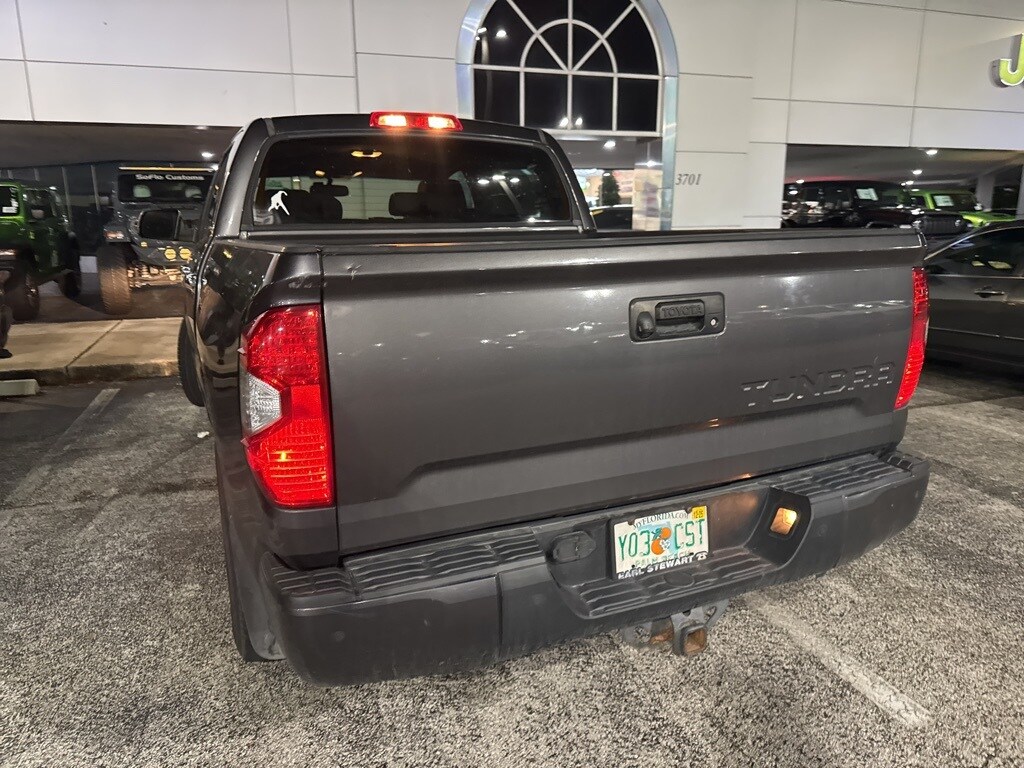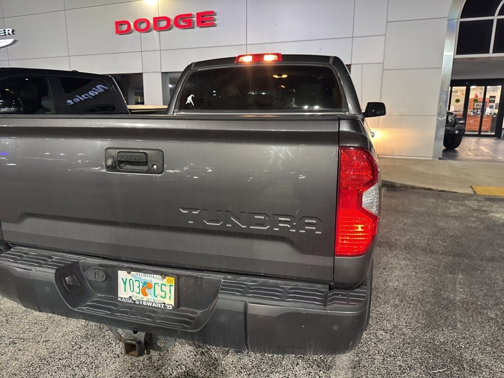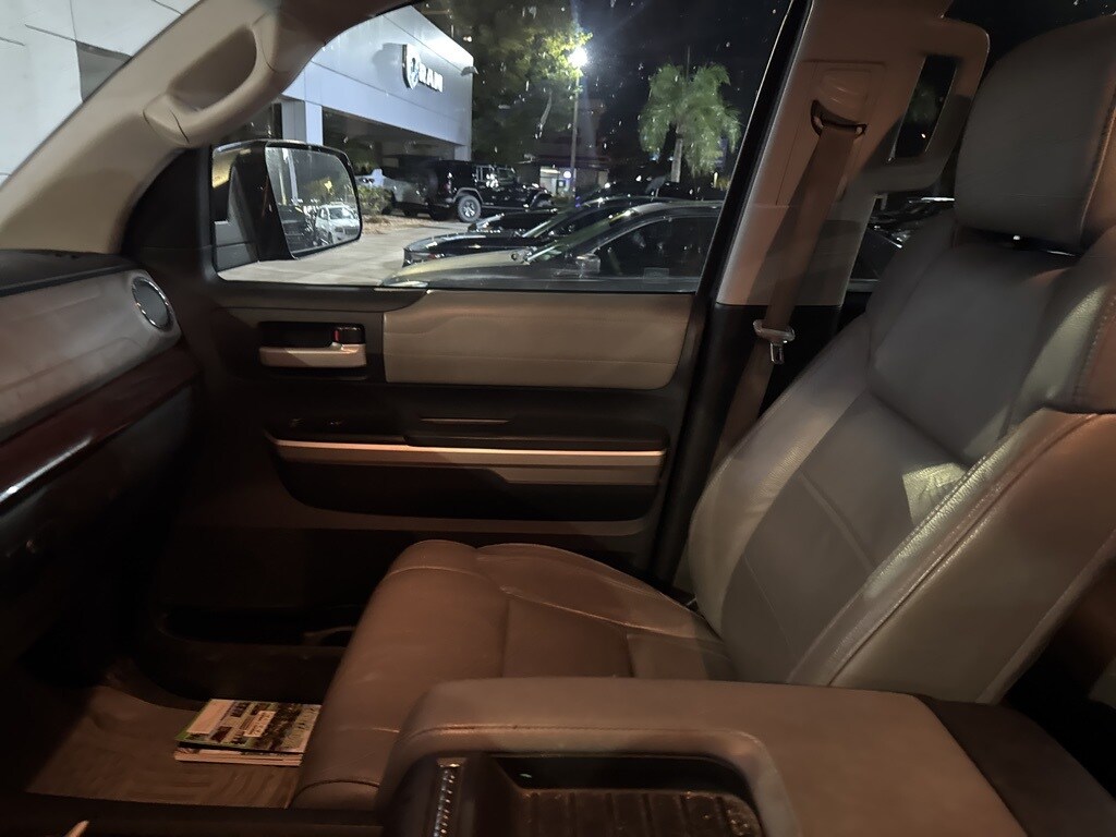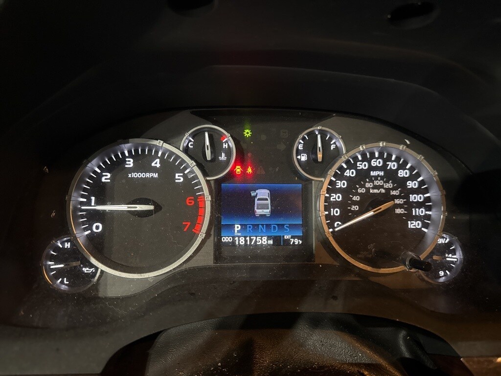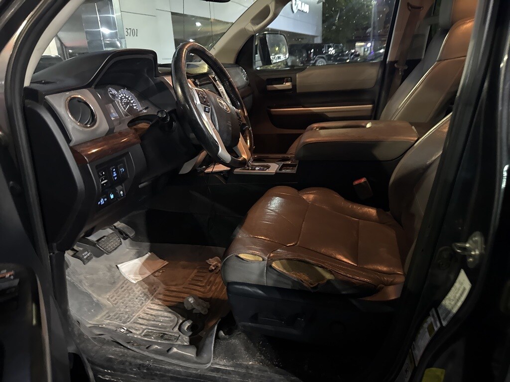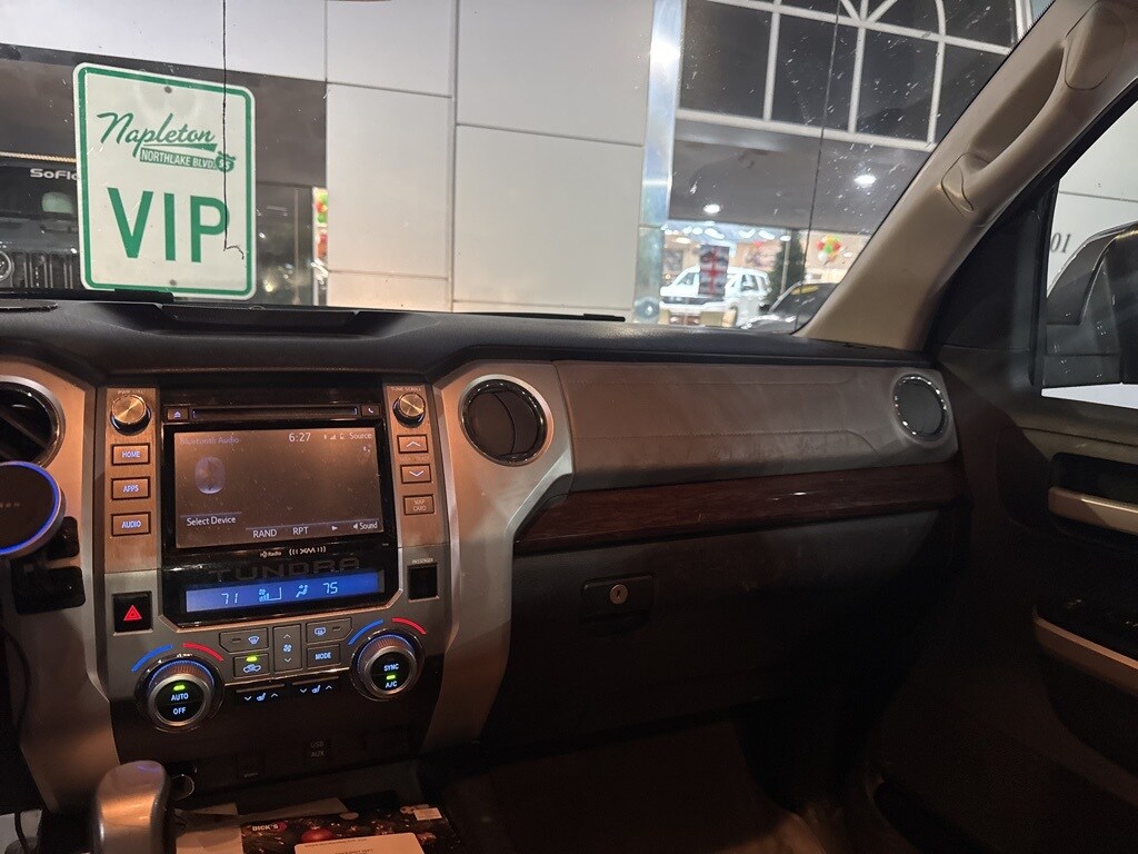 This Tundra is well equipped with Leather, 4-Wheel Disc Brakes, 4.30 Axle Ratio, ABS brakes, Air Conditioning, AM/FM radio: SiriusXM, Brake assist, CD player, Driver door bin, Driver vanity mirror, Dual front impact airbags, Dual front side impact airbags, Electronic Stability Control, Exterior Parking Camera Rear, Front anti-roll bar, Front fog lights, Front reading lights, Front wheel independent suspension, Heated door mirrors, Illuminated entry, Knee airbag, Low tire pressure warning, Occupant sensing airbag, Outside temperature display, Overhead airbag, Overhead console, Panic alarm, Passenger door bin, Passenger vanity mirror, Power door mirrors, Power steering, Power windows, Rear reading lights, Rear seat center armrest, Rear step bumper, Rear window defroster, Remote keyless entry, SIRIUSXM Satellite Radio, Speed control, Speed-sensing steering, Split folding rear seat, Tachometer, Tilt steering wheel, Traction control, Trip computer, Variably intermittent wipers, and Voltmeter.