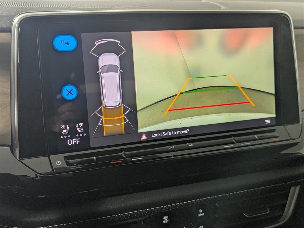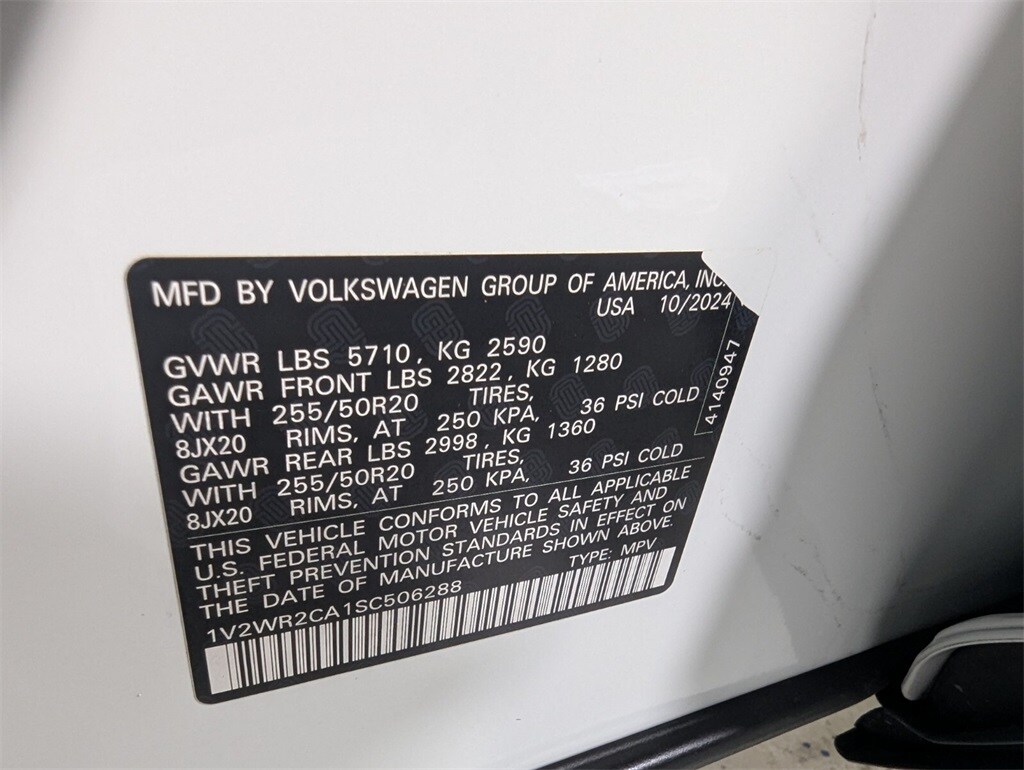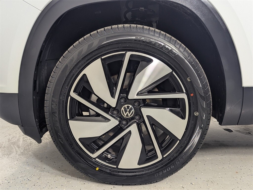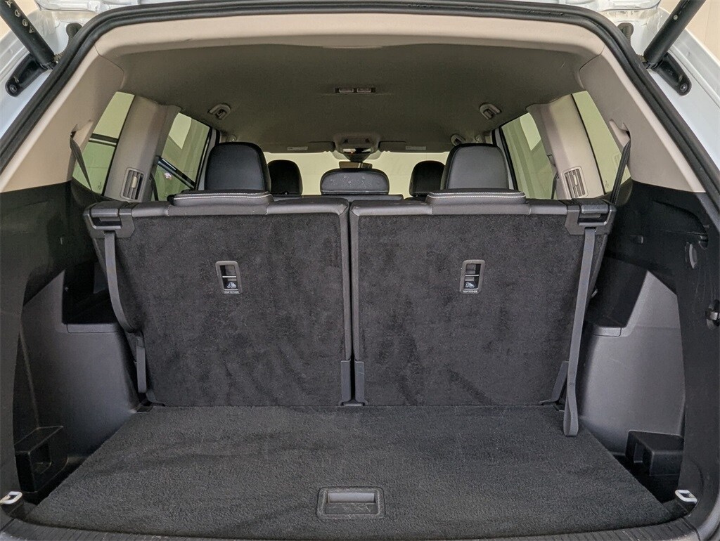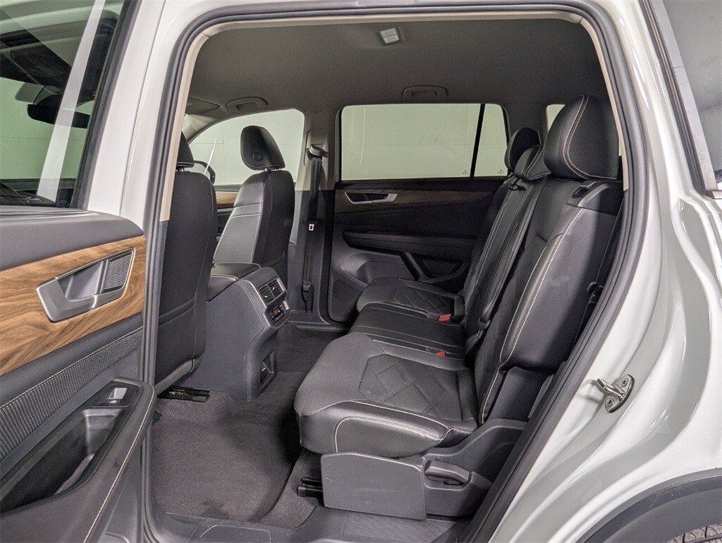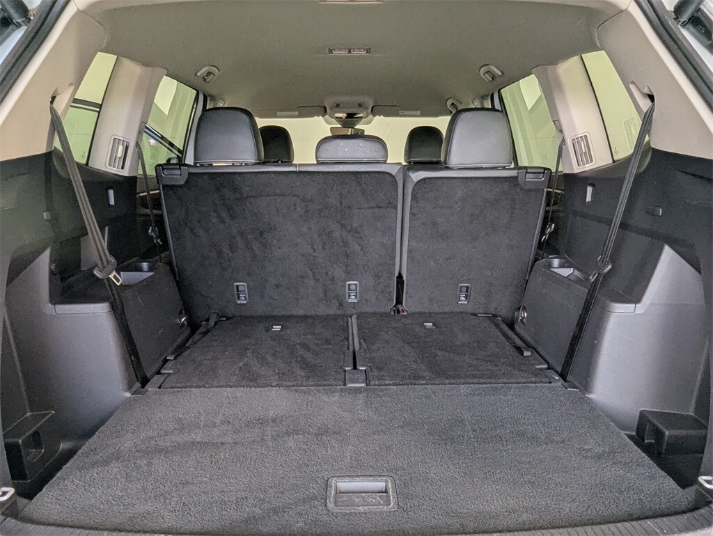 Features: 20" 2-tone machined alloy wheels, 3rd row seats: split-bench, 4-Wheel Disc Brakes, 6 Speakers, ABS brakes, Air Conditioning, Alloy wheels, AM/FM radio: SiriusXM with 360L, Auto High-beam Headlights, Auto-dimming Rear-View mirror, Automatic temperature control, Brake assist, Bumpers: body-color, Compass, Delay-off headlights, Driver door bin, Driver vanity mirror, Dual front impact airbags, Dual front side impact airbags, Electronic Stability Control, Emergency communication system: VW Car-Net Safe & Secure 5-year, Exterior Parking Camera Rear, Four wheel independent suspension, four-wheel independent suspension, Front anti-roll bar, Front Bucket Seats, Front Center Armrest, Front dual zone A/C, Front fog lights, Front reading lights, Fully automatic headlights, heated and Actively ventilated front bucket seats, Heated door mirrors, Heated front seats, Heated steering wheel, Illuminated entry, Low tire pressure warning, MIB3 composition media radio, Occupant sensing airbag, Outside temperature display, Overhead airbag, Overhead console, Panic alarm, Passenger door bin, Passenger vanity mirror, perforated V-Tex leatherette seating surfaces, Power door mirrors, Power driver seat, Power Liftgate, Power steering, Power windows, Radio data system, Rain sensing wipers, Rear air conditioning, Rear anti-roll bar, Rear reading lights, Rear seat center armrest, Rear window defroster, Rear window wiper, Remote keyless entry, Security system, Speed control, Speed-sensing steering, Split folding rear seat, Spoiler, Steering wheel mounted audio controls, Tachometer, Telescoping steering wheel, Tilt steering wheel, Traction control, Trip computer, Turn signal indicator mirrors, Variably intermittent wipers, and Ventilated front seats.